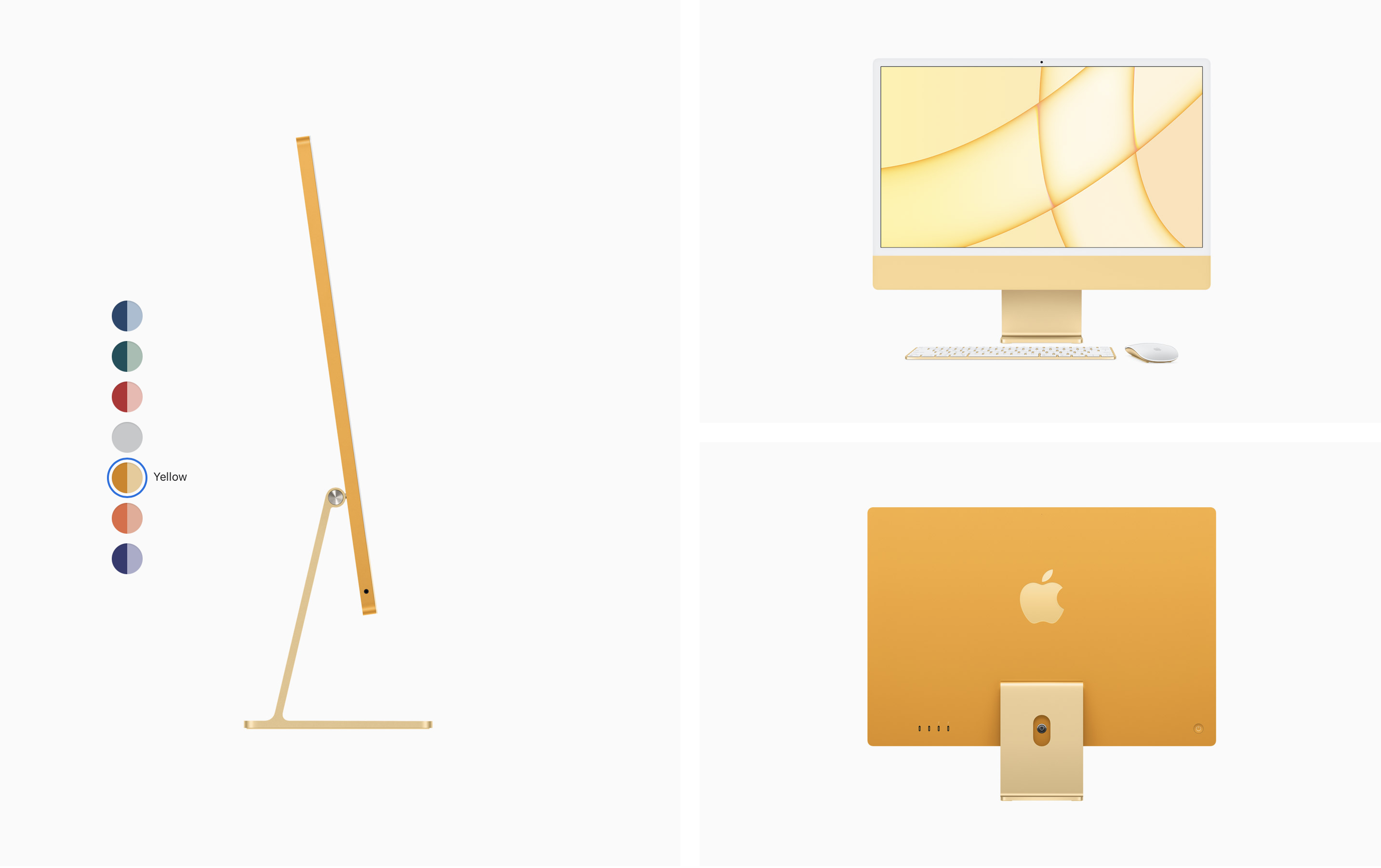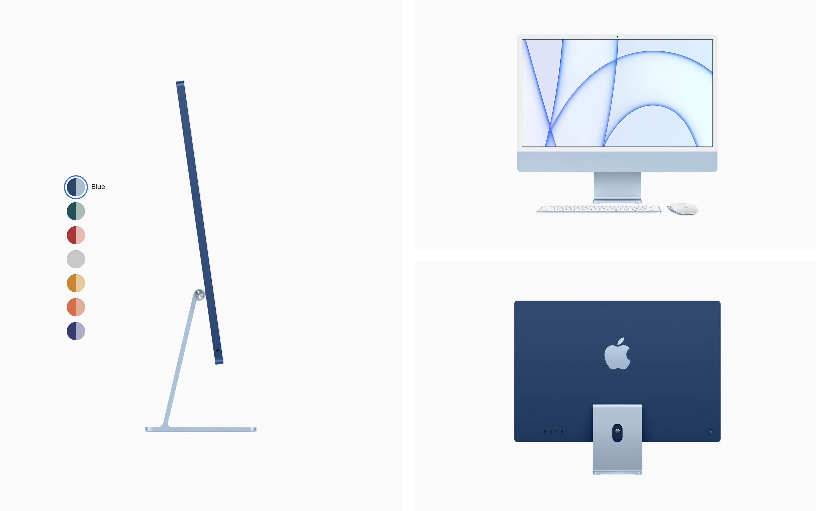 색들이 대체로 원색 위주의 강렬한 색상이라 호불호가 갈리겠지만, 얇은 베젤과 미니멀한 디자인, 강렬한 색상 때문에 전보다 더 캐주얼해진 느낌이 듭니다. 이번 발표를 보면서 애플이 아이맥 24인치를 현재 아이패드 에어, 아이폰 12 시리즈와 같은 스탠다드 라인업으로 가져가면서 더 큰 아이맥(32인치로 예상)은 아이패드 프로, 아이폰 12 프로 시리즈와 같은 하이엔드 모델로 양분하려는 게 아닐까 싶은 생각이 들었습니다. 경쾌한 컬러로 대중적인 호감도와 인지도를 높이면서요.