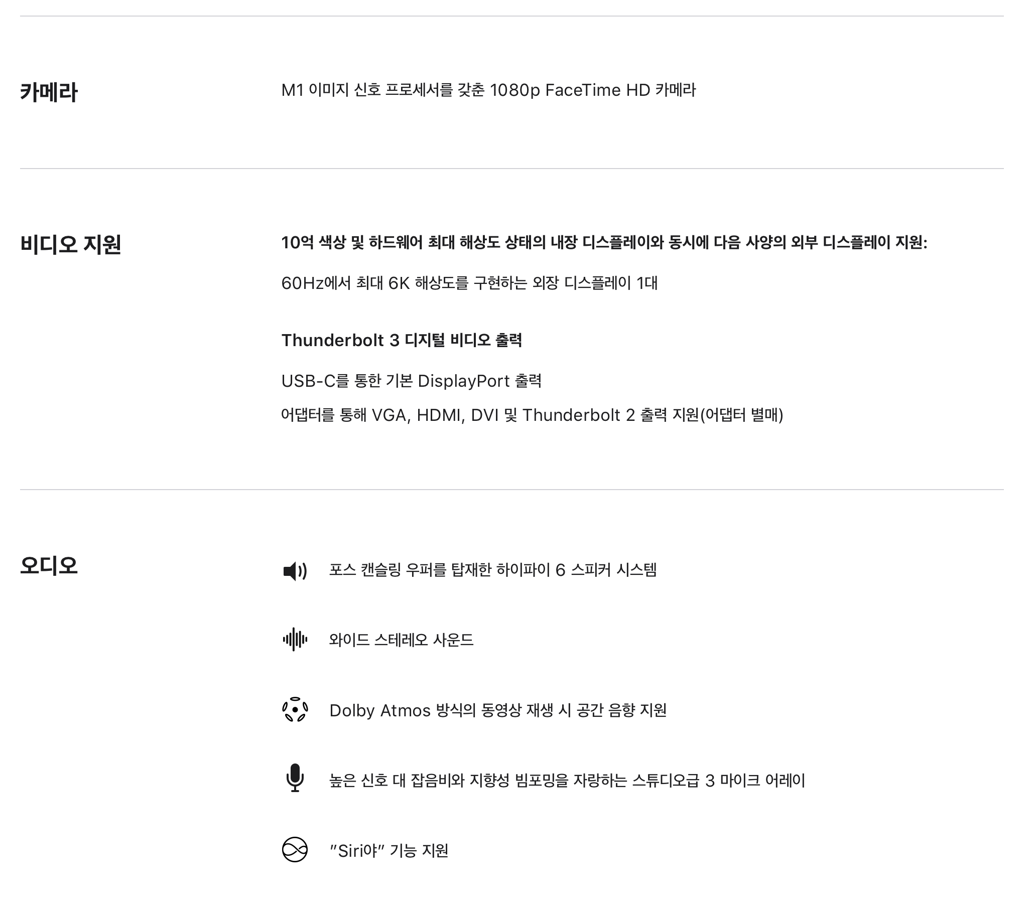 발표 중 개인적으로 맘에 든 것은 새롭게 디자인 된 스피커 구조. 유독 애플이 하드웨어 내장 스피커의 성능에 집착한다는 느낌을 받습니다. 이번 아이맥 24의 스피커 역시 6 스피커 사운드 시스템으로 이름 붙여진 새로운 구조로 현재까지의 맥 제품 중 최고의 성능을 보인다고 발표됐습니다. 아이맥만으로도 Dolby Atmos 공간 음향을 즐길 수 있다는 설명에 궁금증이 생겼습니다. 현재 사용하고 있는 아이맥 5K 모델에서 가장 만족하는 것 중 하나가 스피커거든요.