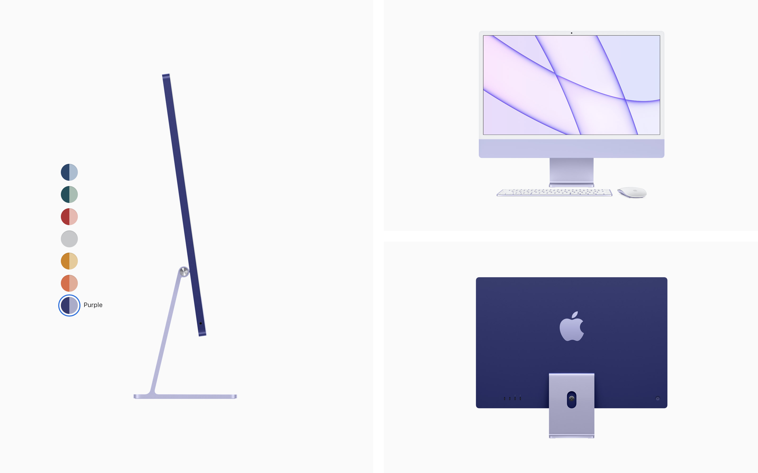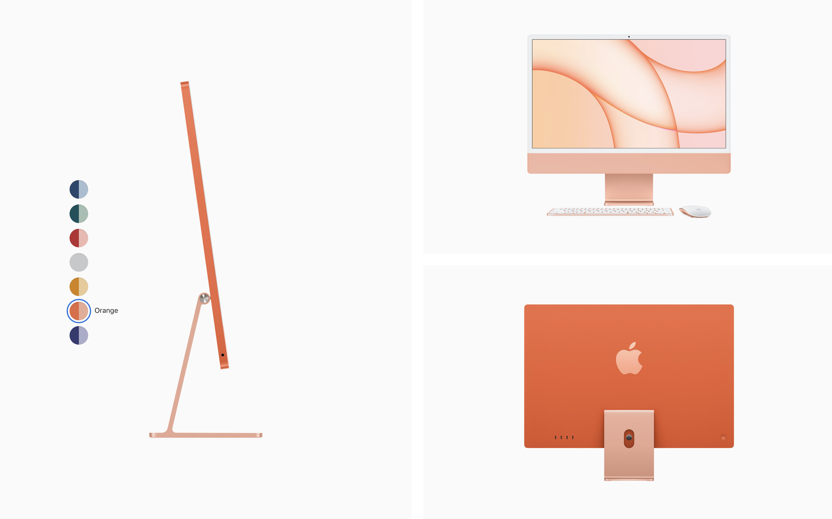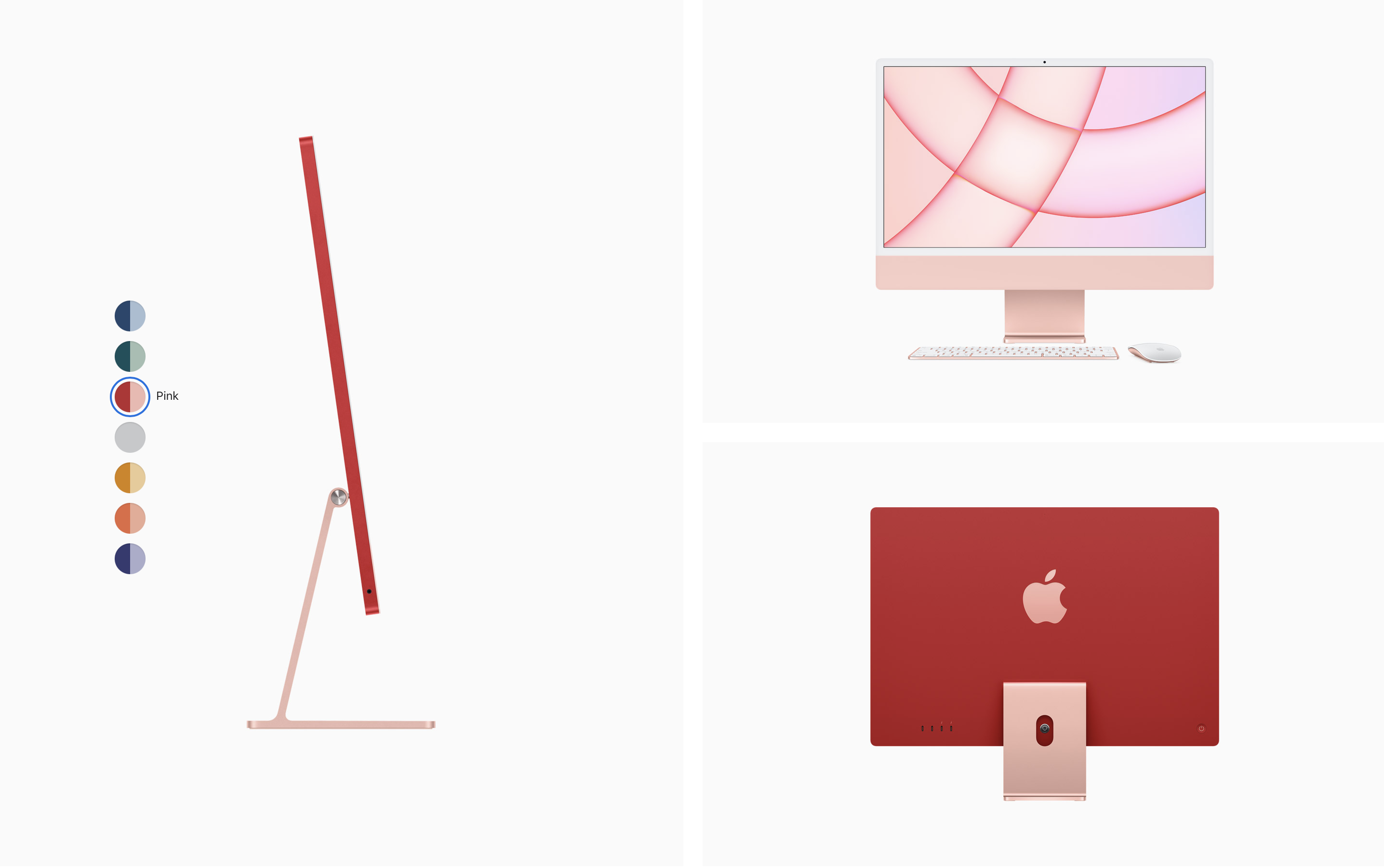 색들이 대체로 원색 위주의 강렬한 색상이라 호불호가 갈리겠지만, 얇은 베젤과 미니멀한 디자인, 강렬한 색상 때문에 전보다 더 캐주얼해진 느낌이 듭니다. 이번 발표를 보면서 애플이 아이맥 24인치를 현재 아이패드 에어, 아이폰 12 시리즈와 같은 스탠다드 라인업으로 가져가면서 더 큰 아이맥(32인치로 예상)은 아이패드 프로, 아이폰 12 프로 시리즈와 같은 하이엔드 모델로 양분하려는 게 아닐까 싶은 생각이 들었습니다. 경쾌한 컬러로 대중적인 호감도와 인지도를 높이면서요.