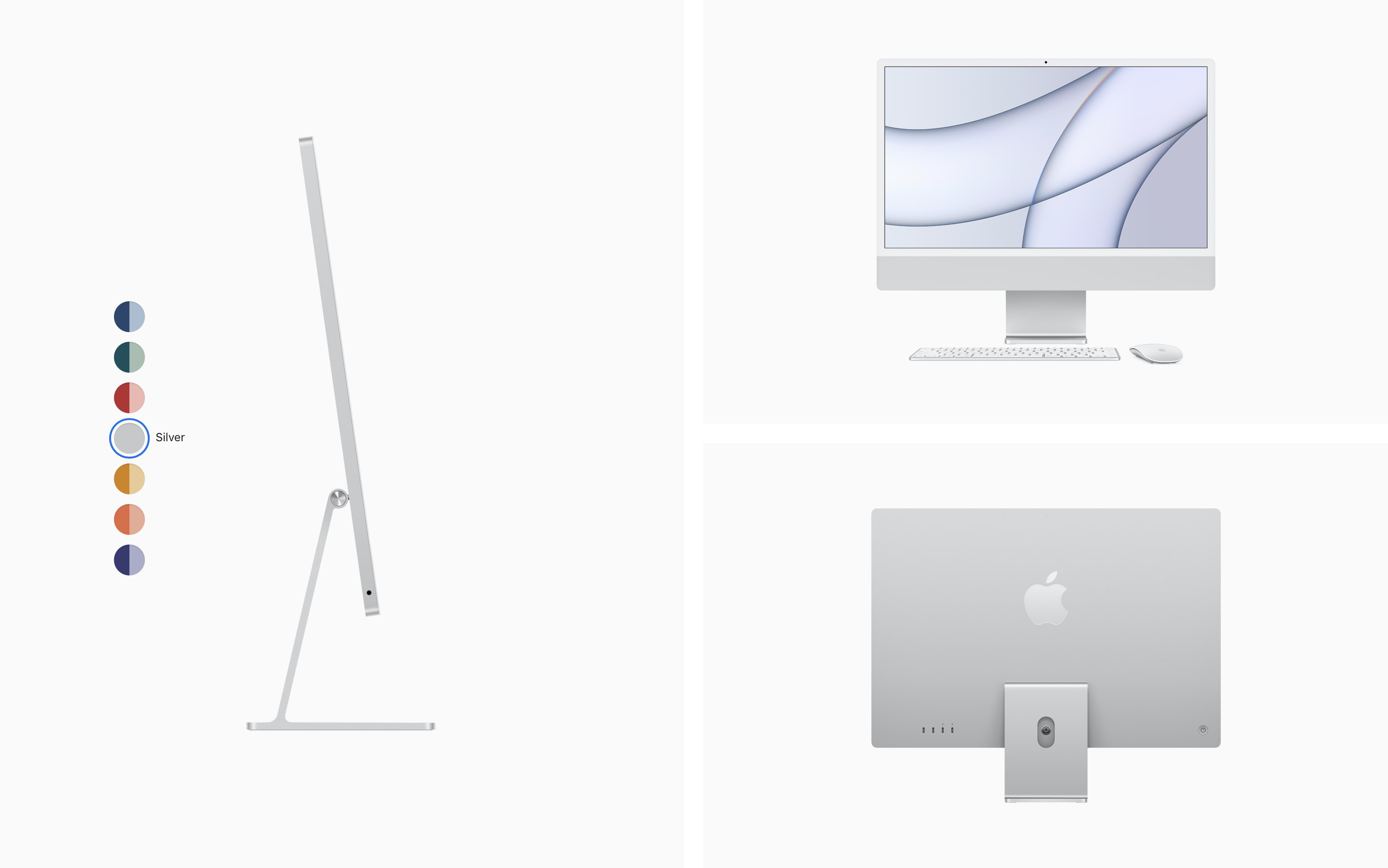 새로운 iMac. 화사한 7가지 컬러. 믿을 수 없을 만큼 얇은 디자인. 24형 4.5K Retina 디스플레이. Mac 사상 가장 뛰어난 카메라, 마이크, 스피커. 막강한 성능의 M1 탑재.