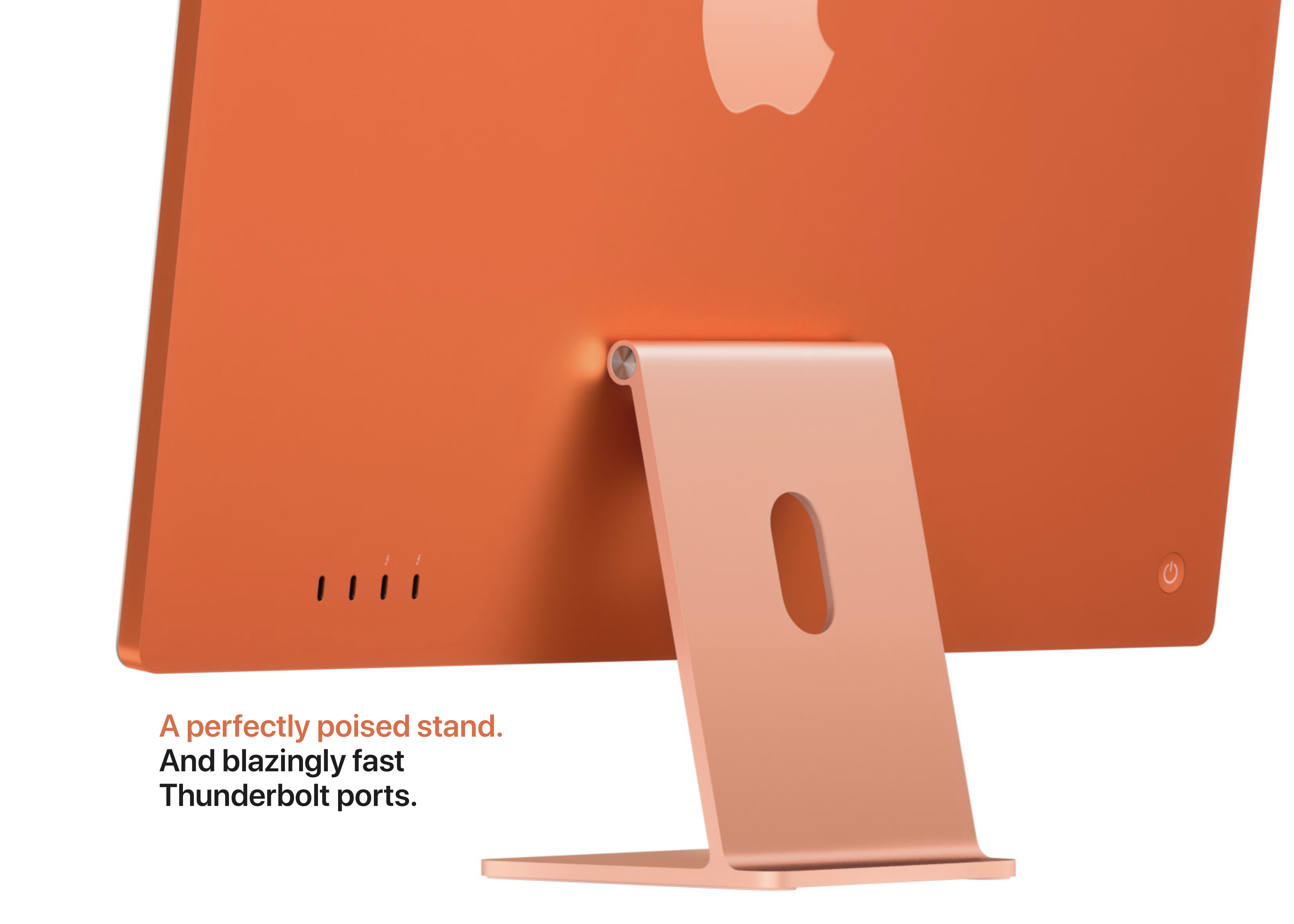 통합 칩인 M1칩 탑재로 로직 보드의 크기가 작아지고 저전력 코어의 성능에 맞춰 쿨링 시스템까지 간소화할 수 있게 되면서 본체의 두께를 드라마틱하게 줄일 수 있게 됐습니다. 본체 두께가 11.5mm로 아이폰 12의 두께인 7.4mm의 두 배가 채 되지 않습니다. 커다란 아이패드를 스탠드에 결합한 것 같다고 생각할 만 하죠. 기존 아이맥이 모서리쪽으로 갈 수록 두께가 얇아지는 디자인으로 시각적으로 얇아보이게 했다면 이번 아이맥은 마치 아이패드의 크기를 키운 것처럼 돌출 없이 평평한 디자인이 됐습니다.