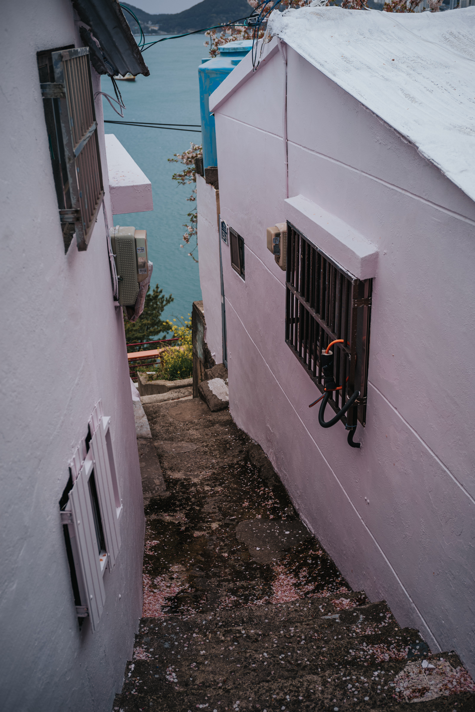 벚꽃이 다 떨어지기 전이라 바닷가 큰 나무에 가득 매달려 있거나 이미 떨어져 바닥을 물들인 분홍빛 꽃잎들이 마을 풍경을 예쁘게 단장해 놓았더군요. 버스 정류장에서 마을 산책로를 향해 내려가는 길에 본 분홍색 벽 사이 벚꽃이 떨어져 있는 풍경이 시작부터 맘을 설레게 했어요. 저 너머에 바다까지 보였으니까.