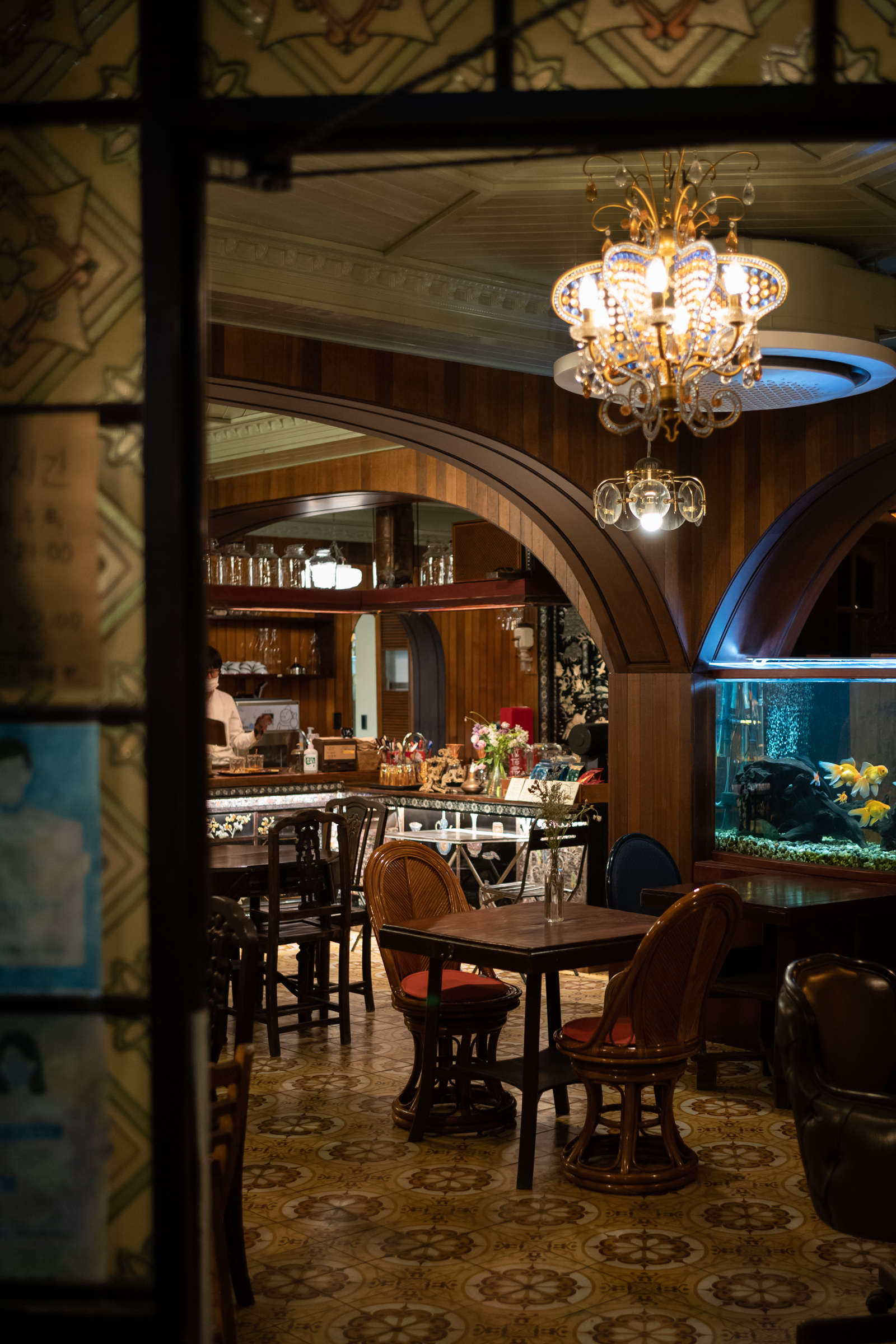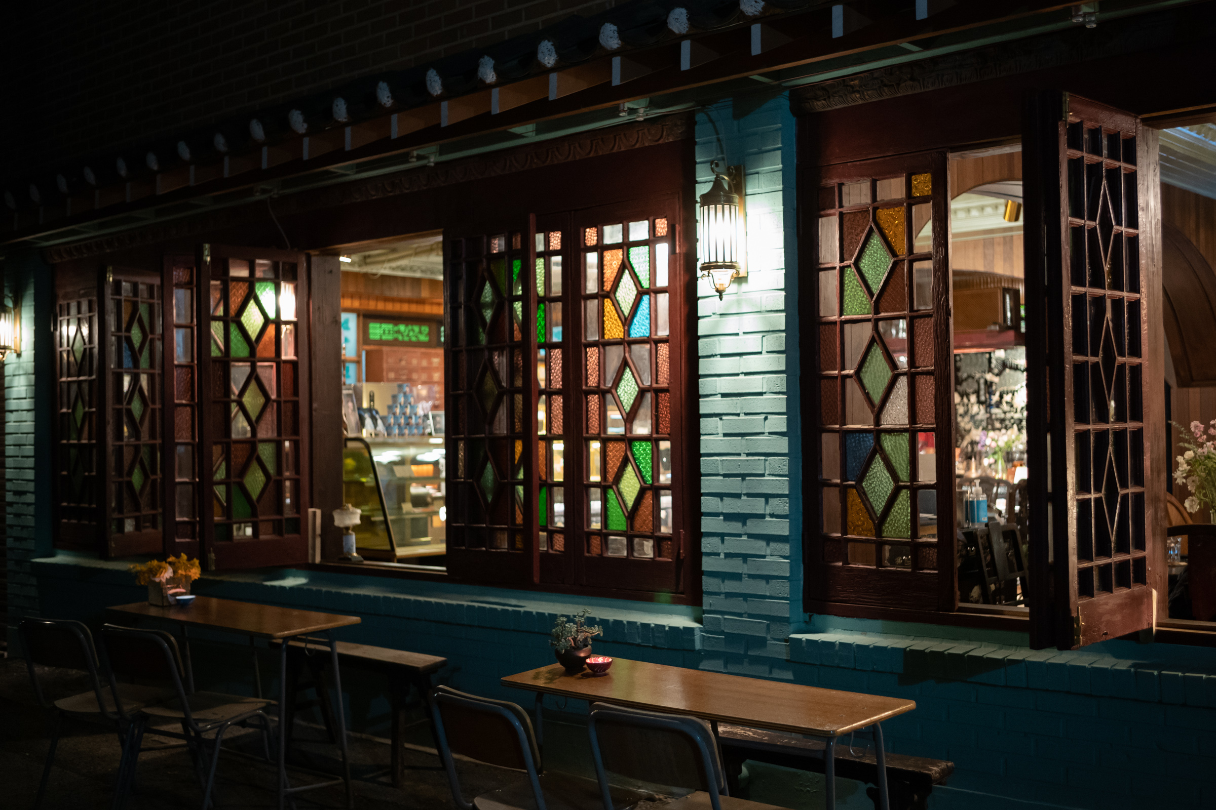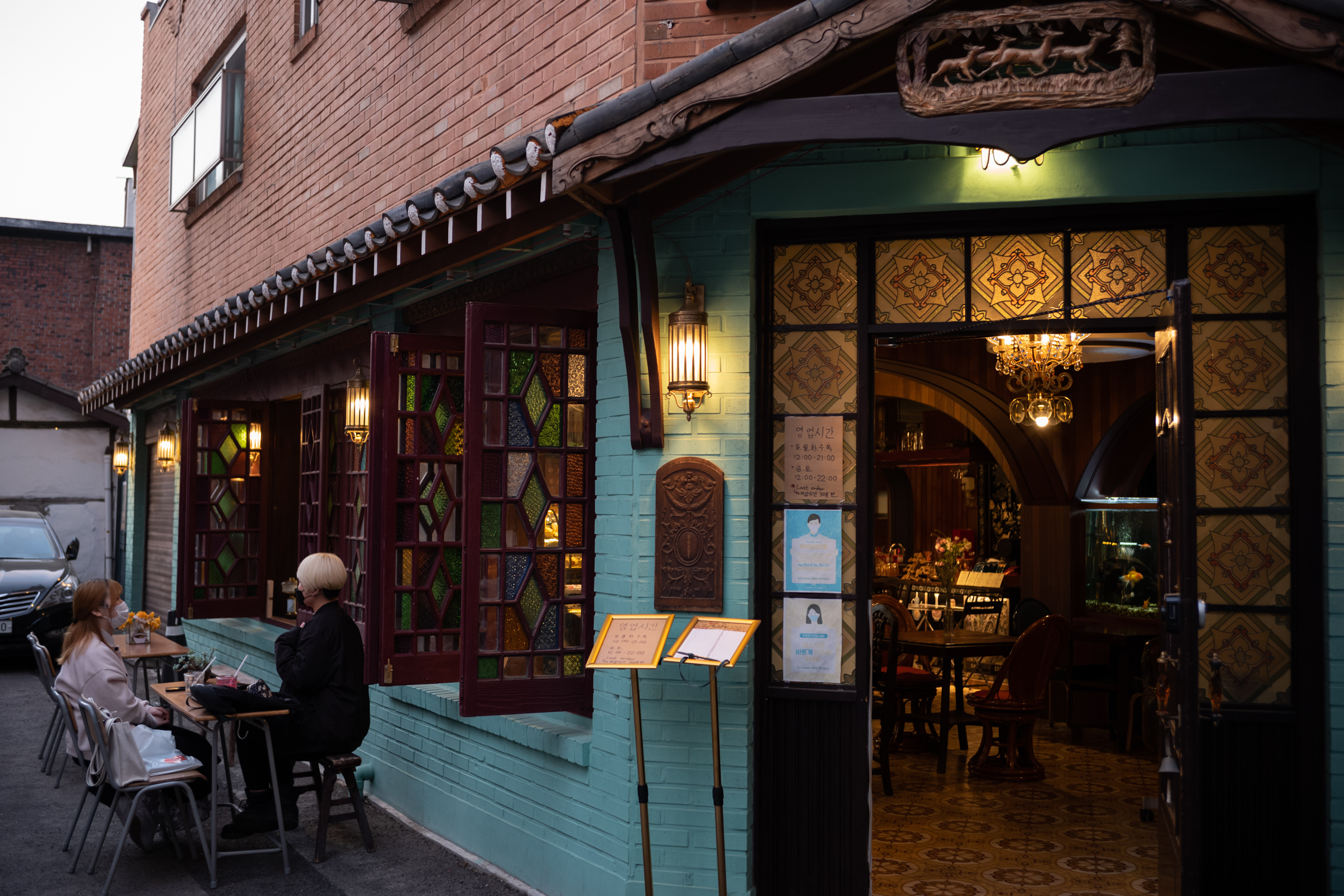 옛 한옥이나 궁궐에 있었을법한 문짝을 간판 자리에 붙여놓은 것만 봐도.