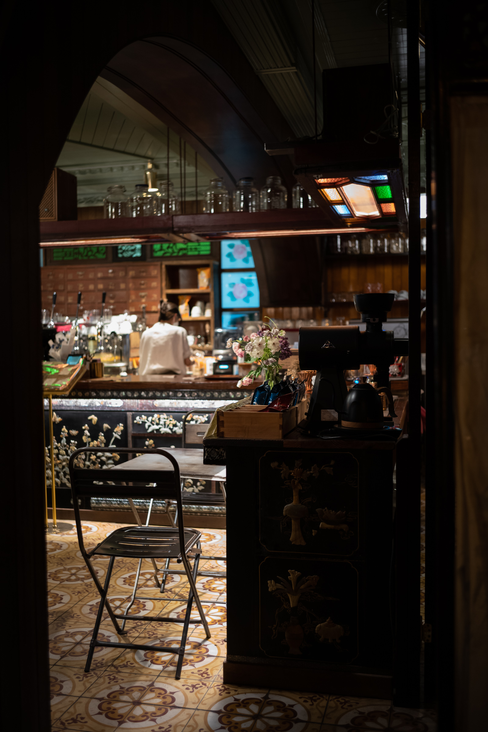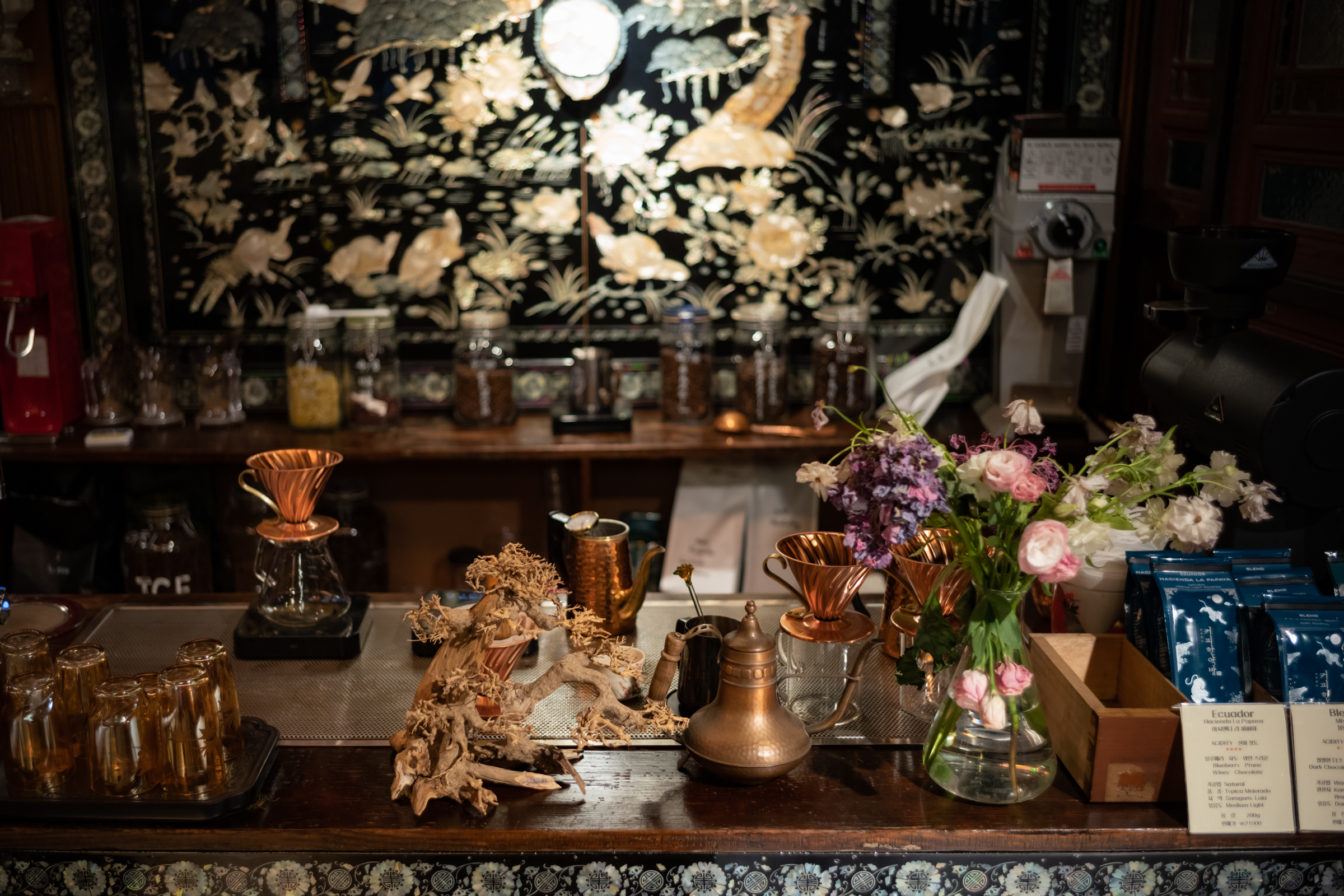 커피를 마시며 실내를 여유롭게 둘러봅니다. 어둑어둑한 실내는 크지 않지만 곳곳에 눈길 둘 만한 물건들이 많았고, 앉는 자리마다 분위기가 달라서 일어나 매장 내부를 둘러보기도 했습니다. 처음엔 이곳이 정말로 한약방으로 운영되던 곳일까 싶었는데, 2호점이니 아마도 본점의 컨셉을 이어가기 위해 가구와 소품들을 조달한 것이 아닐까 싶어요. 하지만 잠시나마 그런 생각을 했다는 것은 그만큼 한약방 컨셉 그리고 레트로 무드를 잘 살렸다는 말이겠죠.
