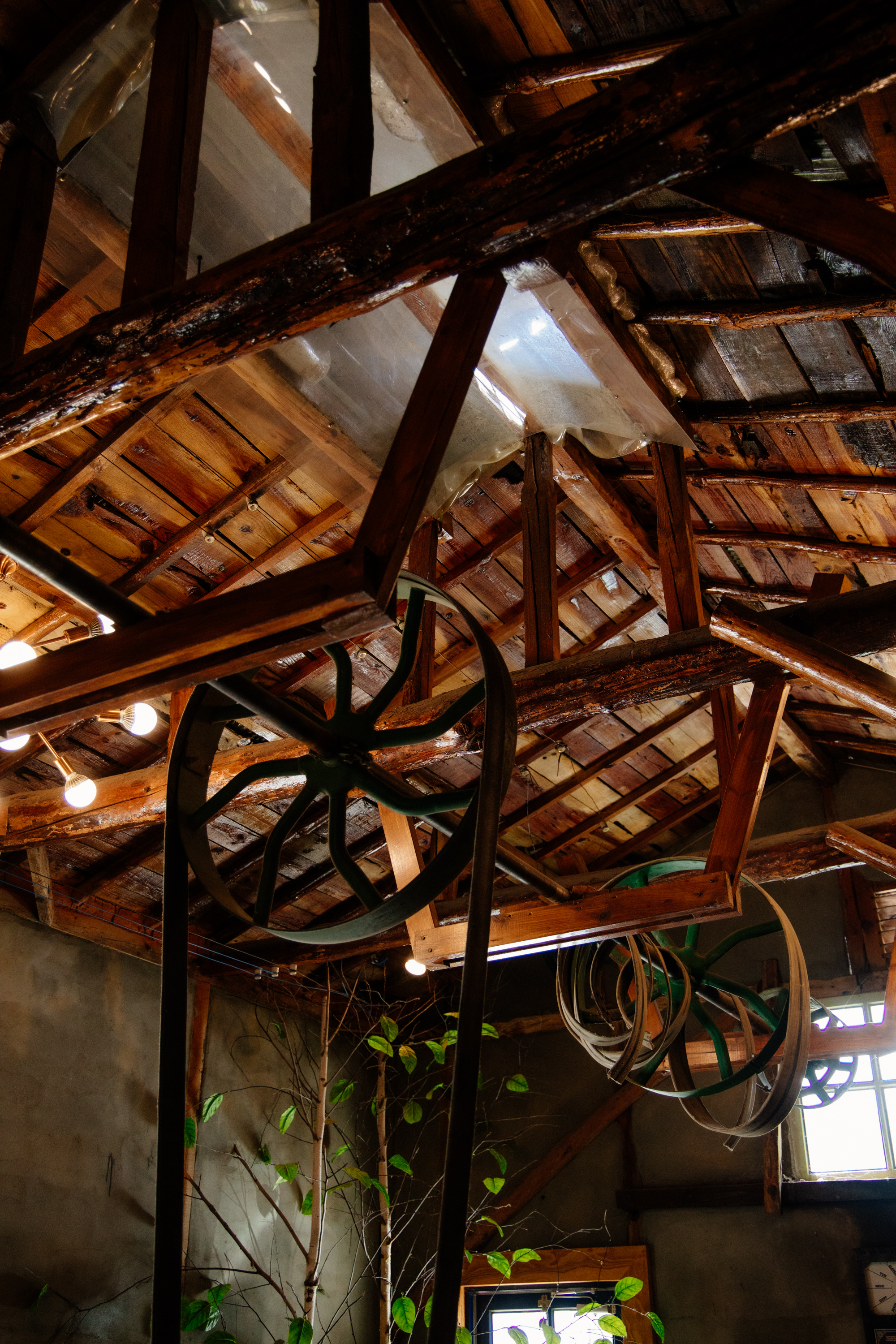 안쪽에 들어서면 창고를 개조한 작업실에 온 것만 같습니다. 천장이 무척 어지러운데 정미소 시절 사용했던 장비들을 활용한 것일까요.