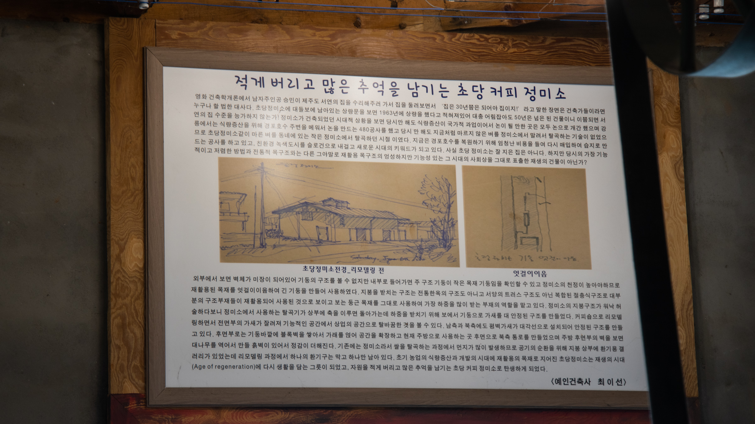 벽면에 붙어있는 액자에서 이 건물을 리모델링한 건축가의 설명을 읽을 수 있어요. 과거 식량 증진을 목적으로 세워지고 운영됐던 정미소 건물은 50년이 넘었다고 합니다. 재생의 시대에 맞춰 과거의 건물을 재활용한 이 건물이 자원은 적게 버리고 추억은 많이 남기는 곳이라는 말이 마음에 들었습니다.