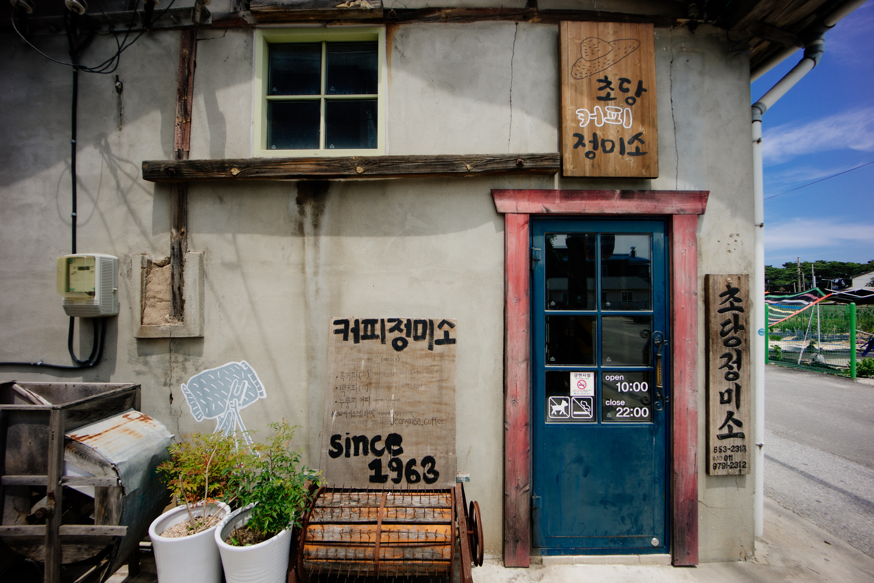 요즘은 노출 콘크리트를 활용해 실내를 꾸민 카페들이 많지만 이곳은 확실히 그런 곳과 다르겠죠. 실제로 정미소로 운영되던 곳이니 일부러 낸 오래된 분위기가 아닌 진짜 세월을 느낄 수 있습니다. 입구를 찾는 데 애먹었는데, 겉으로 길게 보이는 건물 바깥면은 창문만 있고 안쪽으로 돌아가야 작은 문이 있습니다. 입구도 참 소박합니다.