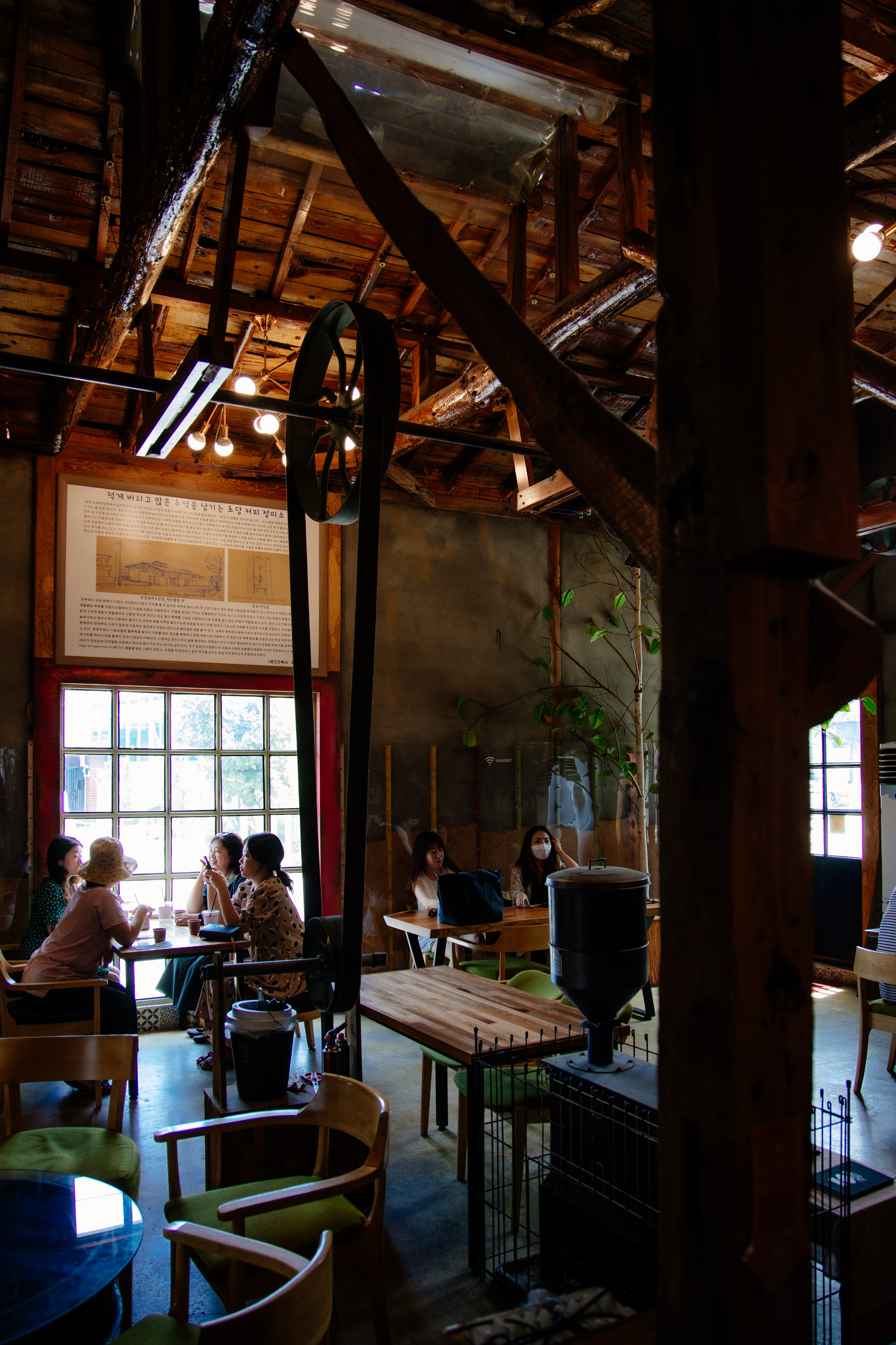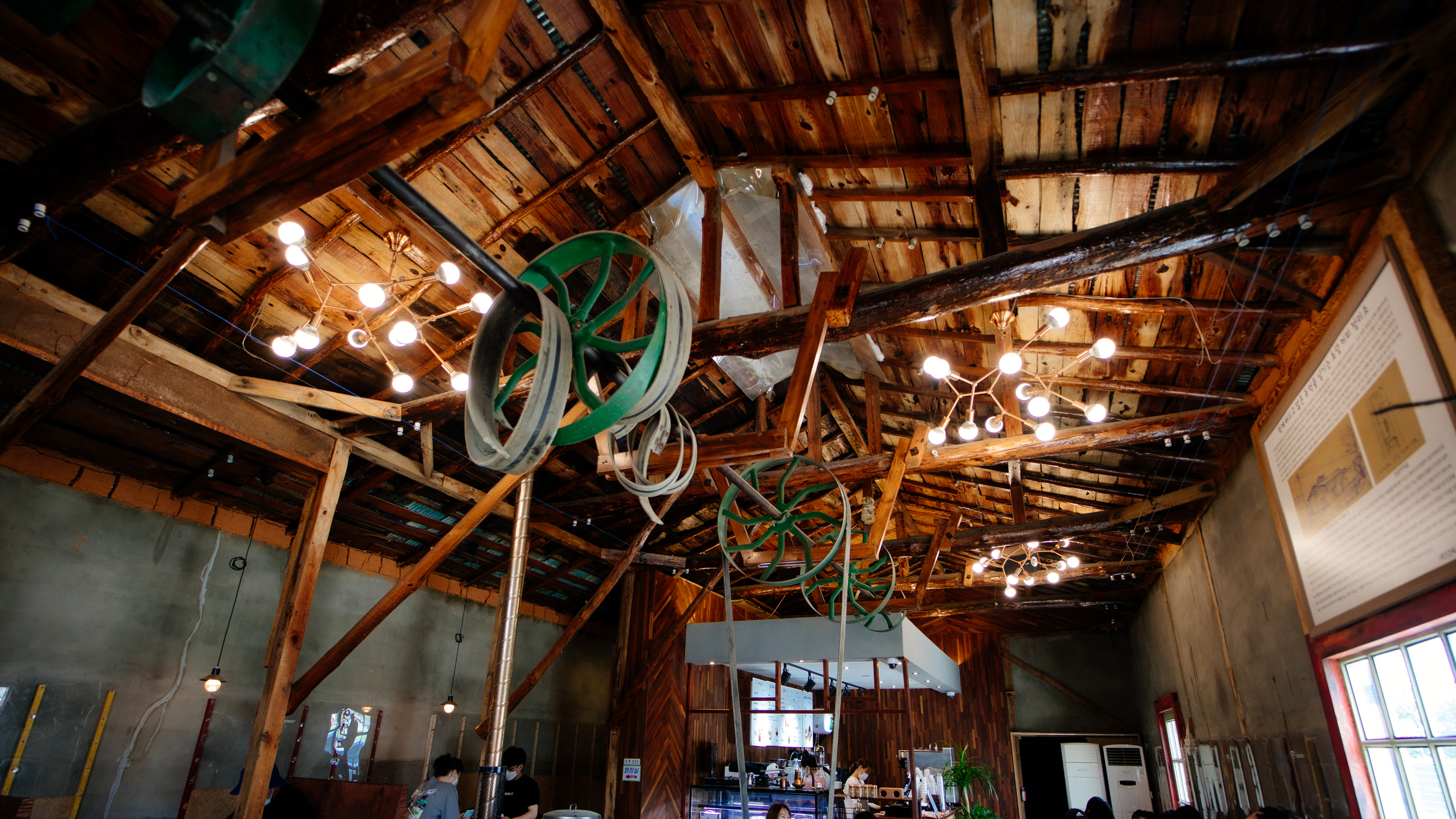 안쪽에 들어서면 창고를 개조한 작업실에 온 것만 같습니다. 천장이 무척 어지러운데 정미소 시절 사용했던 장비들을 활용한 것일까요.