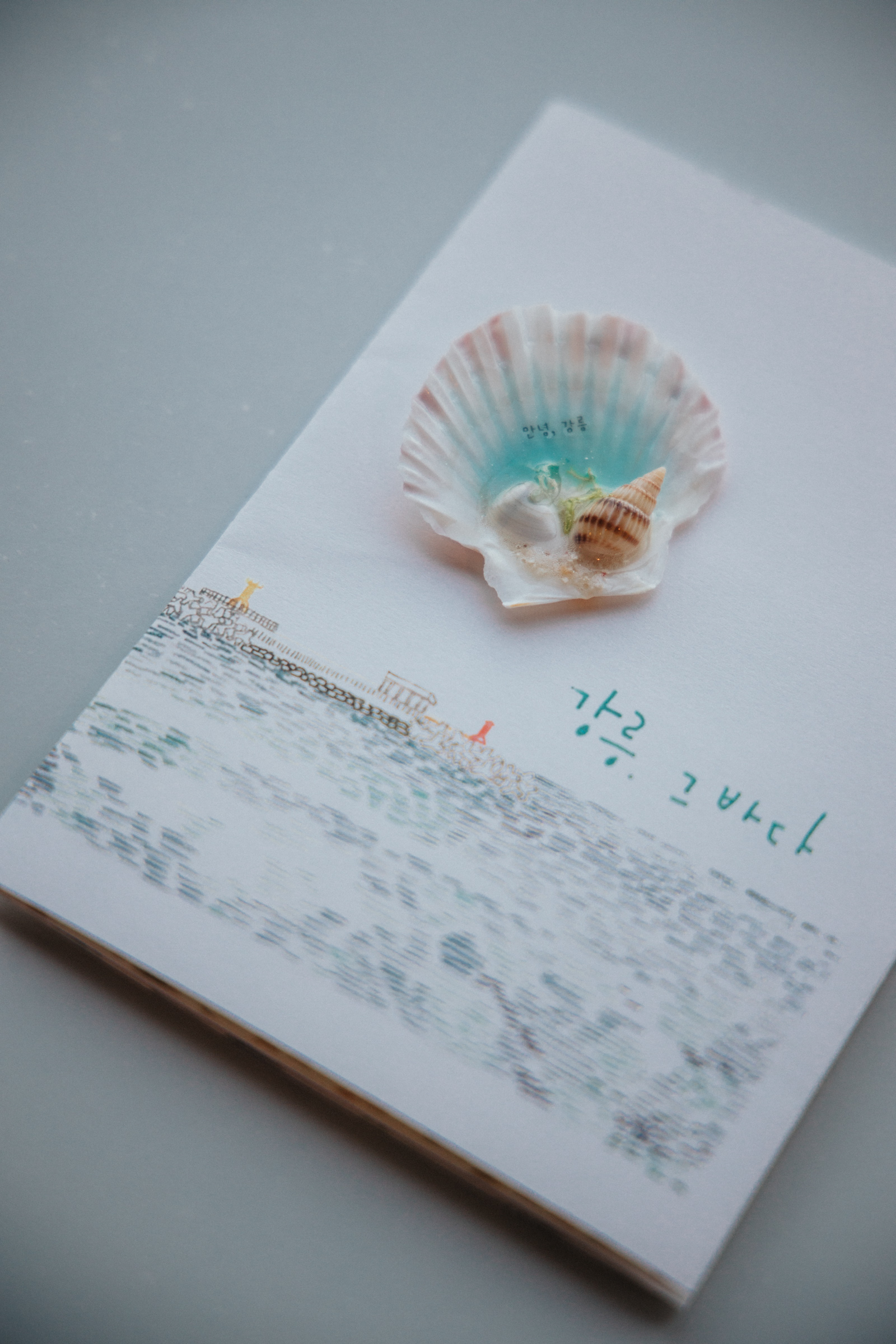 강릉 바다를 연상시키는 예쁜 그림에 실제 조개껍질을 붙여 만들었어요.