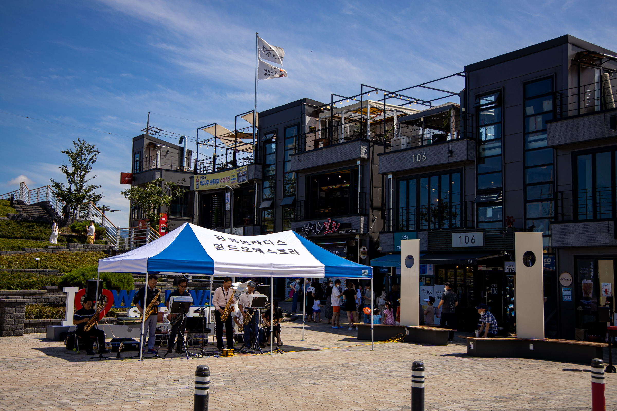 이 날 눈을 끌었던 것은 강릉 브라더스 윈드 오케스트라의 거리 공연. 지긋한 어르신들로 구성된 이 밴드는 색소폰으로 거리의 흥을 돋웠습니다. 그 뒤로 세워진 루프톱 카페에서 음악을 듣고 동네 풍경을 즐기면 좋았겠지만, 갈 길이 바빴던 관계로. 담에 오면 이 월화 거리를 좀 더 느껴보고 싶어요. 펍에서 맥주도 마시고, 루프톱 카페 옥상에서 노을도 보고. 근처에 유명한 강릉 육쪽마늘빵집이 있는데 시장 골목을 넘어서 월화거리까지 늘어선 줄이 그야말로 압도적이었습니다.