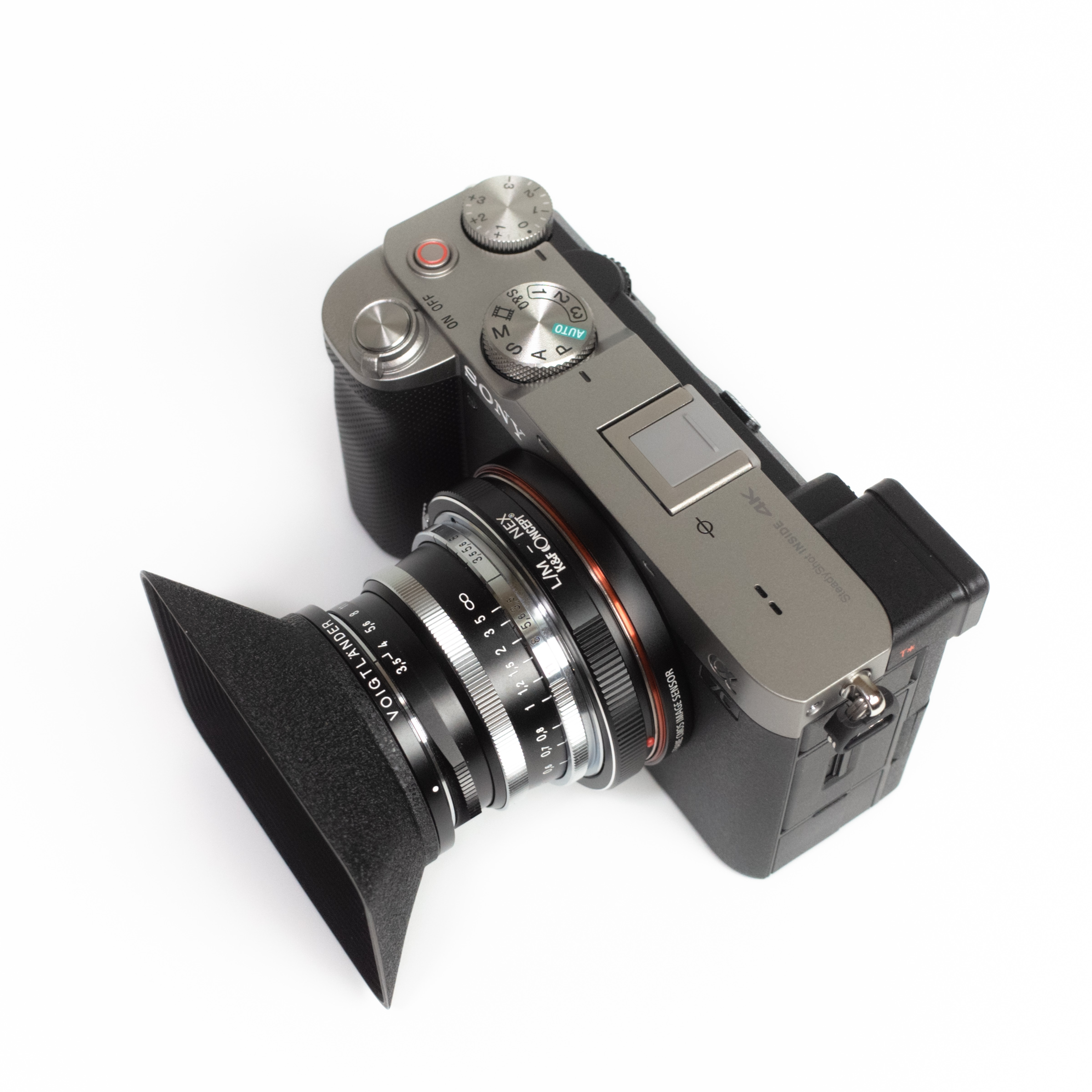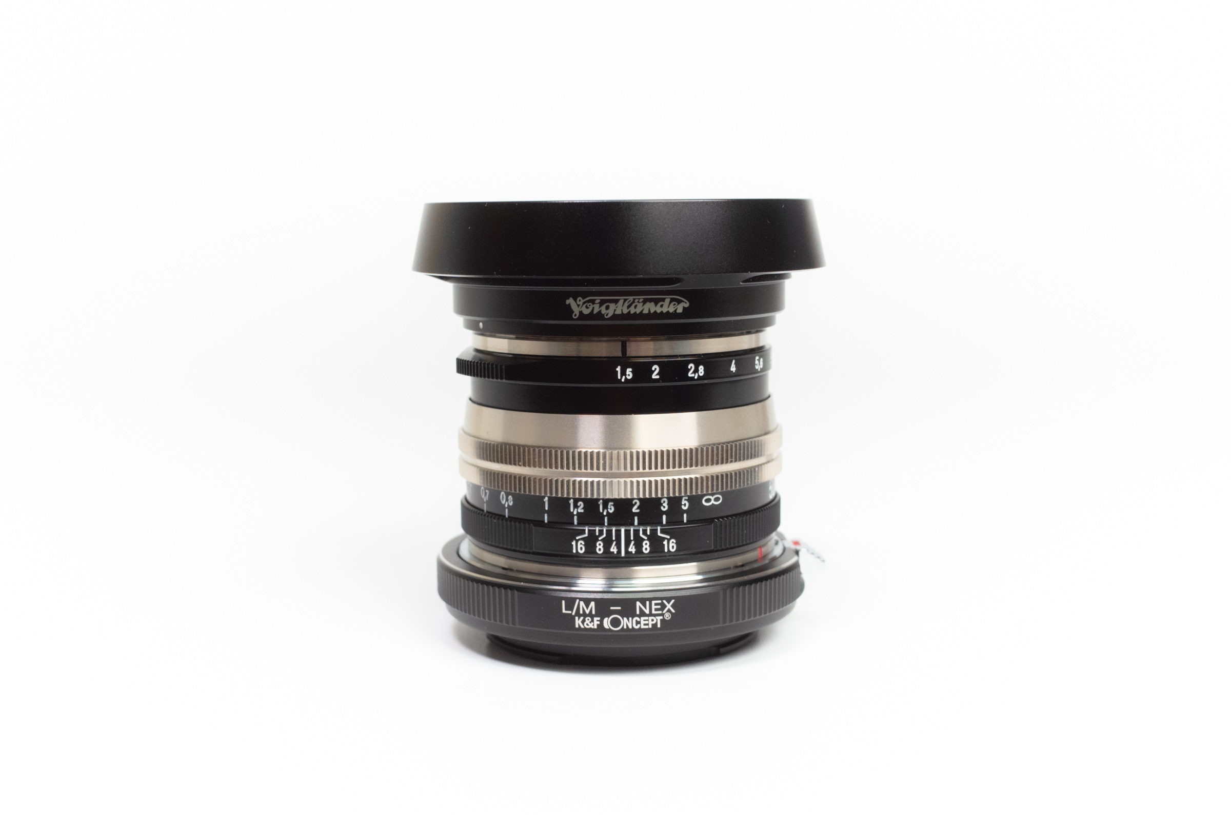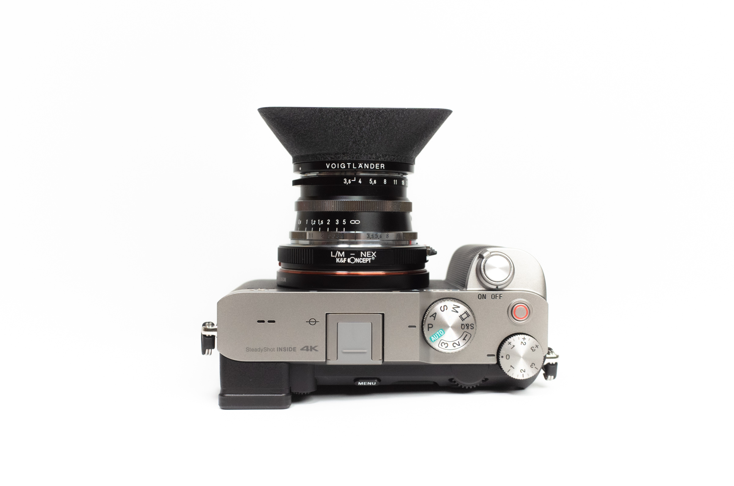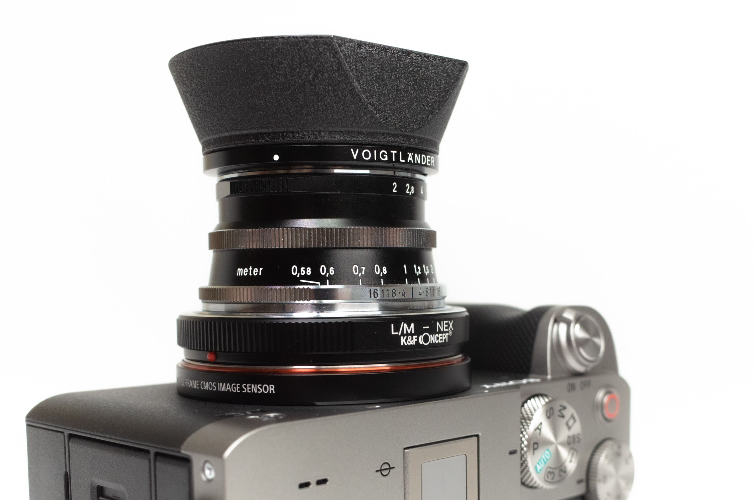 이대로 카메라에 마운트하면 M 마운트 렌즈를 A7C에 사용할 수 있습니다. 첫 번째 사진은 녹턴 50mm F1.5 II 렌즈와의 조합.