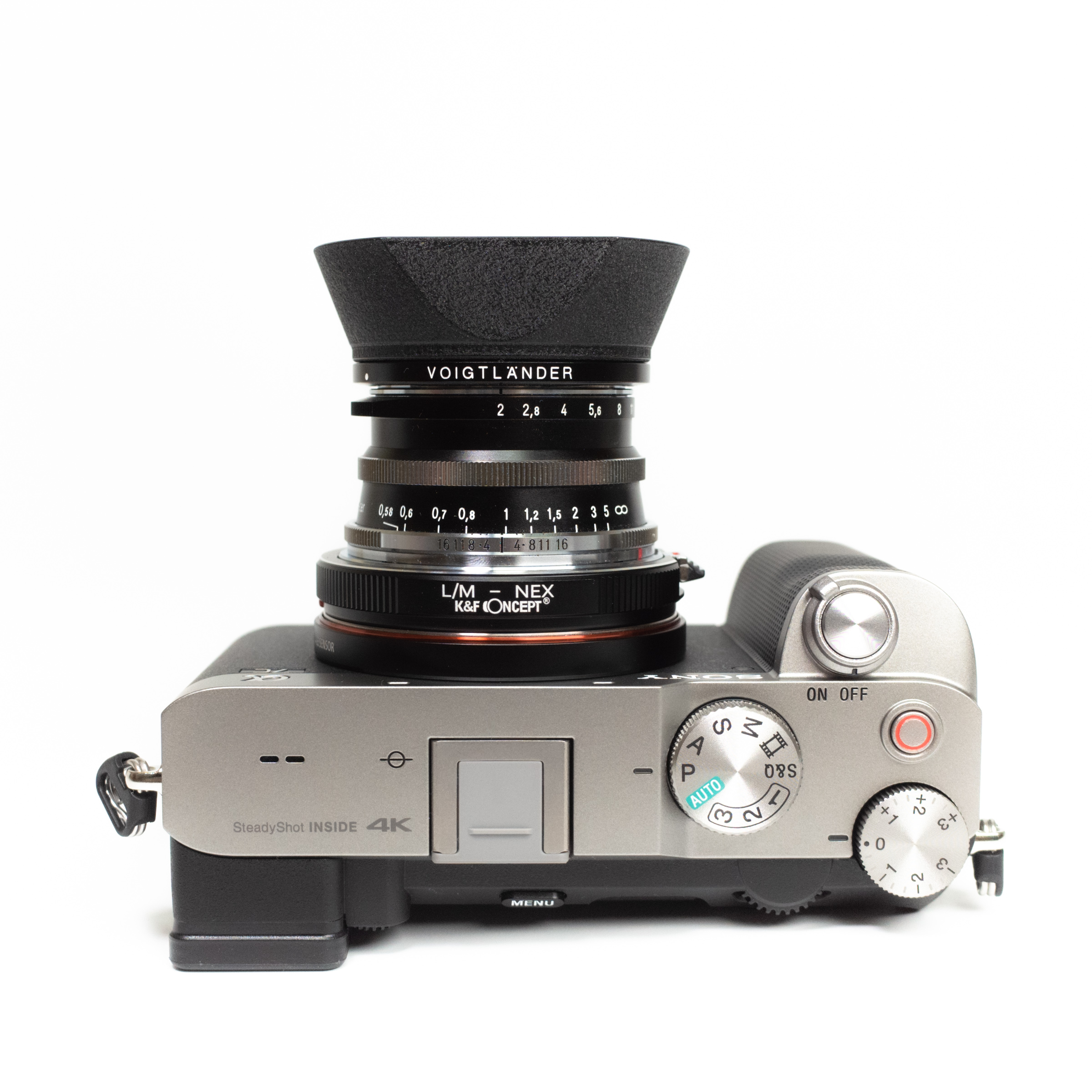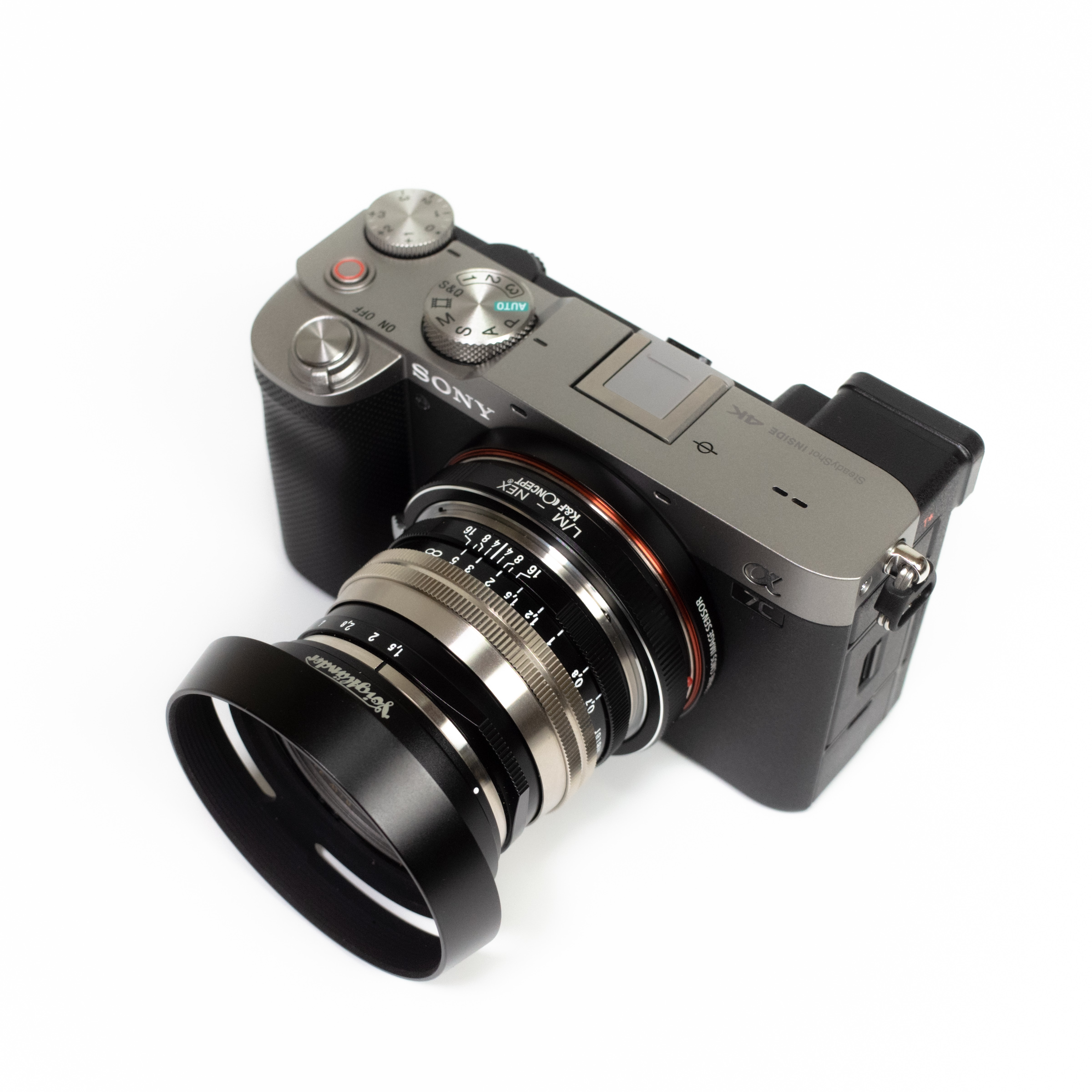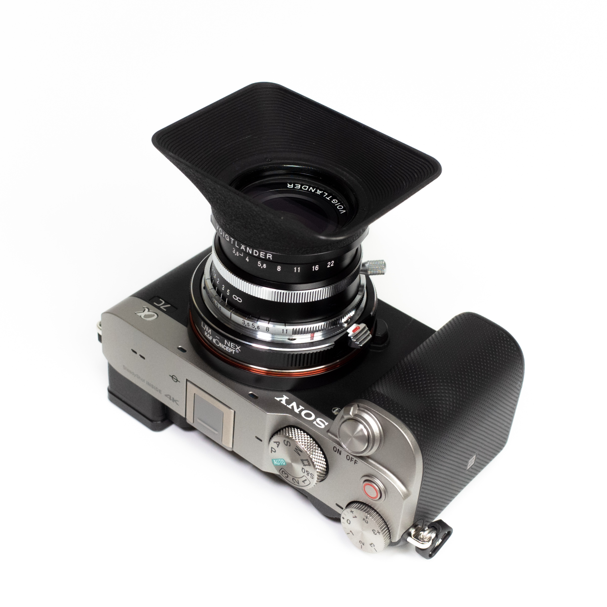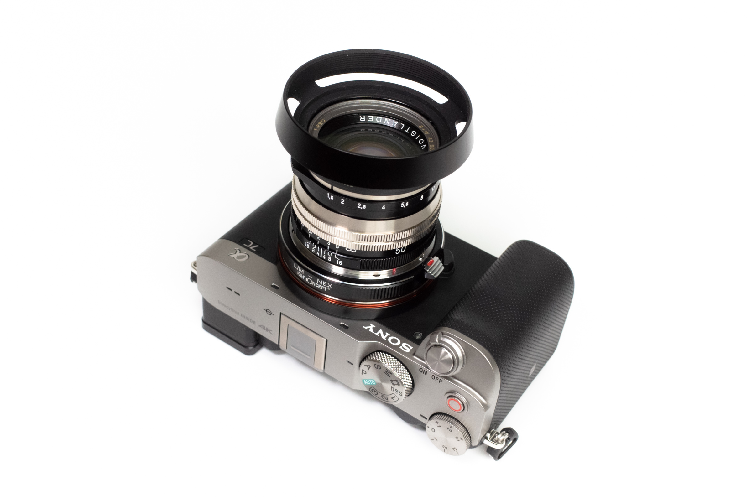 이대로 카메라에 마운트하면 M 마운트 렌즈를 A7C에 사용할 수 있습니다. 첫 번째 사진은 녹턴 50mm F1.5 II 렌즈와의 조합.