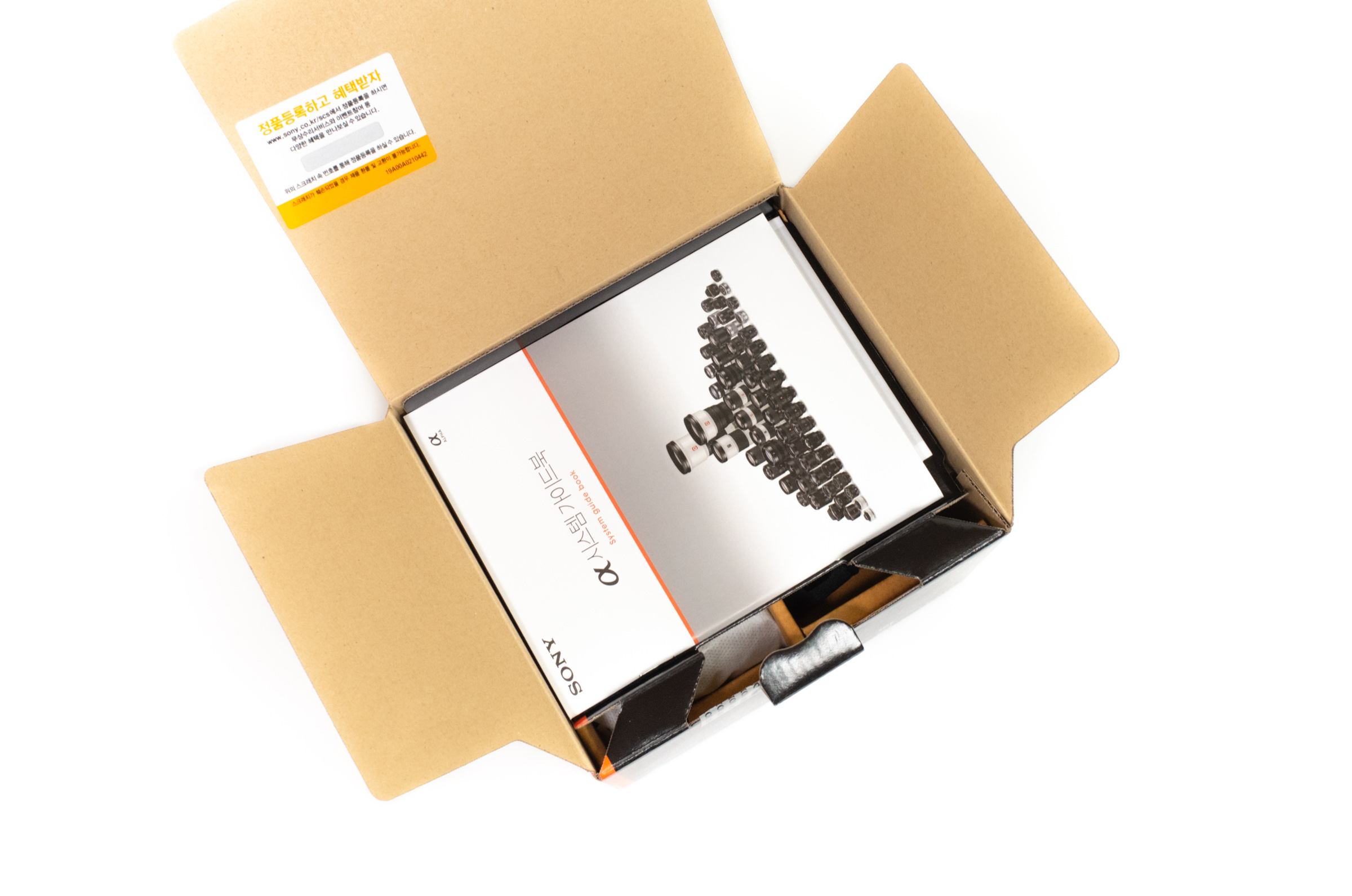 택배 상자를 받고 놀랐습니다. 액정 보호필름이 들어갈만한 작은 상자로 배송이 왔는데 상자를 봐도 이게 도통 200만원 넘는 카메라의 그것이라고는 믿기지 않습니다. 가격은 비싸지만 이 카메라는 소니 풀 프레임 미러리스 카메라 라인업의 엔트리 제품이라 여러모로 원가 절감의 노력이 들어간 것 같습니다. 50만원대인 소니 A5000 시리즈와 같은 종이 상자를 사용한 것 같아요.