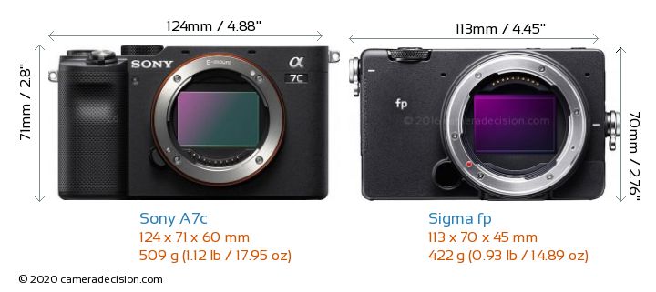 가로 길이가 약 1cm, 높이는 1mm 차이로 거의 같고 두께 역시 그립부를 제외하면 큰 차이가 없습니다. 둘 다 2400만 화소 풀프레임 이미지 센서를 탑재했는데 AF 성능이나 인터페이스 등 기본기를 따지면 A7C 쪽이 우세한 점이 많기 때문에 크기에서 오는 열세가 상당부분 상쇄됩니다. 대신 FP는 시네마 영상 촬영 성능이 대단한 장점이 있죠.