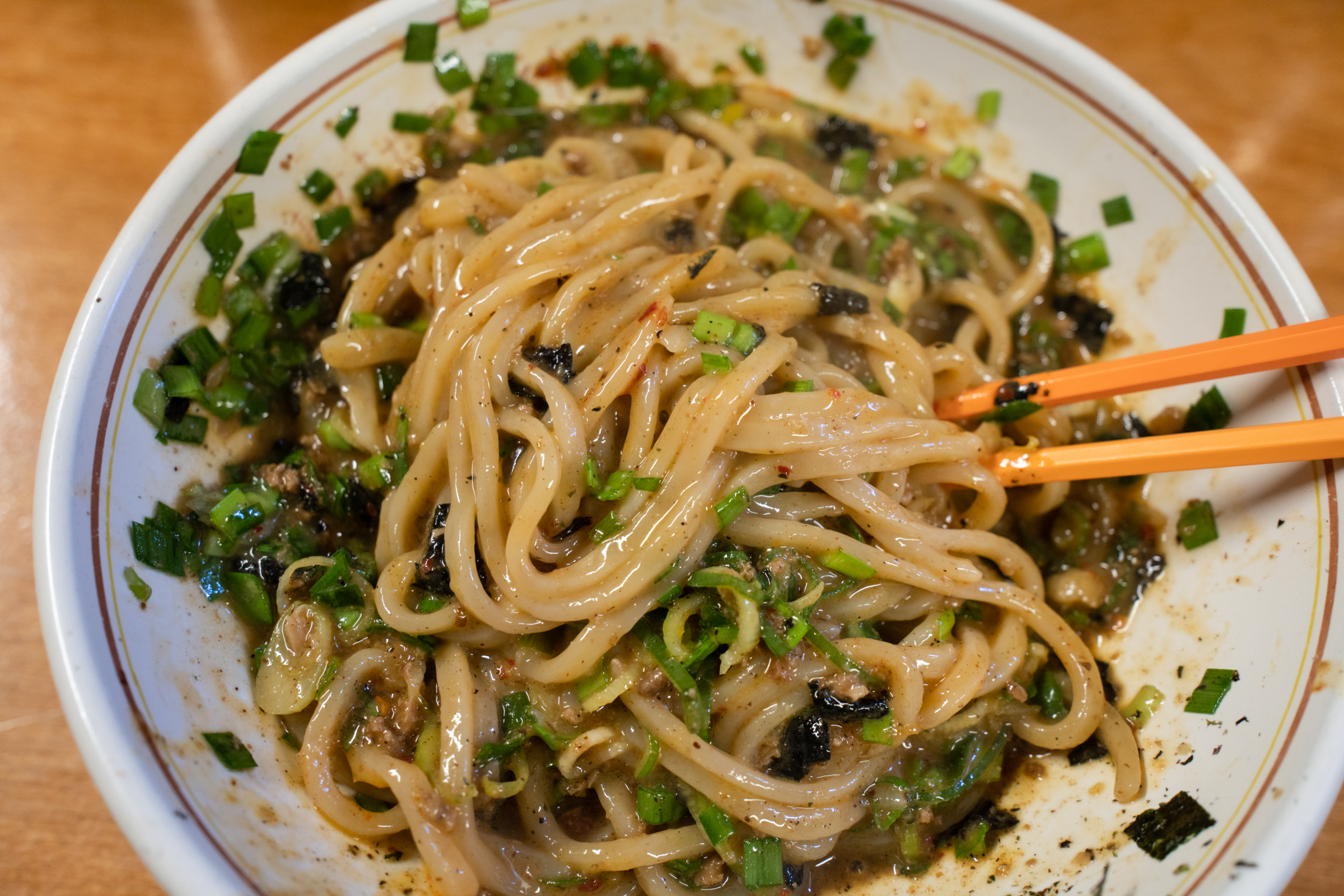 재료를 보면 파와 김, 고기, 향신료, 달걀 등 맛이 없기가 힘든 조합입니다. 이것들을 모두 비볐을 때 어떤 맛이 날까 싶었는데, 양념장 맛이 좋더라고요. 간이 좀 강해서 짭짤한데 고기 감칠맛과 김과 파의 향이 잘 어우러졌어요. 날달걀을 넣고 비비니 맛은 전혀 다르지만 마치 짜장면같은 수분감 있는 농도가 잇어서 쉽게쉽게 넘어갑니다. 가게에서 직접 뽑는다는 면의 식감도 쫄깃하니 이런 비빔면에 잘 어울립니다.