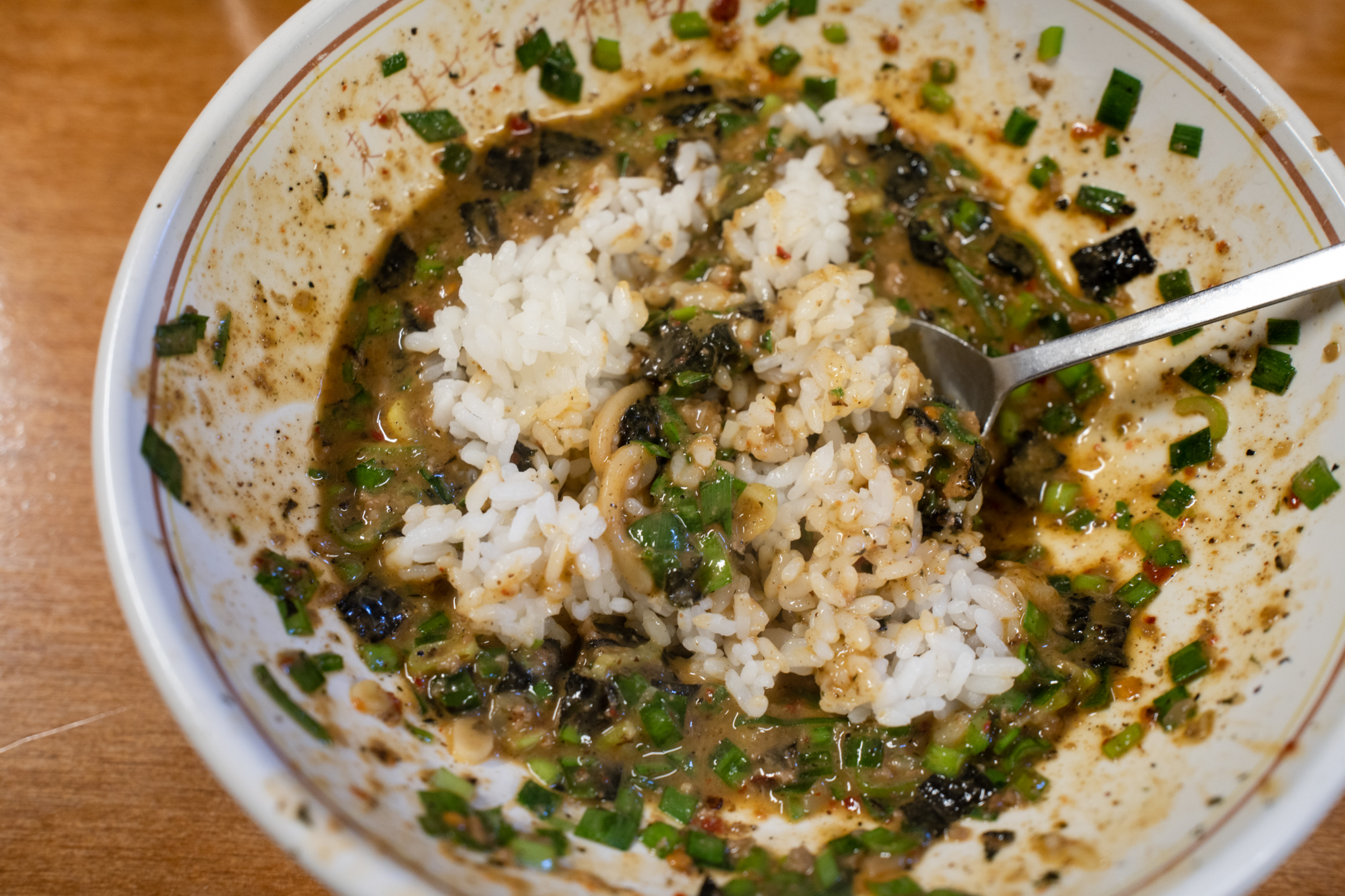 사실 마제소바는 이것 때문에 먹는 거죠. 면을 다 먹고 남은 양념에 밥을 비벼 먹으면 면보다 더 맛있습니다. 비빔밥의 민족에게 이건 호불호가 있을 수 없겠죠. 서울에서 먹어 본 마제소바 중에는 가장 괜찮았습니다. 제 입맛에는 여전히 돈코츠 라멘쪽이 더 좋지만 가끔 별미로 이런 게 참 좋죠.