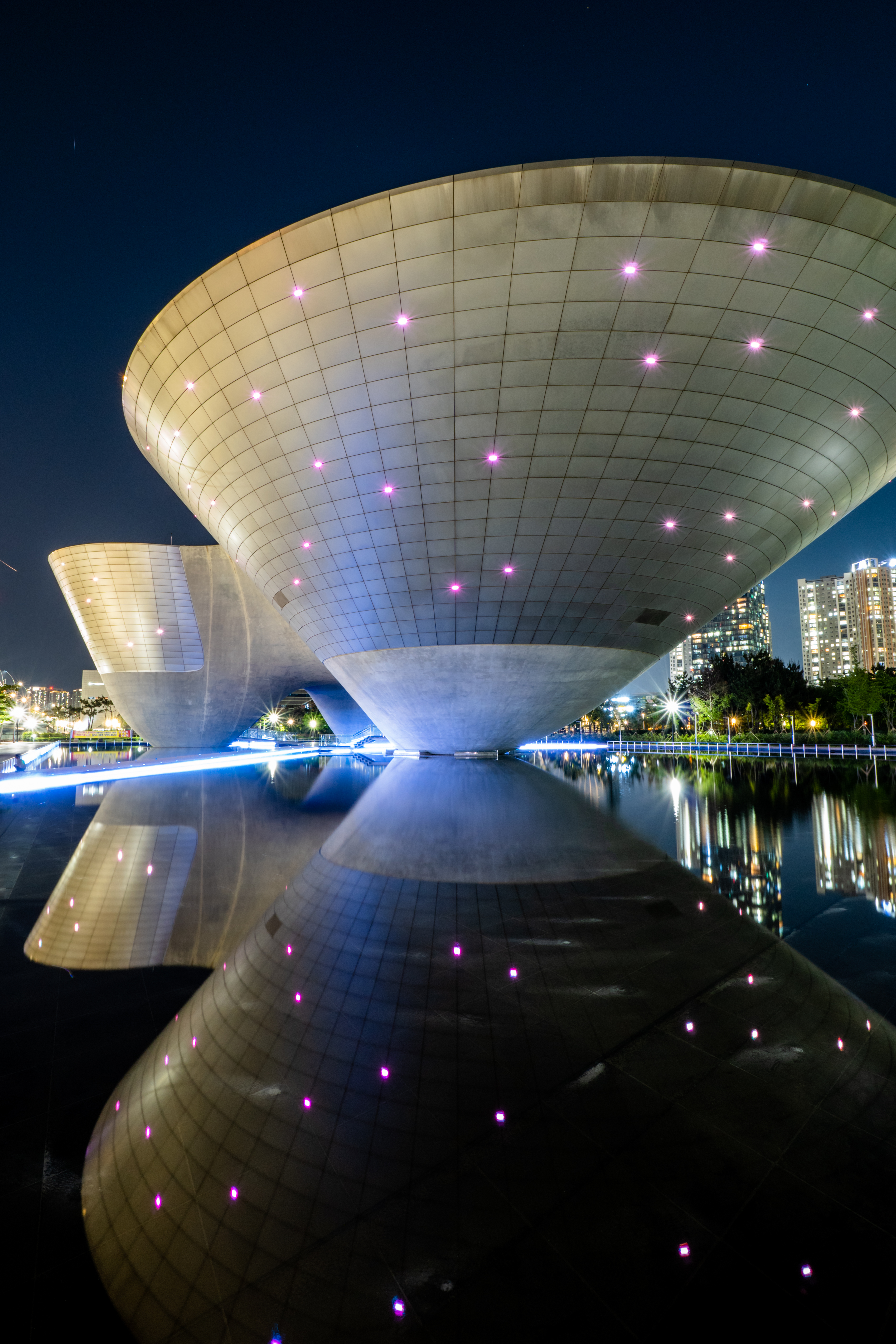 송도의 랜드마크인 트라이 보울. 거대한 구조물을 촬영할 때도 초광각의 광활한 프레임이 빛을 발합니다. 24-28mm의 일반적인 광각으로는 건물 전체를 담을 수 없지만 11mm 광각으로는 온전한 건물 실루엣은 물론, 바닥의 물에 비친 반영까지 함께 담을 수 있었습니다. 초광각 렌즈의 가장 큰 즐거움이라고 할 수 있겠죠. 이 때문에 멋진 건축물이 많은 여행지 촬영에도 초광각 렌즈가 사랑받습니다.