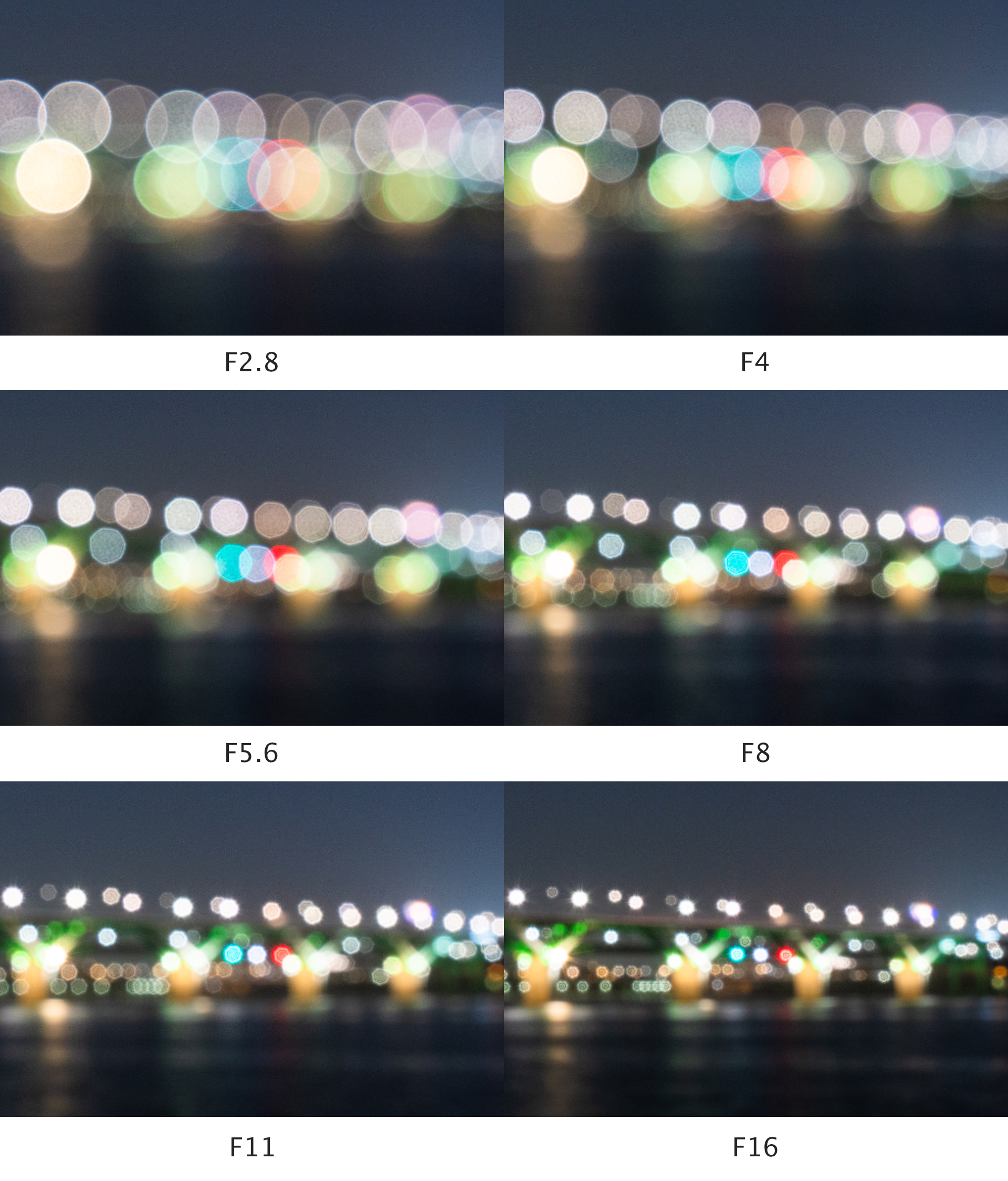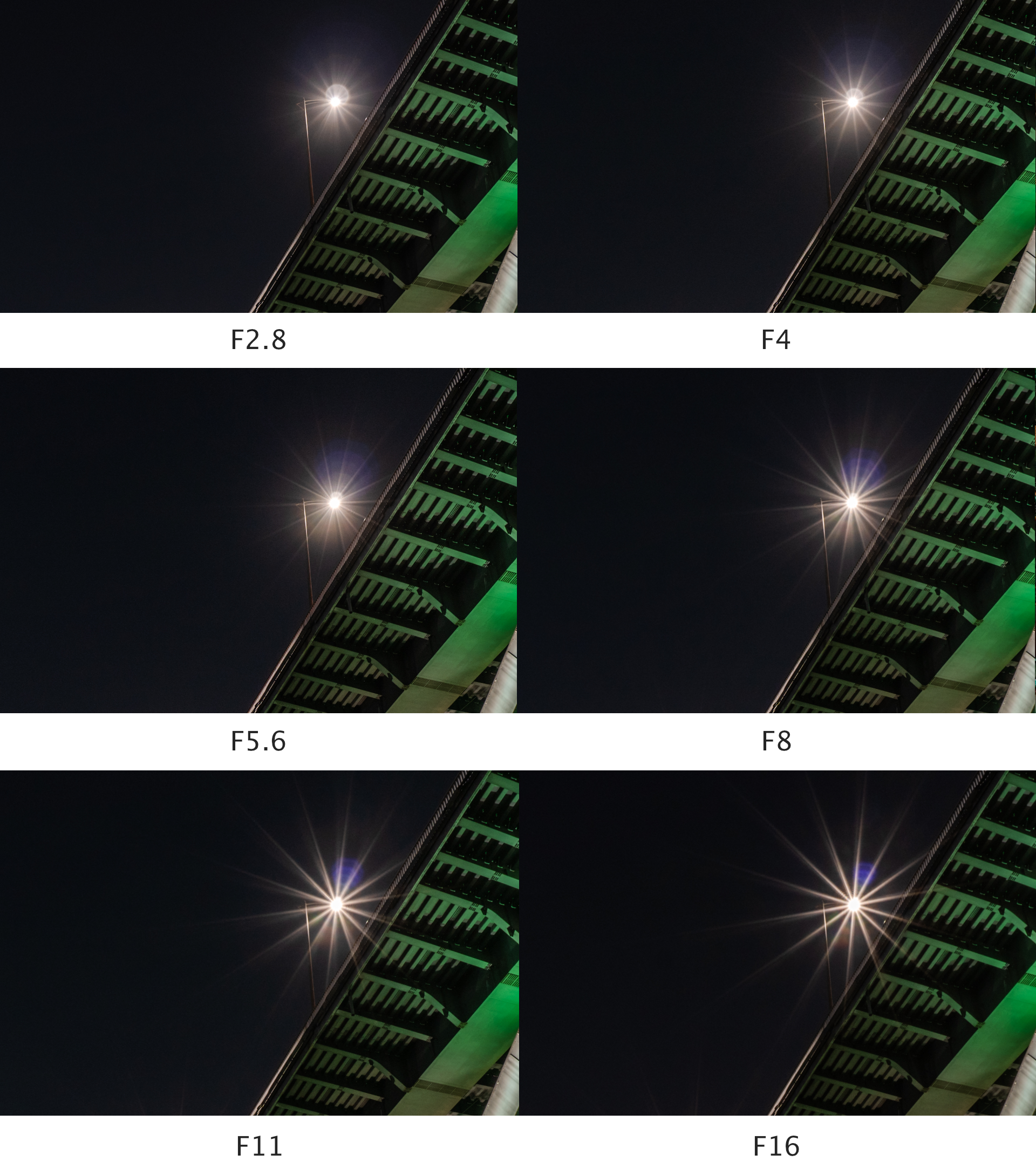 풍경/야경 촬영 빈도가 높은 렌즈를 평가할 때는 빛갈라짐 표현을 중요하게 여깁니다. 아래는 탐론 11-20mm F2.8 렌즈의 조리개 값에 따른 빛 갈라짐 변화를 비교한 것입니다. F2.8부터 한 스톱 간격으로 촬영했습니다.