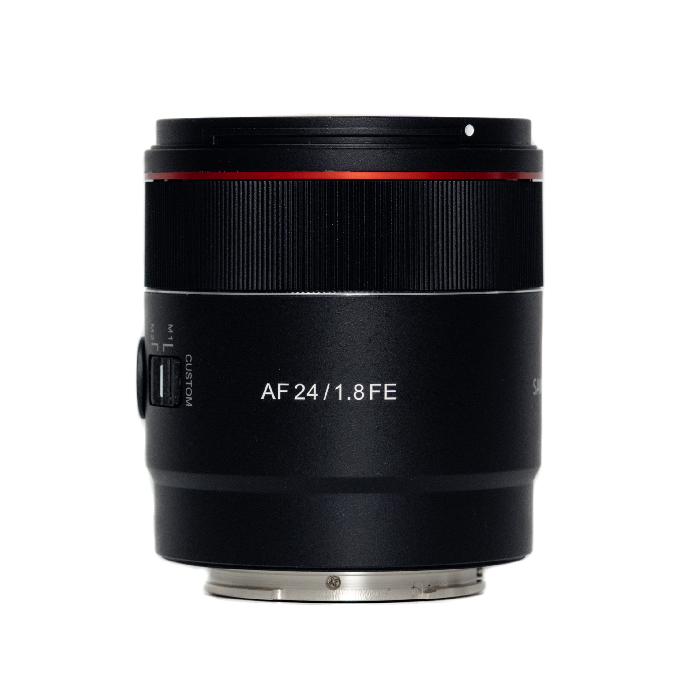 AF 24mm F1.8 FE 렌즈는 삼양의 tiny but 시리즈 중에서는 가장 큰 편에 속합니다. '팬케이크 렌즈'로 불리는 35mm F2.8, 24mm F2.8 렌즈처럼 작은 맛은 없지만 무게는 230g으로 충분히 가볍습니다. 삼양 AF 렌즈 중 인기있는 AF 75mm F1.8 렌즈와 같은 무게이며 크기 때문인지 손으로 쥐었을 때 매우 가볍게 느껴집니다.