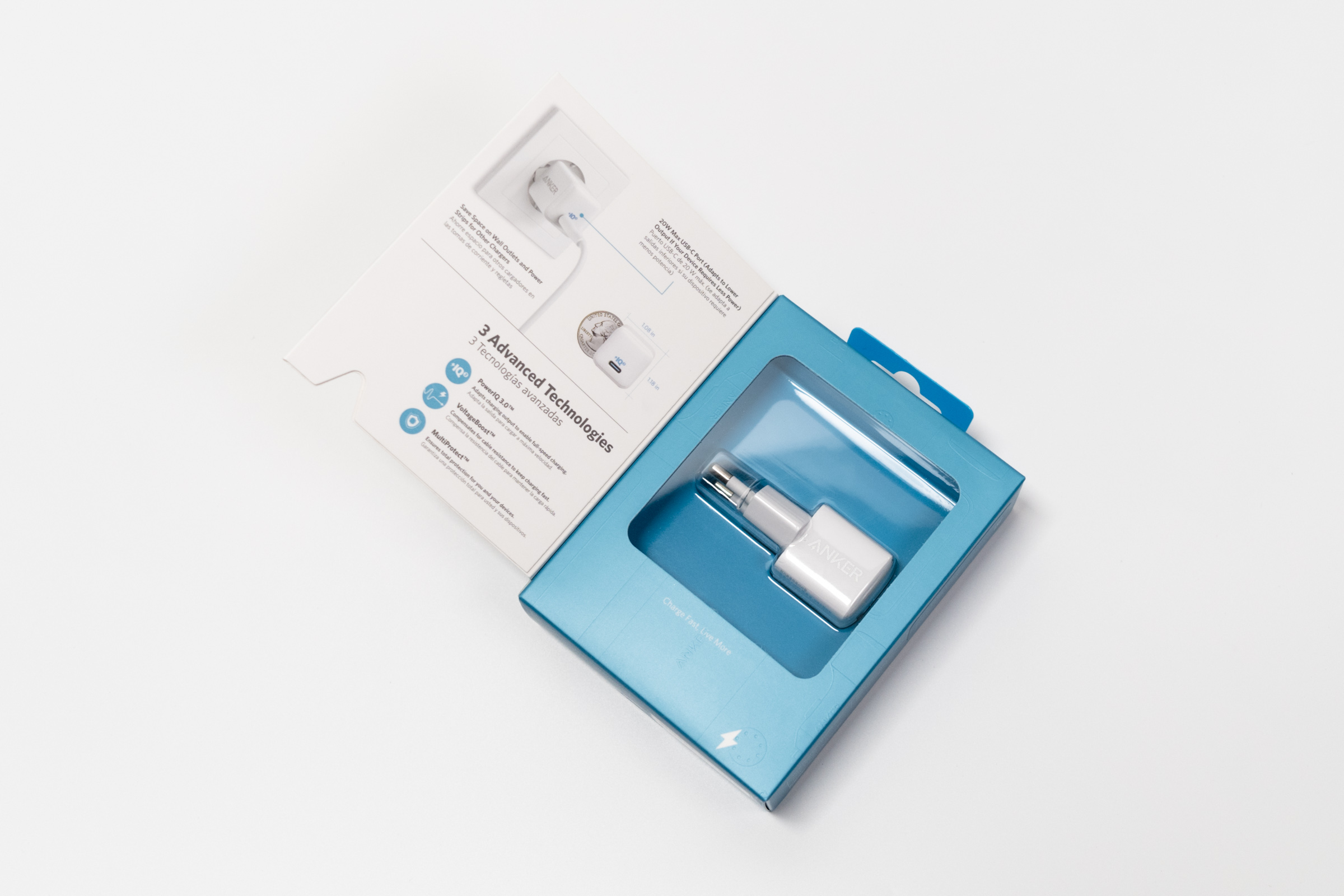 패키지 덮개를 열면 실제 제품을 볼 수 있는 구조. 오프라인 숍에서 판매할 때 예비 구매자들에게 유용할 구성이겠네요. 실제 제품을 보니 확실히 그간 써 온 충전 어댑터보다 작습니다. 물론 플러그를 제외한 본체에 한한 얘기지만요.