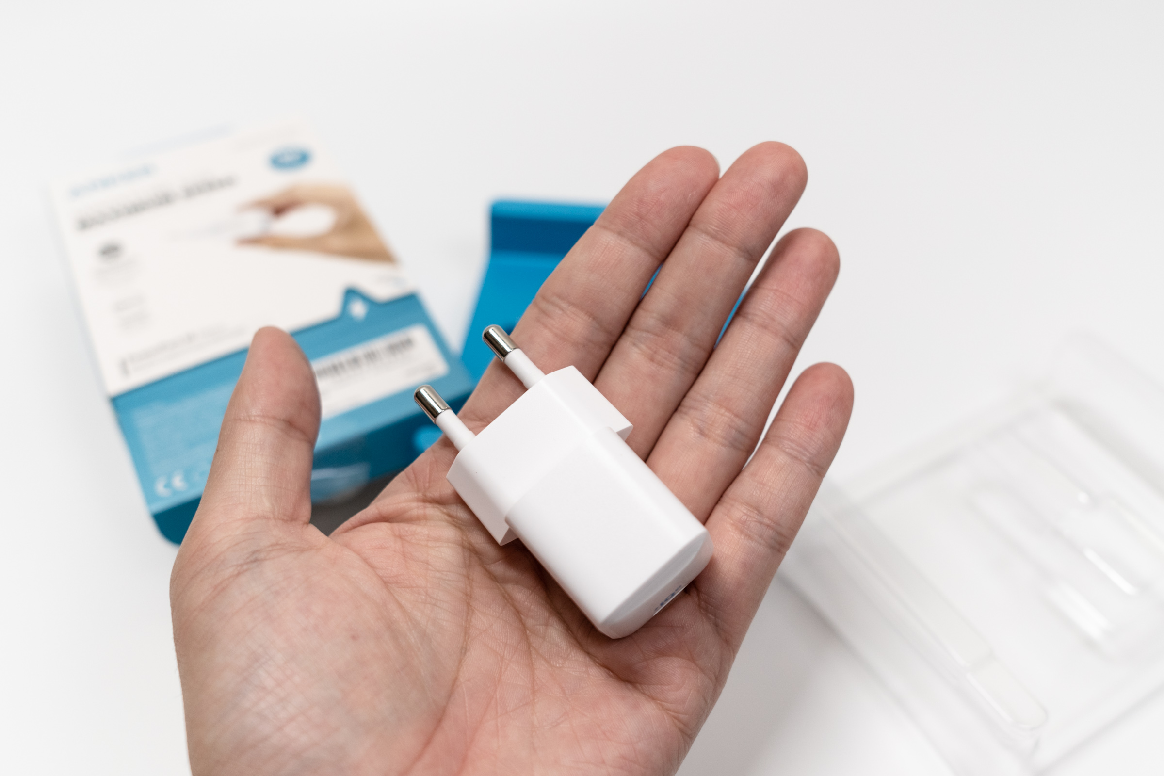 무광 플라스틱으로 된 본체. 애플 충전 어댑터의 유광 소재보다는 관리가 좀 더 쉽겠네요. 손바닥에 올려 보니 정말 작긴 작습니다. 현재 판매 중인 애플의 20W 어댑터는 물론이고 예전 5W 어댑터보다도 작은 것 같아요.