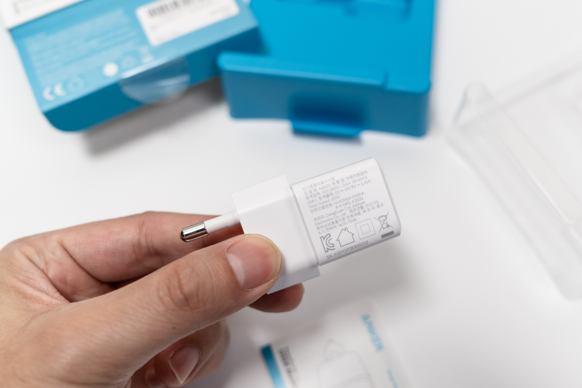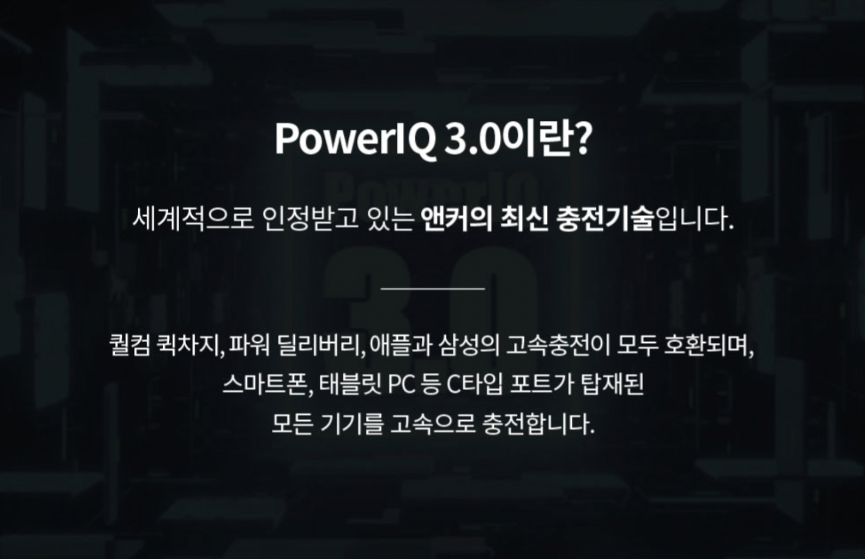출력 포트는 USB-C로 최대 20W 출력을 지원합니다. 아이폰 12 시리즈의 고속 충전에 맞춘 사양이겠죠. 포트는 한 개고 상단에 앤커의 고속 충전 기술인 PowerIQ 3.0을 지원한다는 문구가 인쇄돼 있습니다. 독자 규격인 줄 알고 우려했는데 설명을 보니 삼성, 애플의 서로 다른 고속 충전 규격을 모두 지원하는 기술이라고 하네요.