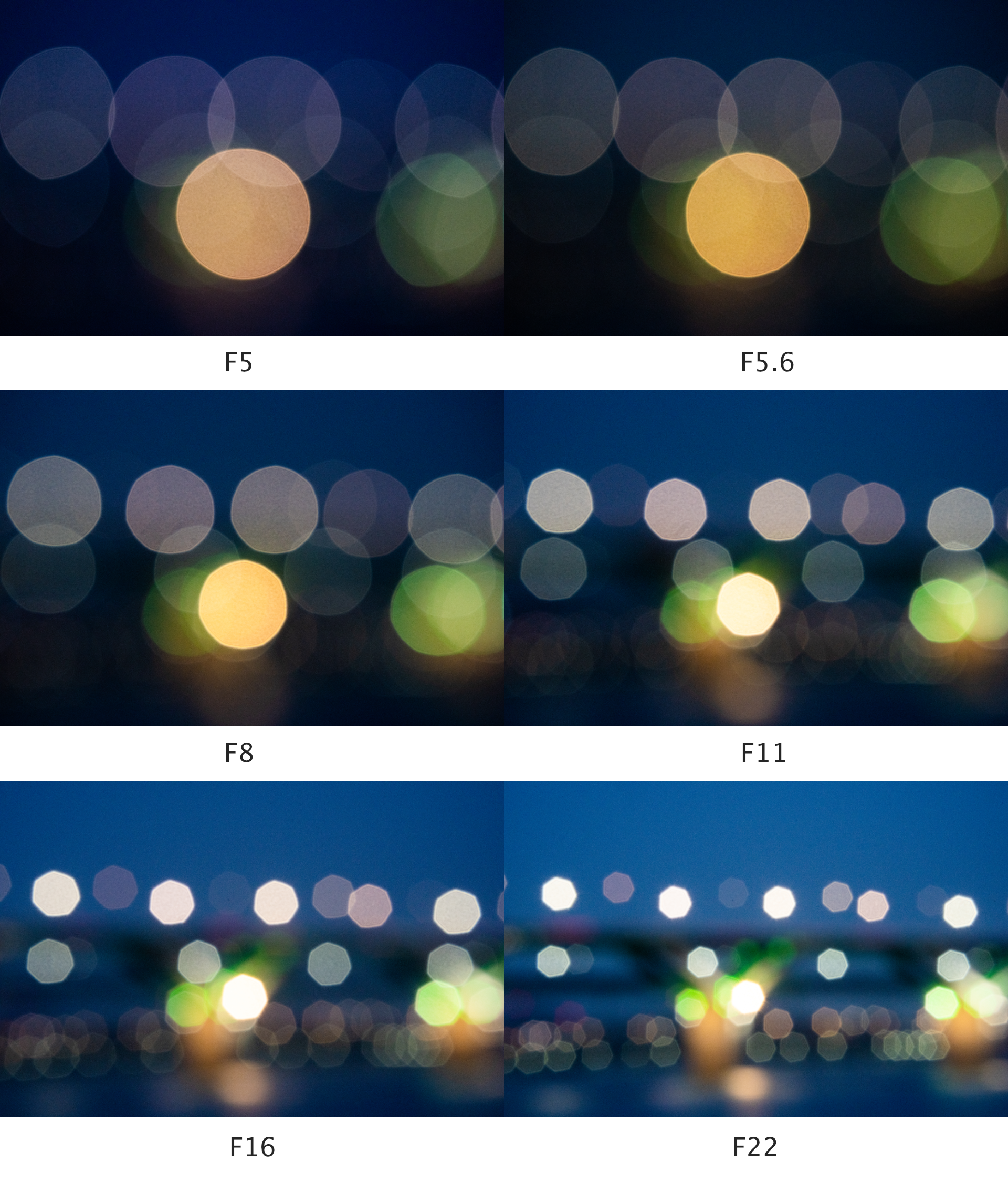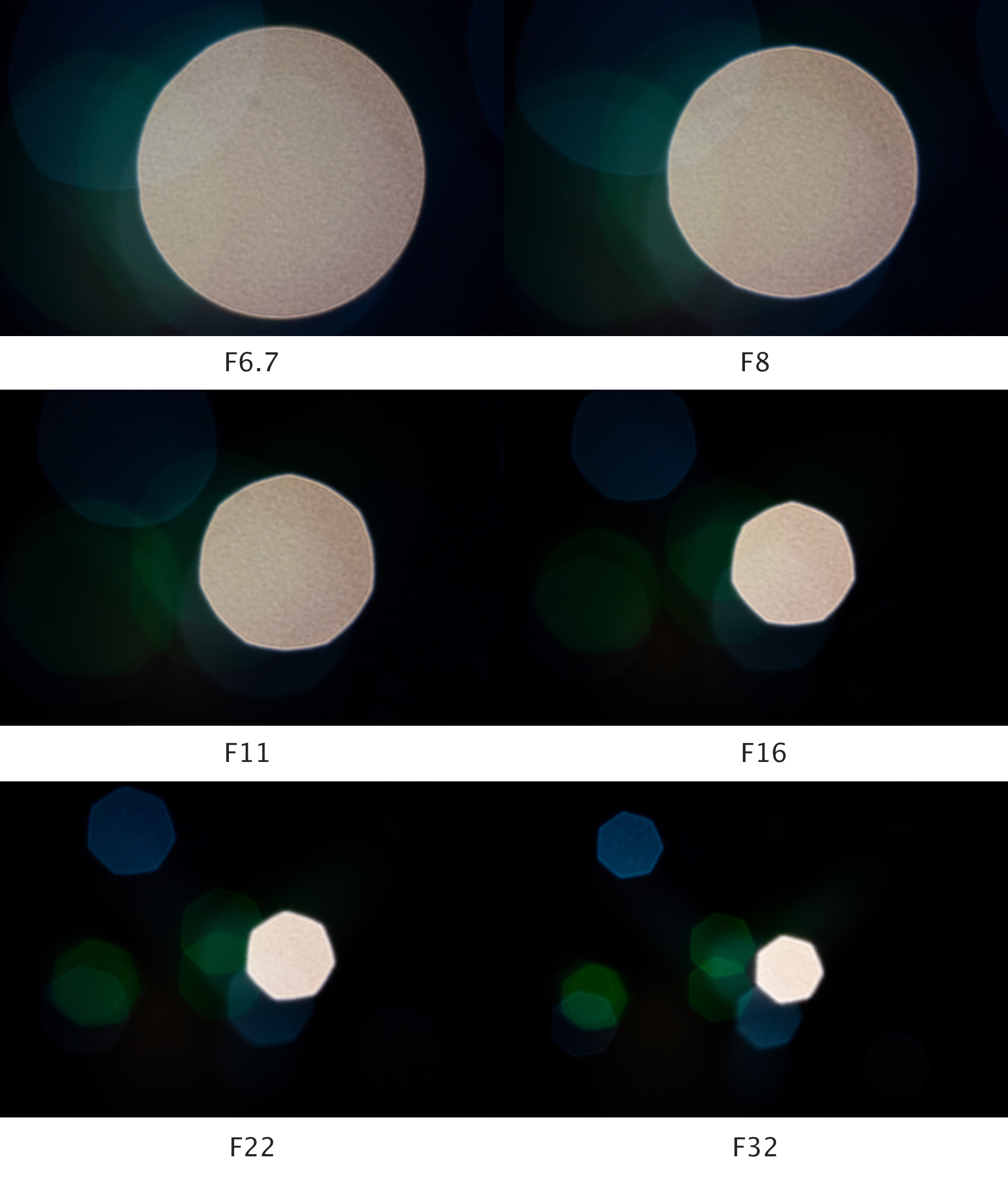 아래는 초점거리와 조리개 값에 따른 보케의 크기와 모양 변화입니다.