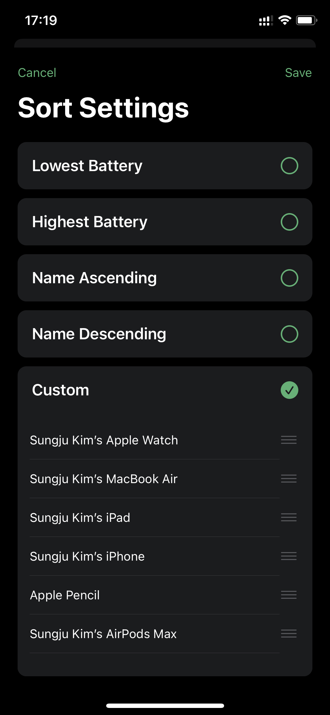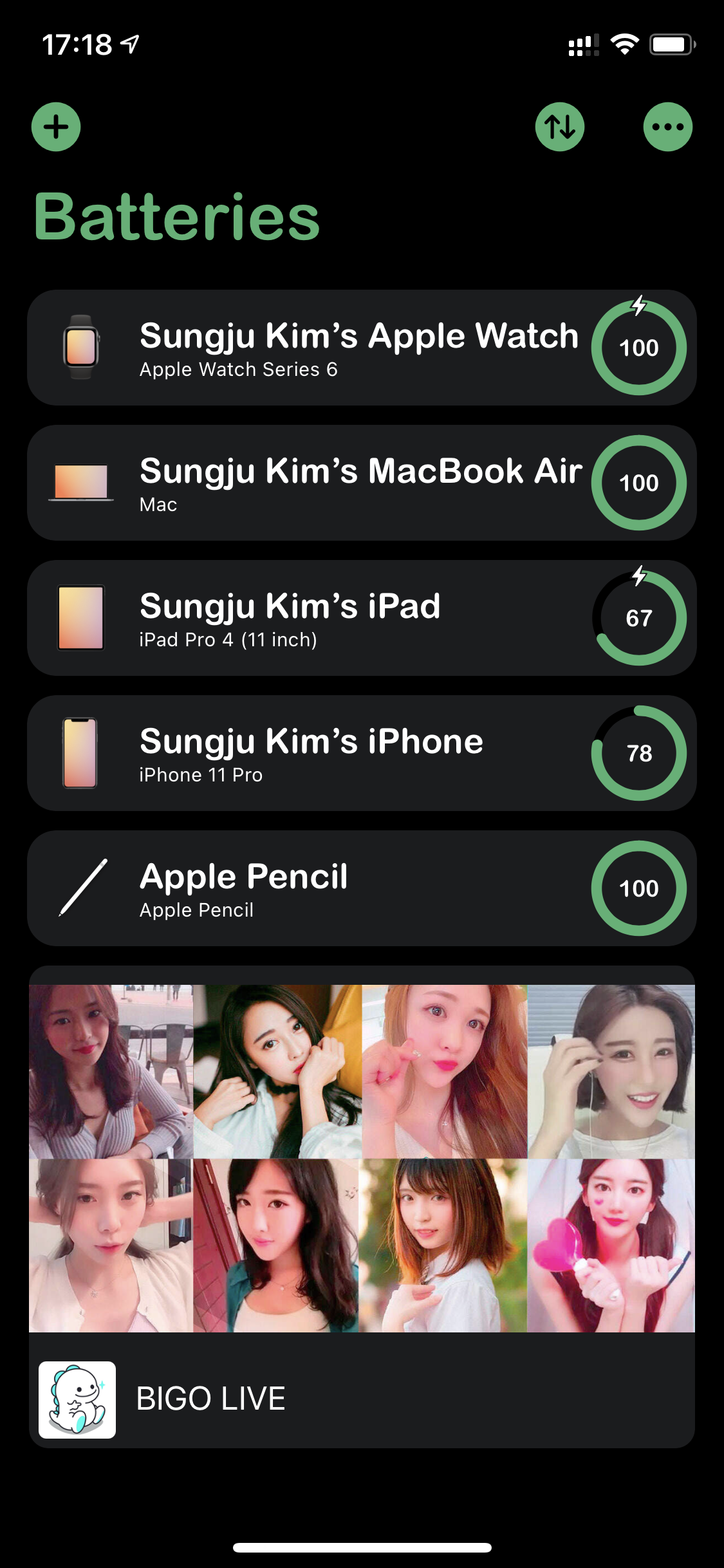 앱 실행 화면입니다. 현재 사용 중인 장치들의 목록과 현재 배터리 상태가 표시됩니다. 현재 충전 중인지도 표시가 돼서 종합적인 배터리 관리에 무척 좋습니다. 특히 에어팟이나 애플 워치 등의 배터리를 미리 확인할 수 있는 것이 유용하죠.