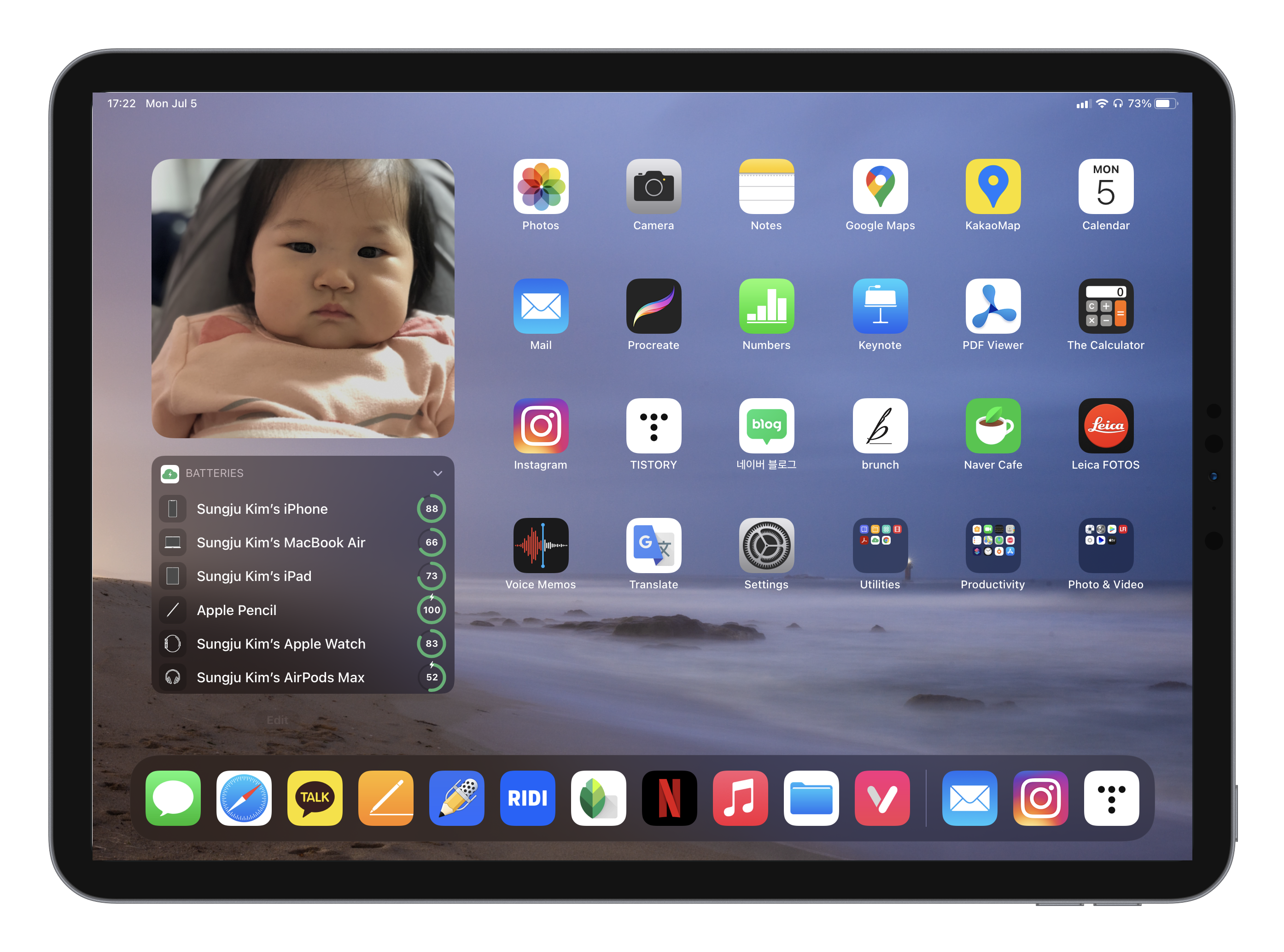 화면이 큰 아이패드에선 이렇게 위젯창 하나로 사용 중인 장치들의 배터리 상태를 한 눈에 볼 수 있어요. 특히 애플 워치나 에어팟 시리즈의 배터리를 확인하고 충전 여부를 결정할 수 있는 점이 좋습니다. 밖에서 에어팟이 방전되면 허전하고 막막하잖아요.