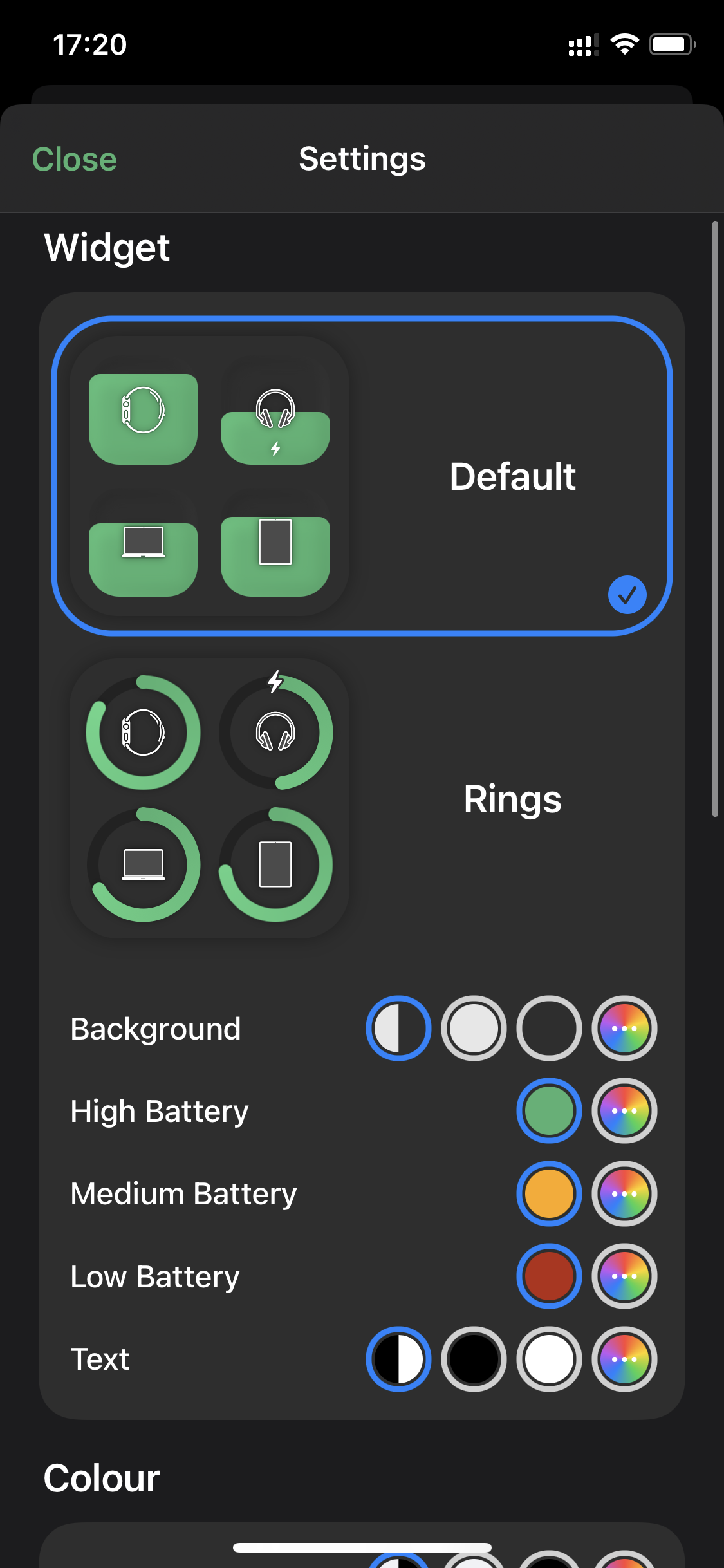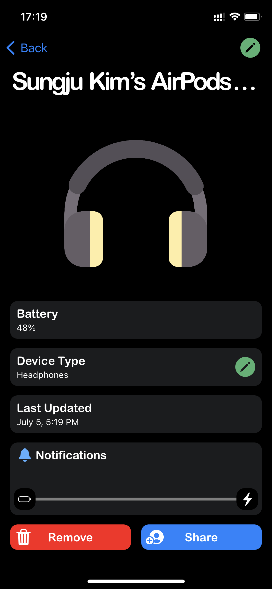 장치 추가도 무척 간단한 편인데, 앱을 실행한 장치를 기반으로 블루투스 통신을 이용해 주변에 있는 장치를 검색을 통해 추가할 수 있습니다. 거기에 해당 장치에 연결된 블루투스 장치도 함께 추가할 수 있어요. 애플 펜슬이나 에어팟 같은 액세서리까지. 아이폰/아이패드의 홈 화면 위젯도 지원해서 아이콘 형태로 간편하게 확인이 가능해요.