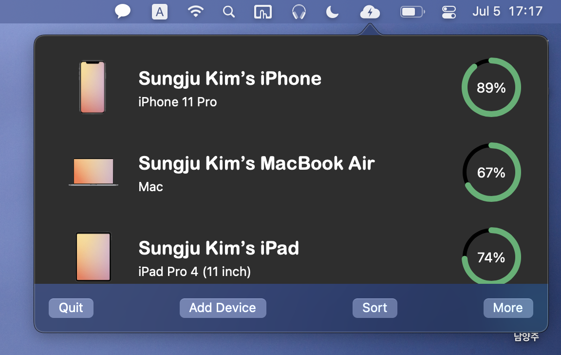 맥 앱스토어에서 설치한 맥 용 클라우드 배터리 앱입니다. 상단 상태 표시 바에 아이콘이 상주하면서 한 번 클릭으로 제품 목록과 배터리 상태를 표시합니다.