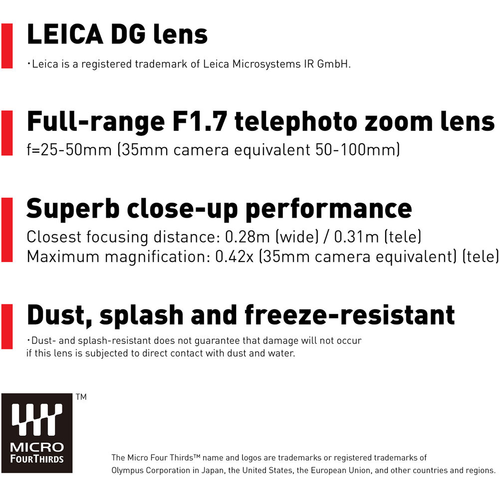 35mm 환산 50-100mm 모든 초점거리에서 F1.7의 밝은 조리개 값, 28cm의 최단 촬영 거리 등이 장점입니다. 기존 DG 라이카 렌즈들에서 인정받은 고화질과 빠른 AF 등 고성능도 기대할 수 있고요. 밝은 조리개 값 대신 손떨림 보정 장치는 탑재되지 않았습니다. 경통 길이 127.6mm, 무게 654g으로 마이크로포서드 렌즈 중에서는 크고 무거운 편에 속합니다.