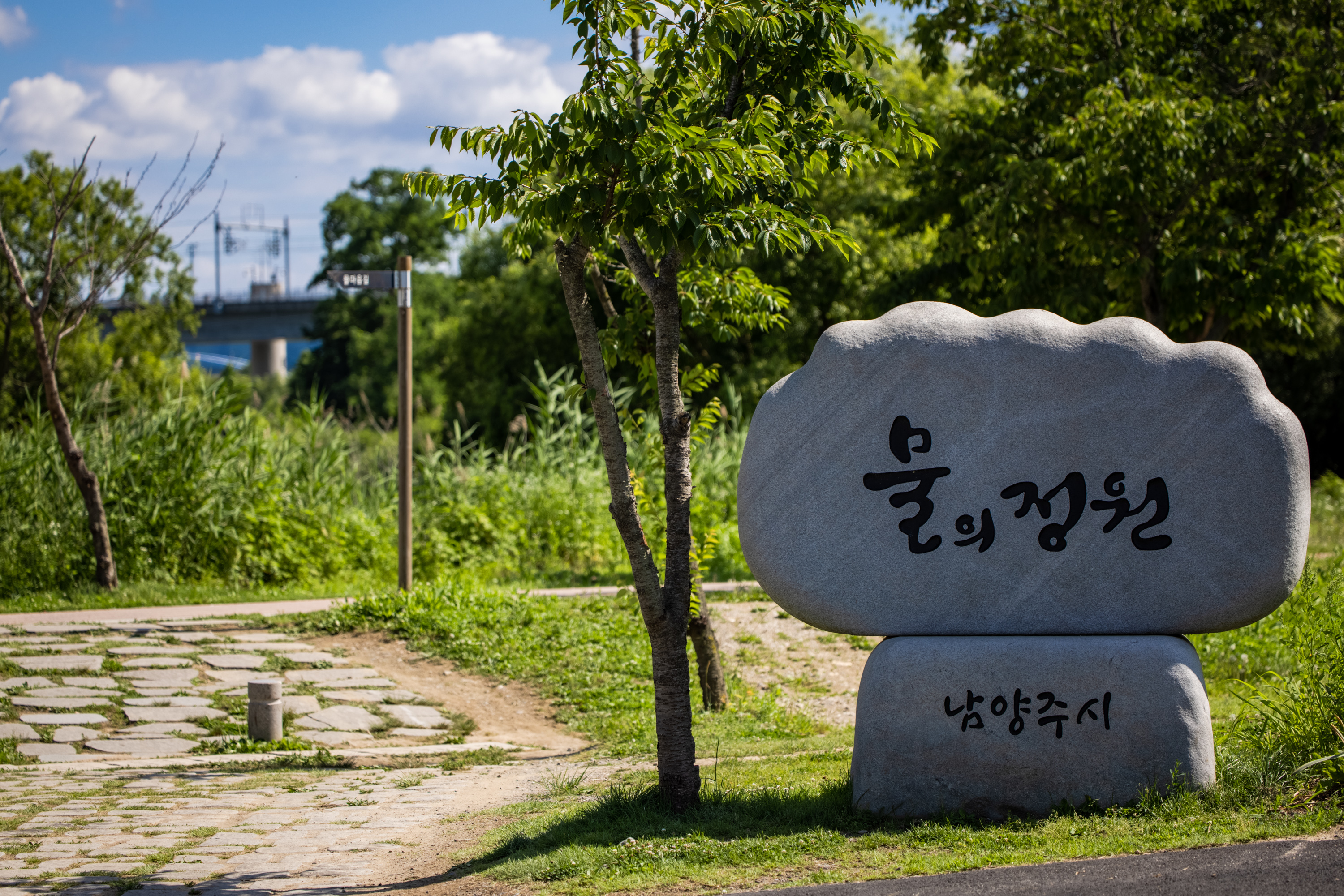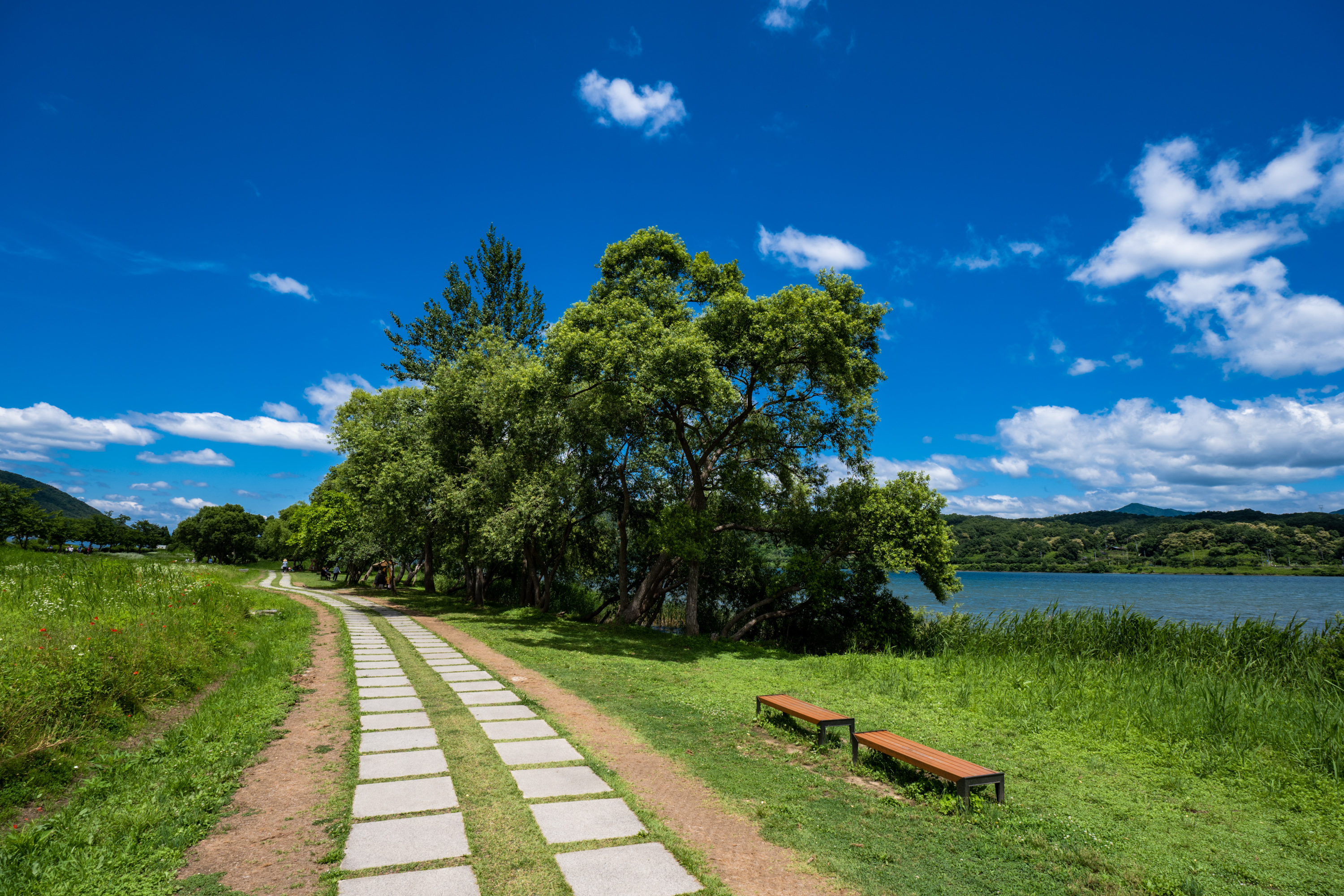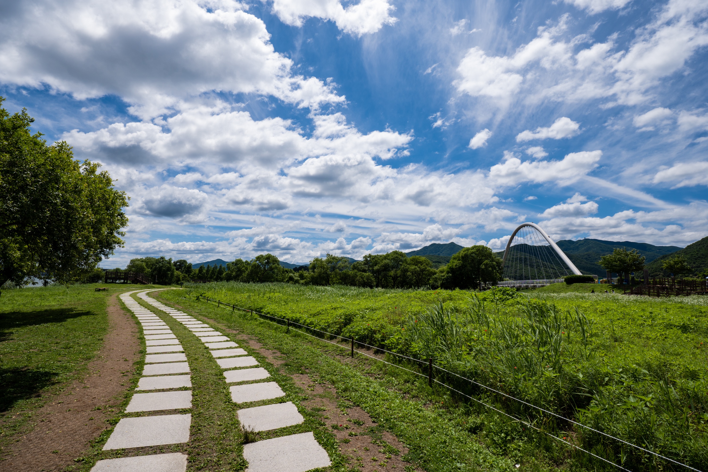 꽃밭과 북한강 사이에 산책로가 제법 잘 조성돼 있습니다. 보도블럭을 따라가면 족히 이삼십분은 걸릴만큼 길기도 하고요. 날은 좀 따가웠지만 왕복 한 시간 정도를 실컷 걸었습니다. 사진에서 볼 수 있듯 이 날 하늘이 정말 그림같아서 중간중간 사진 찍느라 더 오래 걸렸어요.