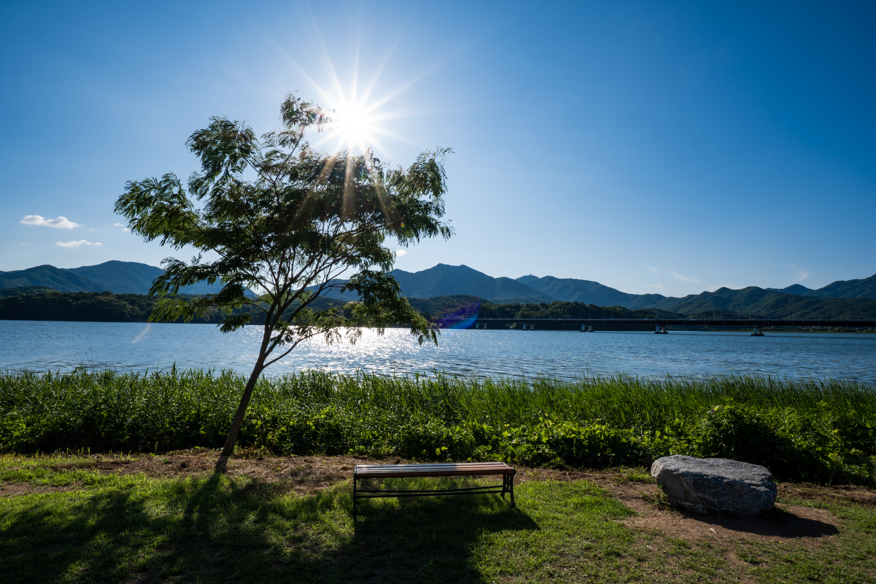 양쪽에 북한강, 남한강을 끼고 벤치 위에 앉아 있으면 첨벙이는 물소리와 바람 소리, 가끔 울리는 새소리 외에는 아무것도 들리지 않는 여유가 정말 좋습니다. 산책로는 잘 닦아 놓았지만 그 사이와 곁은 특별히 손을 대지 않은 것처럼 나무와 풀이 제멋대로 자라 있어 정겹습니다. 그 사이에 있는 벤치에 앉아 있으면 시간 가는 줄 몰라요.