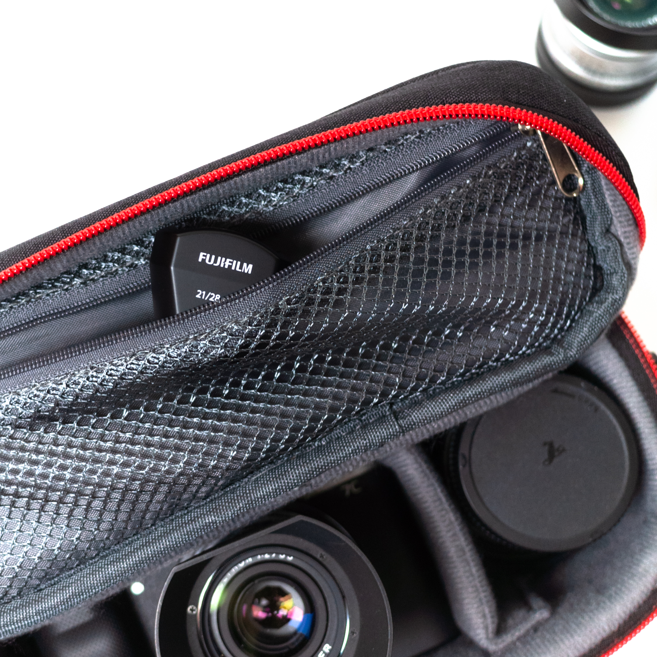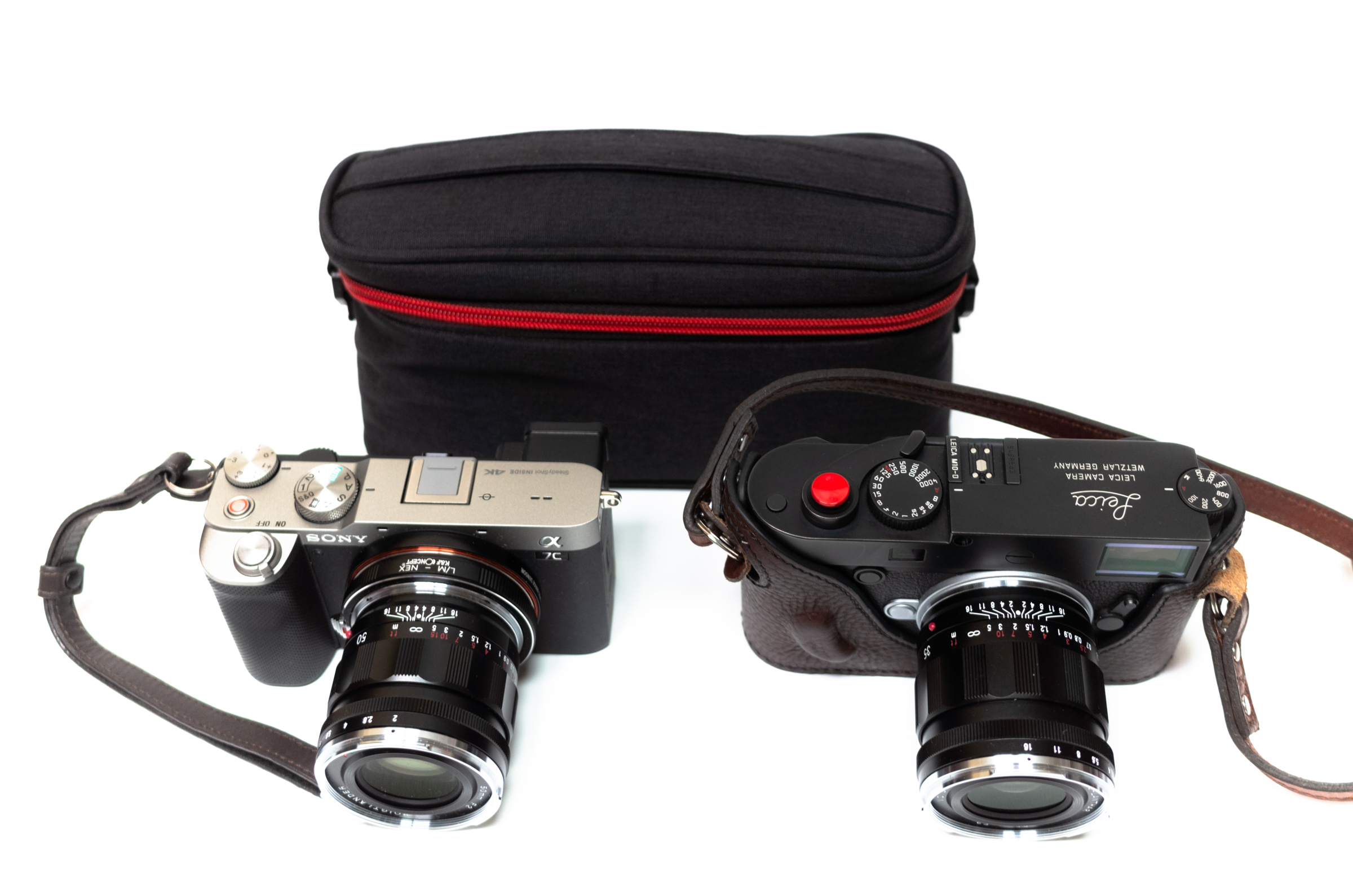 내부 파티션 폼 하나를 떼어 내면 A7C 정도의 소형 미러리스 카메라를 넣을 수 있습니다. 렌즈를 마운트 하고 넣을 경우 경통 길이를 신경써야하지만요. VM-E 렌즈 어댑터와 아포란타 50mm 렌즈를 마운트하니 가방 덮개가 닫히지 않았습니다. 울트론 35mm f2같은 짧은 렌즈를 마운트 하니 딱 맞네요. 패브릭 소재라 약간의 신축성은 있습니다.