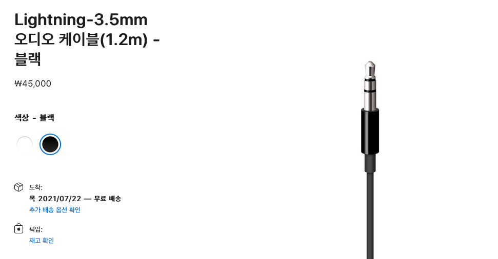 다들 기본 구성품으로 챙겨 주는 오디오 케이블을 45000원이나 주고 구매할 일은 없을 줄 알았지만 가지고 있던 유선 이어폰을 분실해 버렸습니다. 새로 유선 이어폰을 구매하려고 찾아 보니 3.5mm 애플 이어팟의 가격이 약 25000원. 괜찮은 유선 이어폰의 가격은 여전히 고가입니다. 이 상황이 되니 45000원짜리 케이블을 구매해 헤드폰으로 더 풍부하게 음악을 듣는 게 낫겠다고 합리화를 하게 되더라고요.