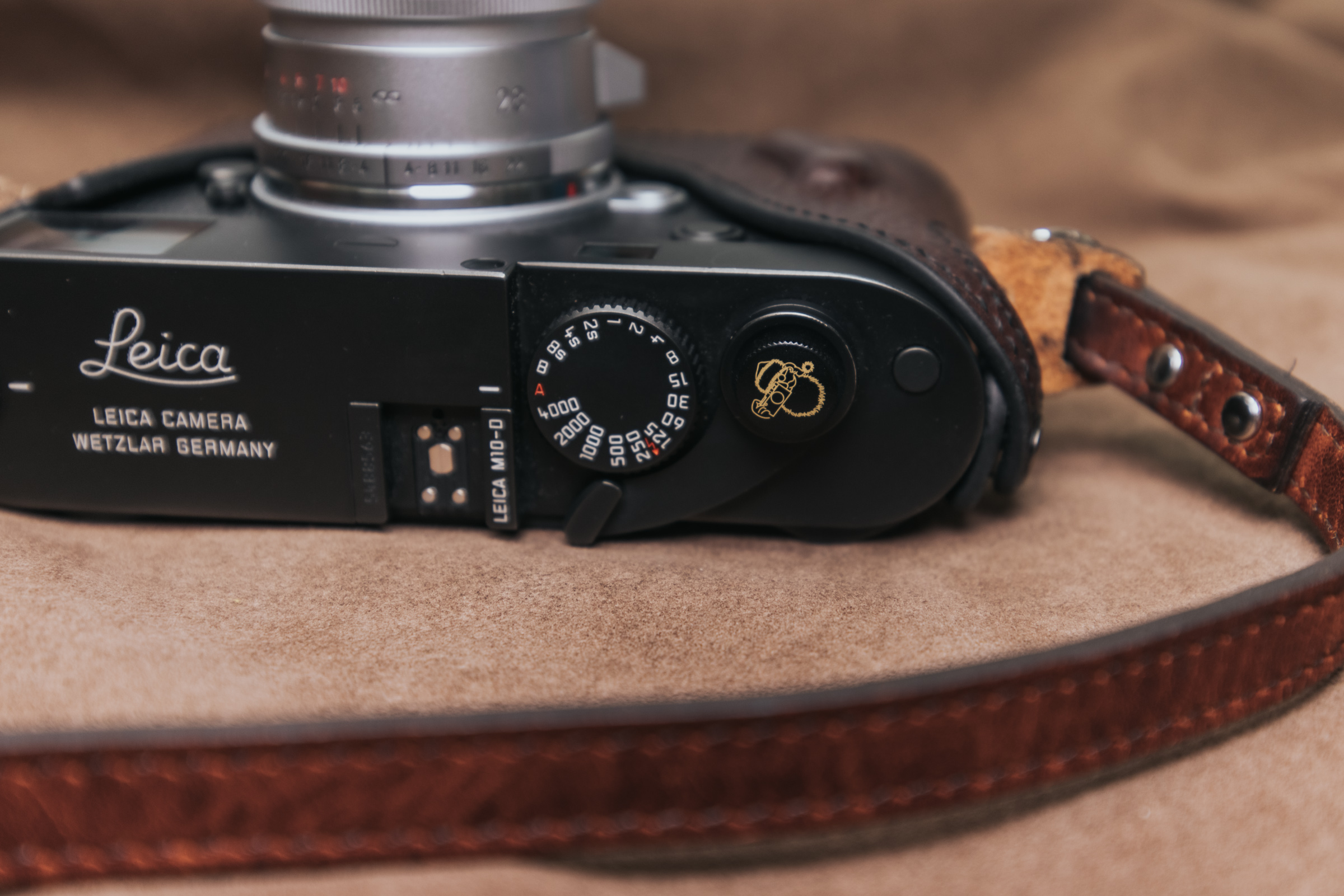 제가 사용 중인 라이카 M-10D에 결합한 모습입니다. 블랙 크롬 모델에 역시 잘 어울립니다. 이전에 사용하던 빨간색 버튼이 포인트가 됐다면 블랙 컬러의 산타 릴리즈 버튼은 마치 원래 셔터 버튼인 듯한 일체감이 장점입니다. 거기에 골드 컬러가 있어 적절한 포인트가 됩니다.