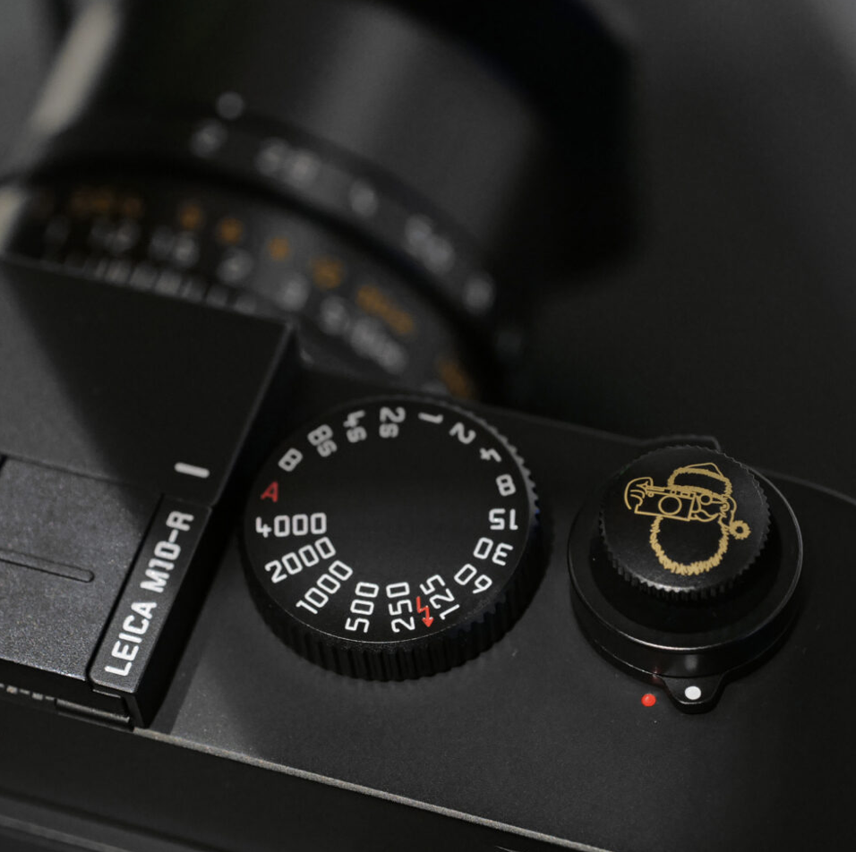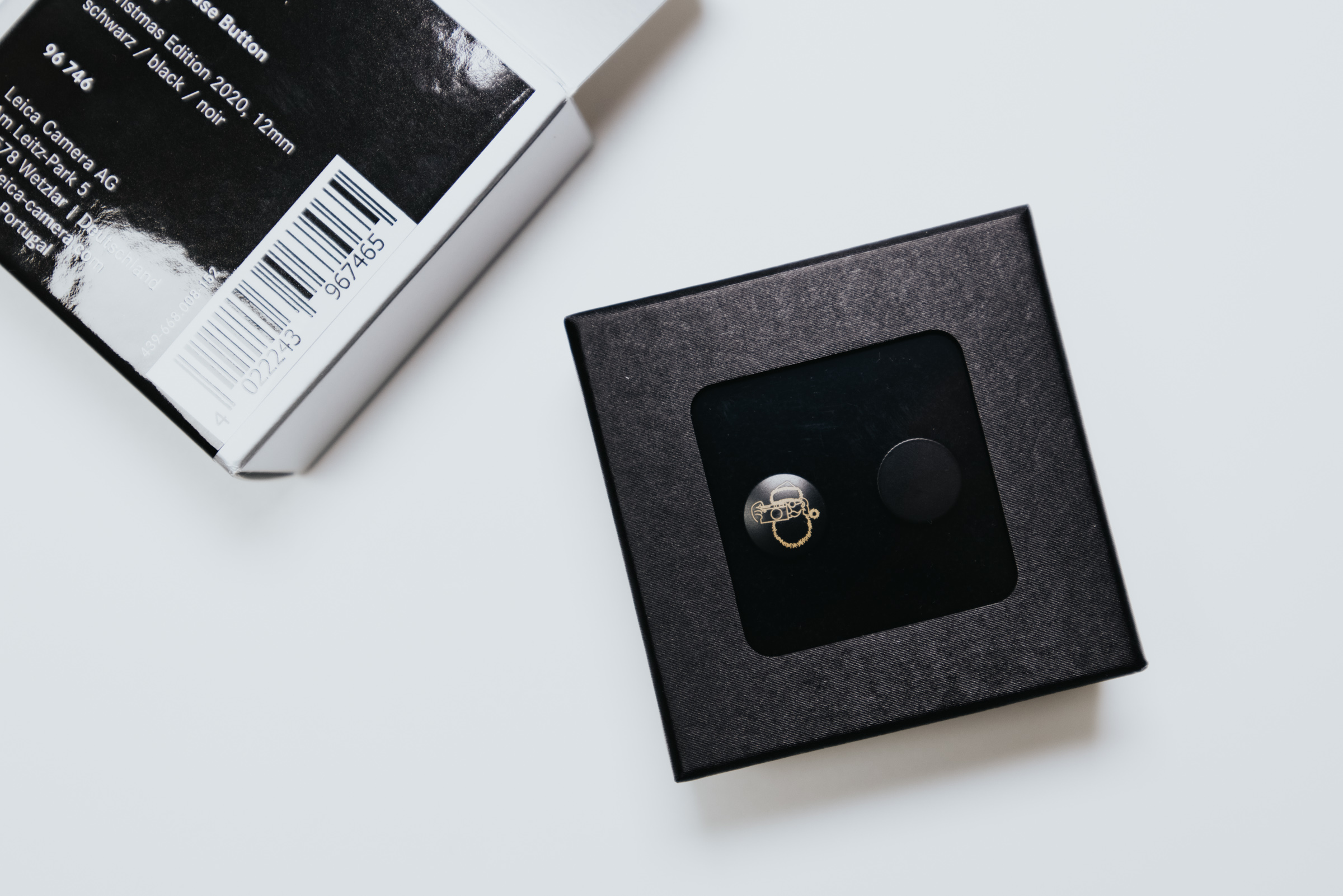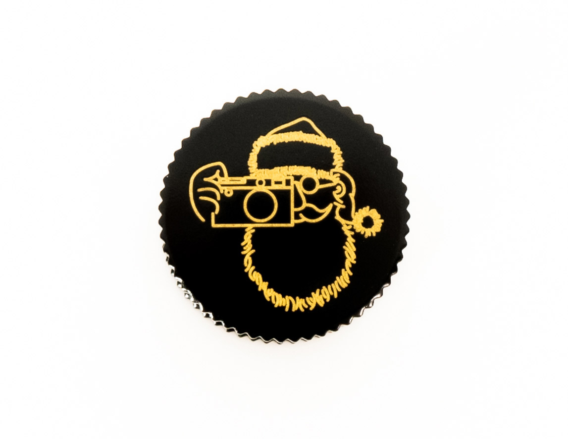 버튼은 무광 블랙 컬러로 라이카 블랙 크롬 카메라와 잘 어울리는 색상입니다. 미세하게 볼록한 실루엣, 주변부 마감이 일반 모델과 비슷합니다. 다른 점은 역시 산타 일러스트. 크리스마스 시즌 제품인만큼 라인 컬러는 금색으로, 안경 쓴 산타가 라이카 M 카메라를 들고 있는 모습입니다. 그림은 깊이가 깊지 않지만 음각으로 새겨진 것으로 보입니다. 단순 프린팅보다 색이 오래 가겠죠.