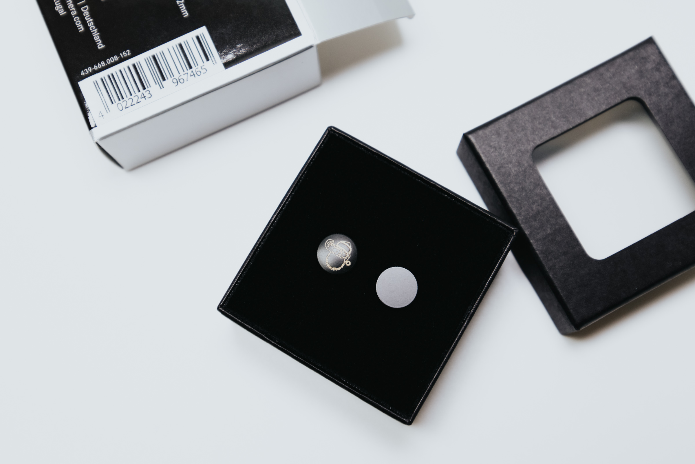 안에는 반지 케이스를 연상 시키는 작은 상자가 있습니다. 내부를 볼 수 있게 해 두었고요. 12mm면 라이카 릴리즈 버튼 중에서는 큰 사이즈인데 실제로 보니 상당히 앙증맞습니다. 일러스트 때문에 더 그렇게 느껴질 수도 있겠네요.