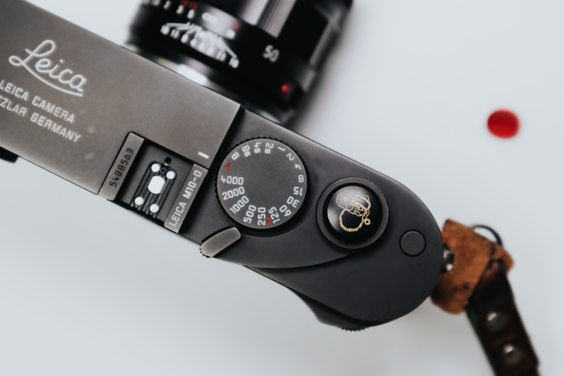 제가 사용 중인 라이카 M-10D에 결합한 모습입니다. 블랙 크롬 모델에 역시 잘 어울립니다. 이전에 사용하던 빨간색 버튼이 포인트가 됐다면 블랙 컬러의 산타 릴리즈 버튼은 마치 원래 셔터 버튼인 듯한 일체감이 장점입니다. 거기에 골드 컬러가 있어 적절한 포인트가 됩니다.