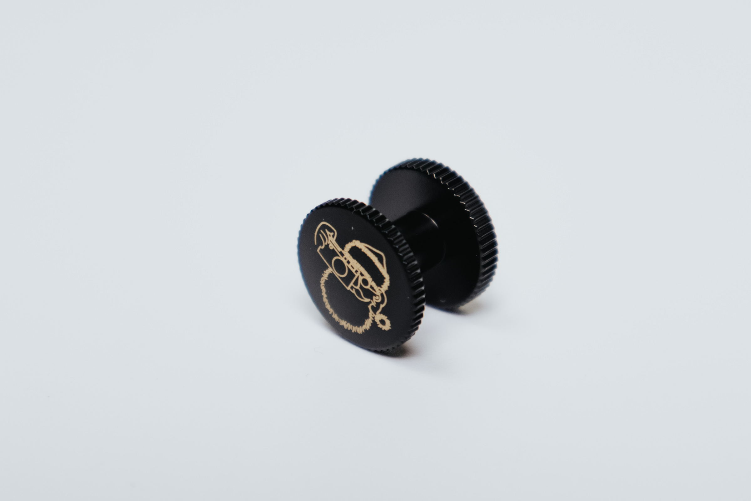 버튼은 무광 블랙 컬러로 라이카 블랙 크롬 카메라와 잘 어울리는 색상입니다. 미세하게 볼록한 실루엣, 주변부 마감이 일반 모델과 비슷합니다. 다른 점은 역시 산타 일러스트. 크리스마스 시즌 제품인만큼 라인 컬러는 금색으로, 안경 쓴 산타가 라이카 M 카메라를 들고 있는 모습입니다. 그림은 깊이가 깊지 않지만 음각으로 새겨진 것으로 보입니다. 단순 프린팅보다 색이 오래 가겠죠.