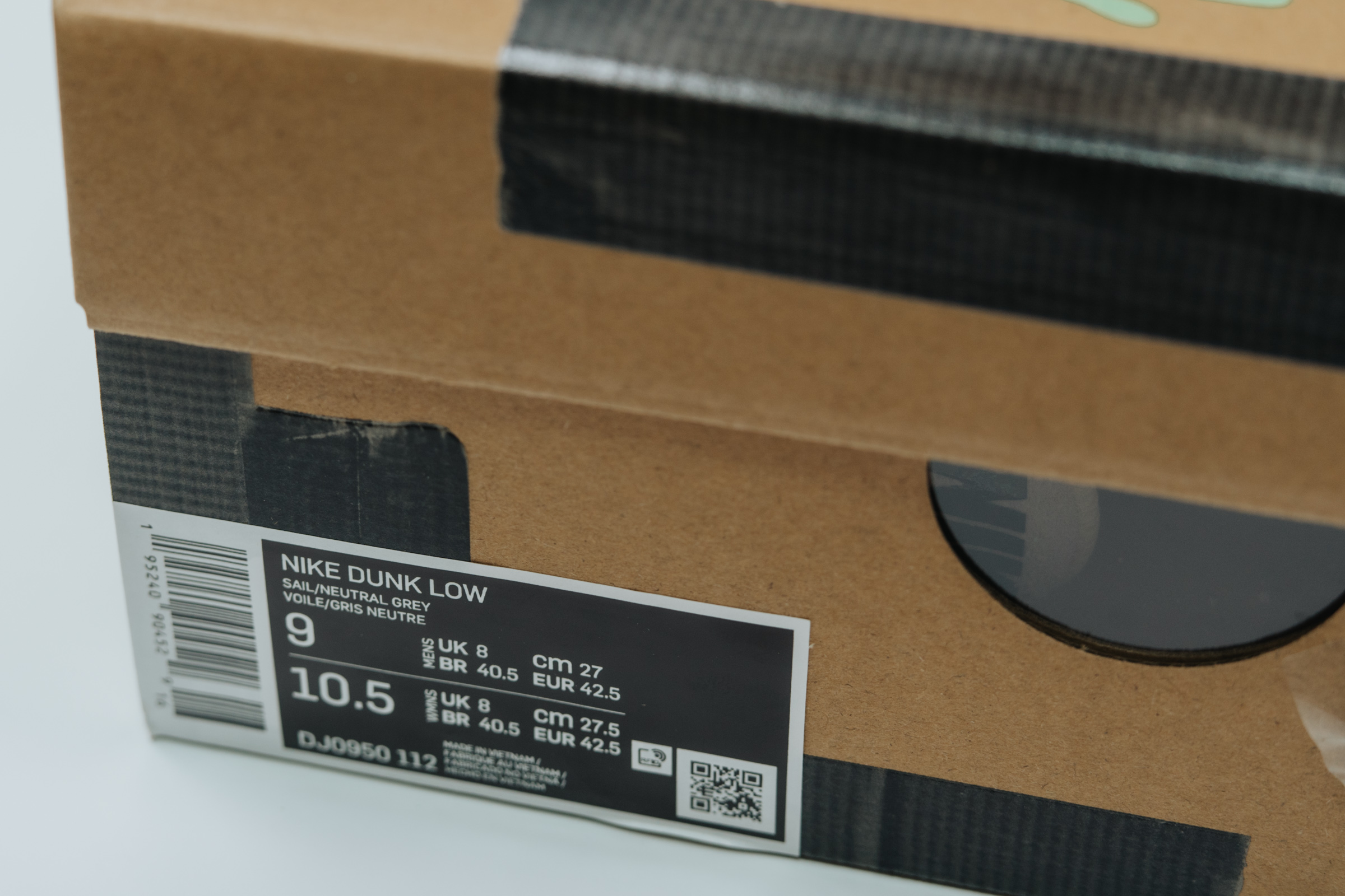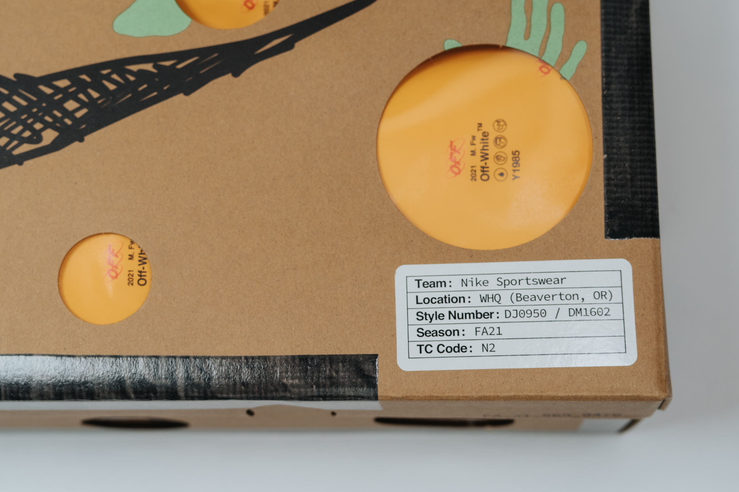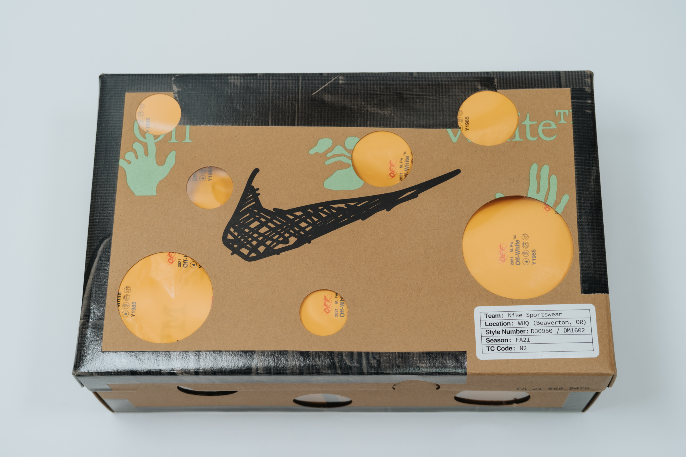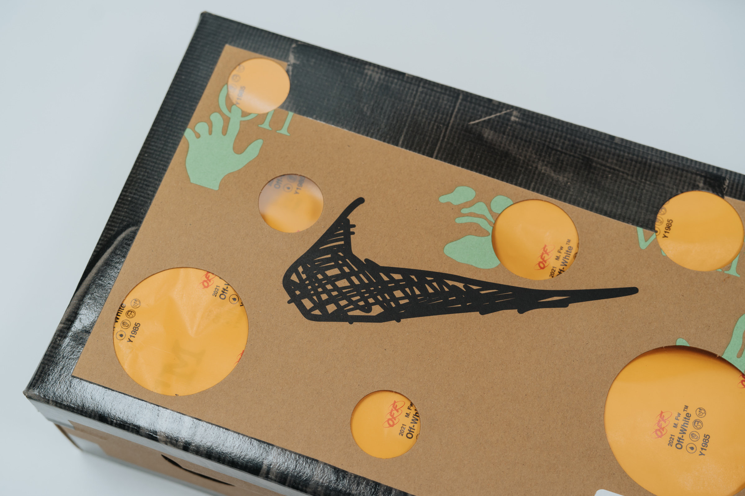 개인적으로는 스니커보다 박스 디자인이 더 기억에 남을 정도로 매력적입니다. 박스에 동그란 구멍을 뚫은 것은 기존 나이키 x 오프화이트 협업 모델과 같지만 나이키 스우시를 펜으로 엉성하게 그려 놓은 프린팅, 박스 주변을 검정색 테이프로 두른 디테일 등이 재미있습니다. 박스만 해도 마니아들에겐 소장 가치가 충분할 것 같아요.