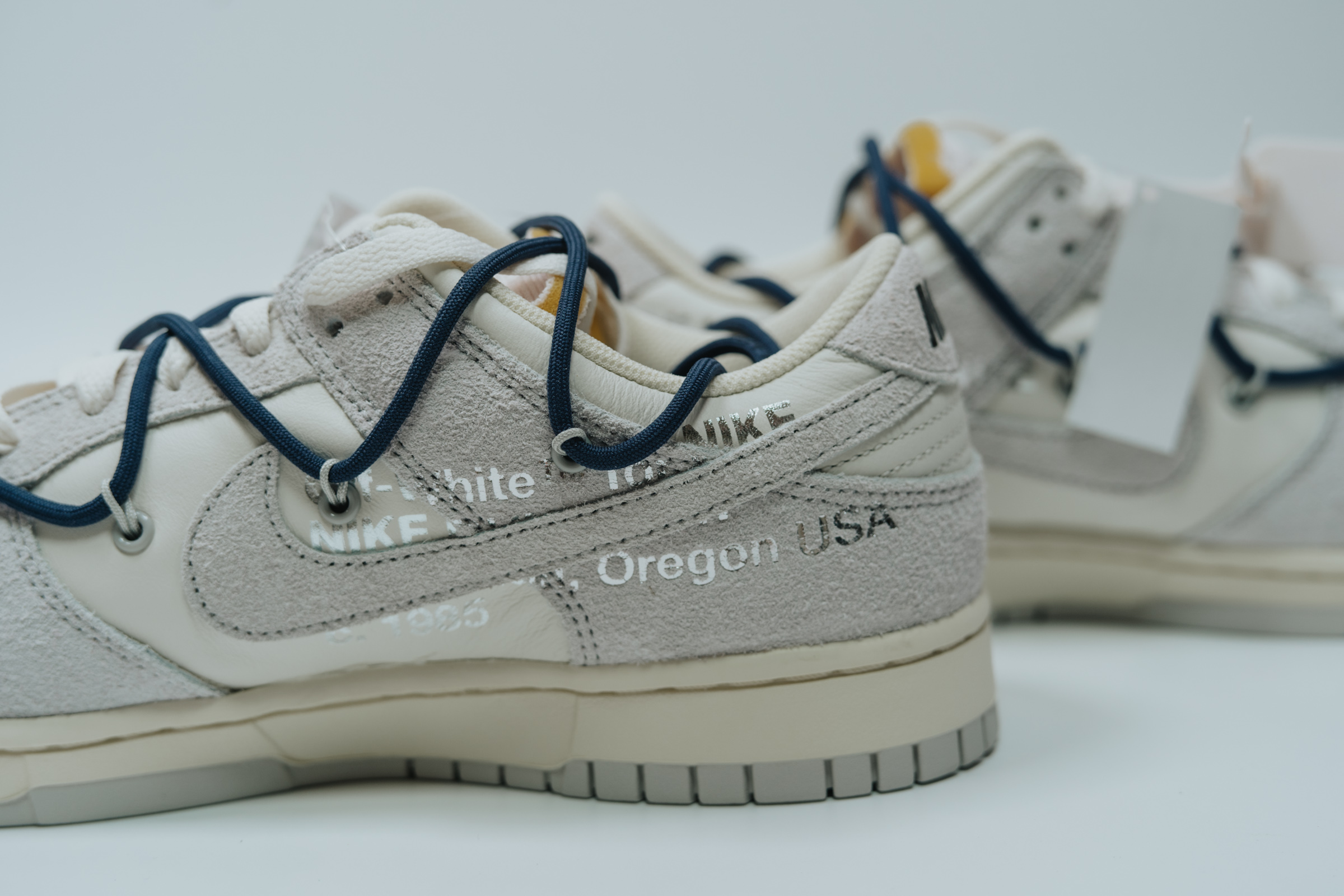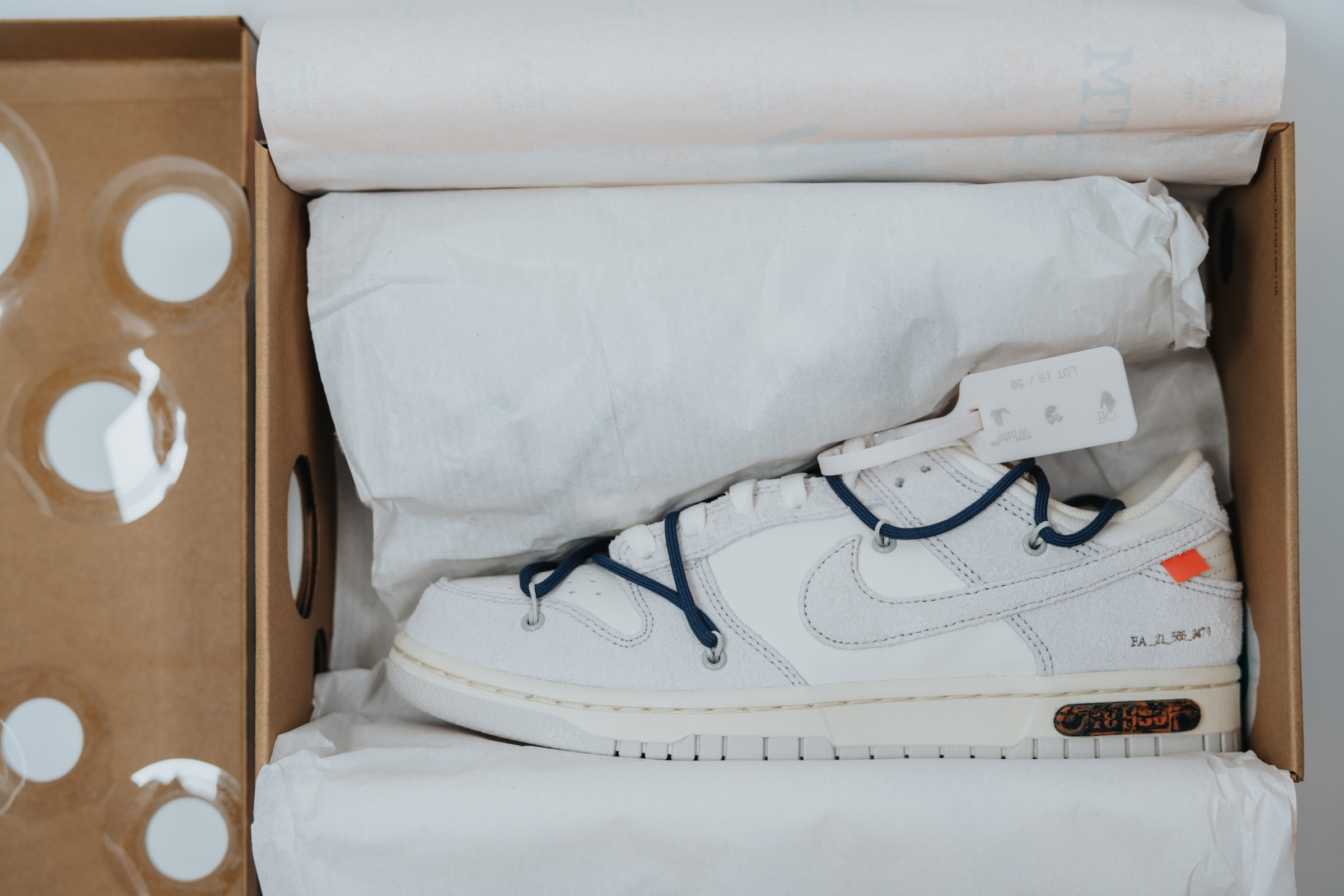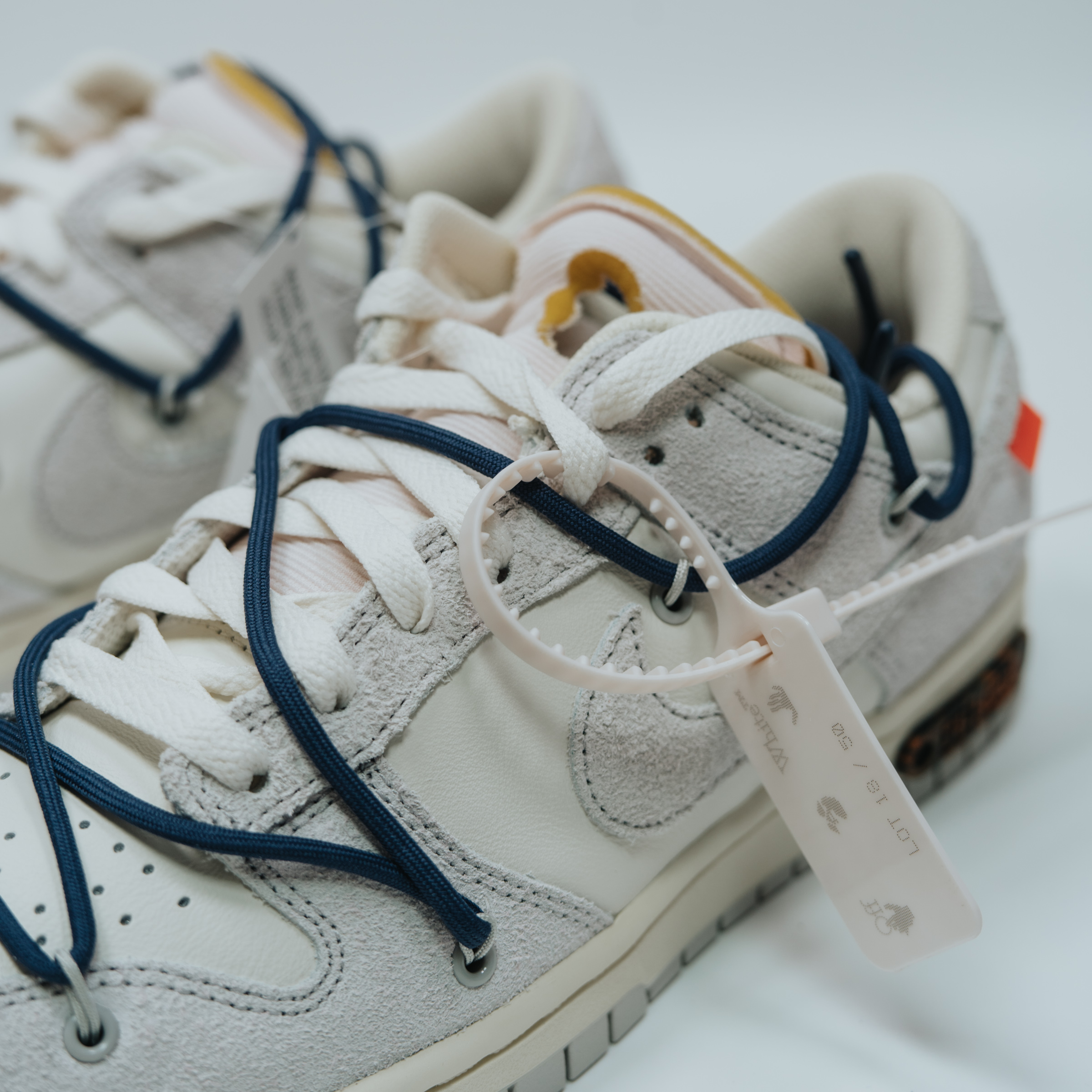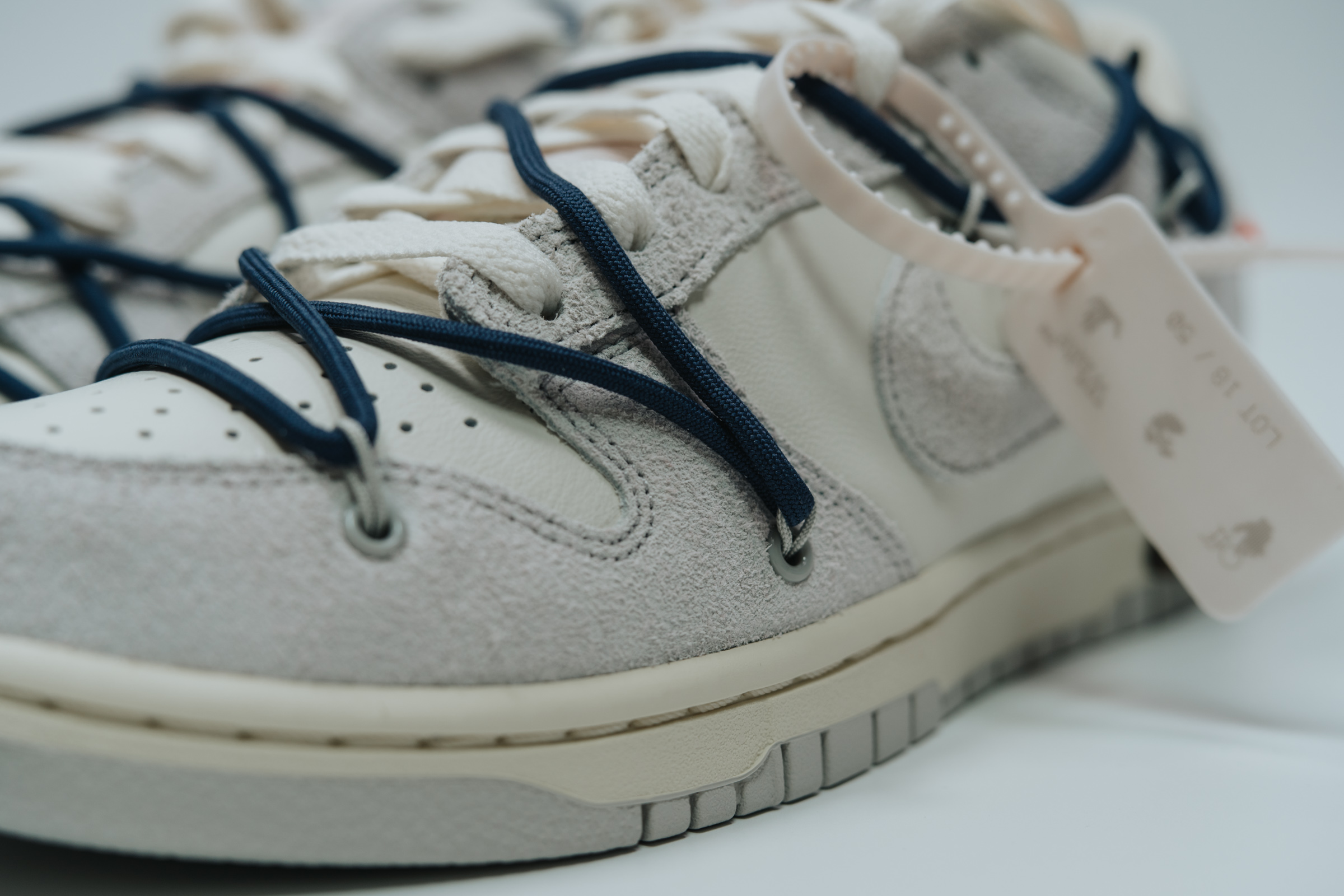 속지를 들어 올리면 보이는 주인공. 흰색과 회색의 심플한 배색에 겉면을 두른 남색 끈으로 포인트를 줬습니다. 덕분에 다른 모델들보다 호불호가 덜할 것 같아요. 이전 나이키 x 오프화이트 협업 모델들 중 일부는 배색과 디테일이 좀 과한 것들도 있었는데 이 덩크 로우 모델 정도가 적절히 유니크한 느낌이라 마음에 듭니다.