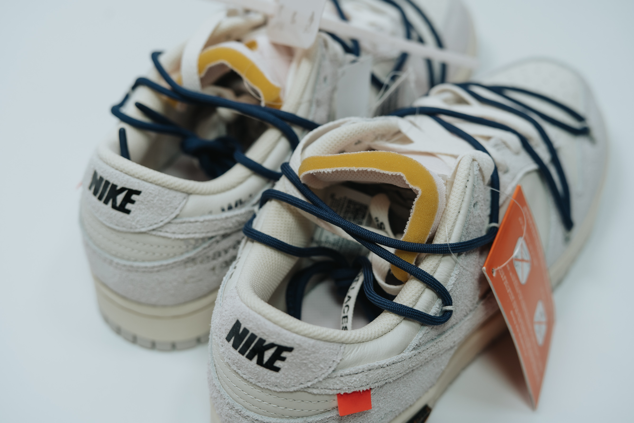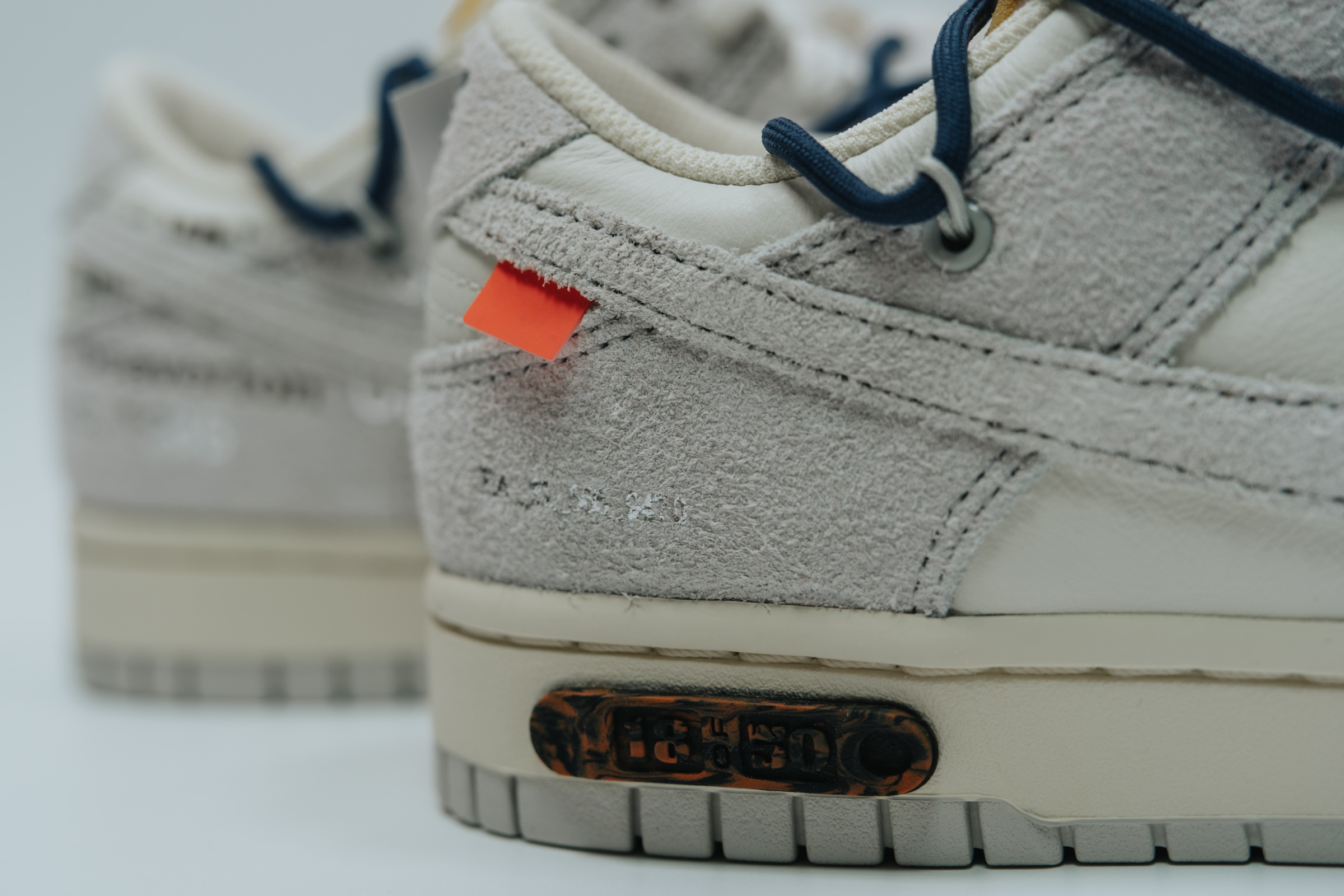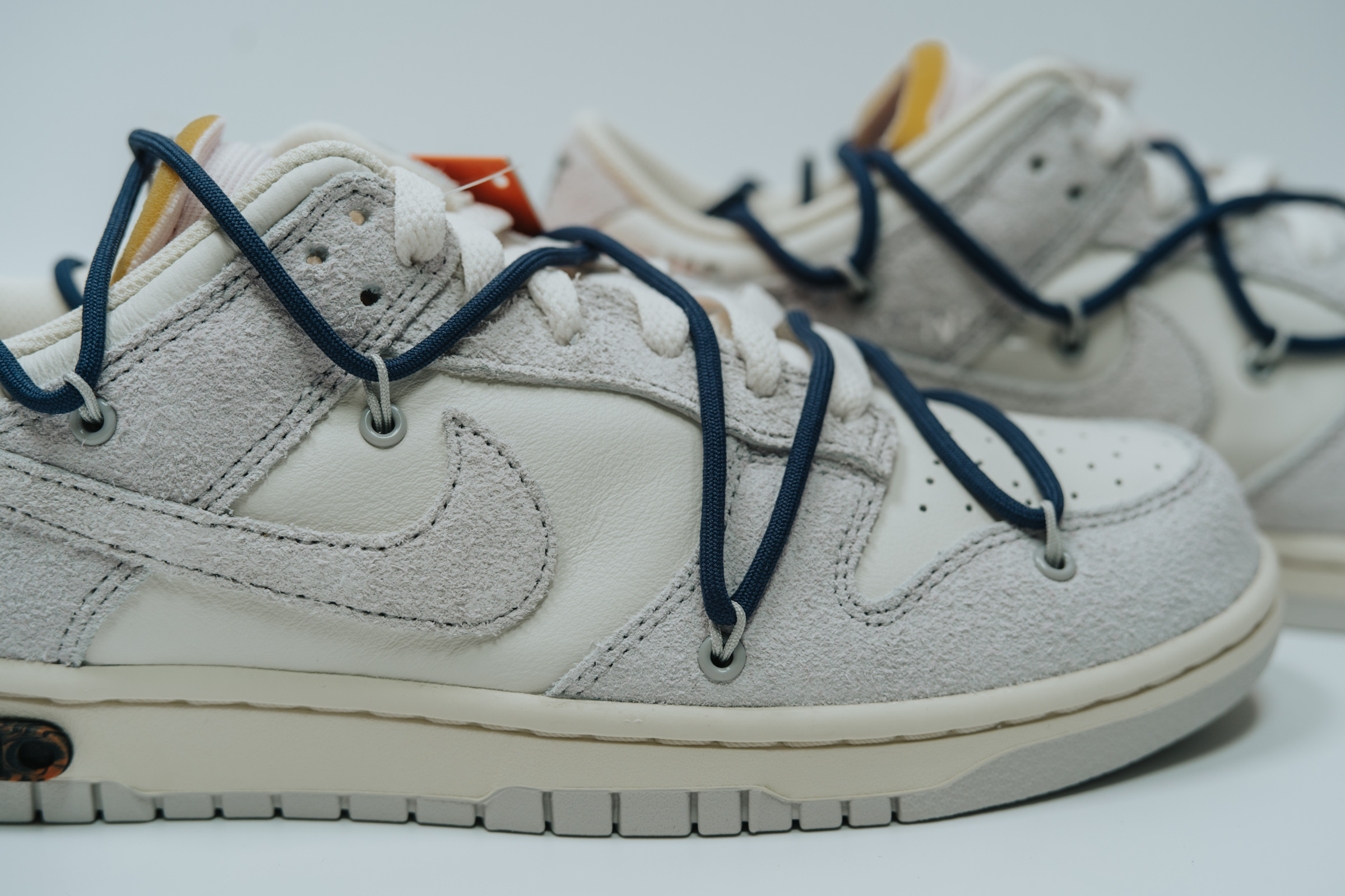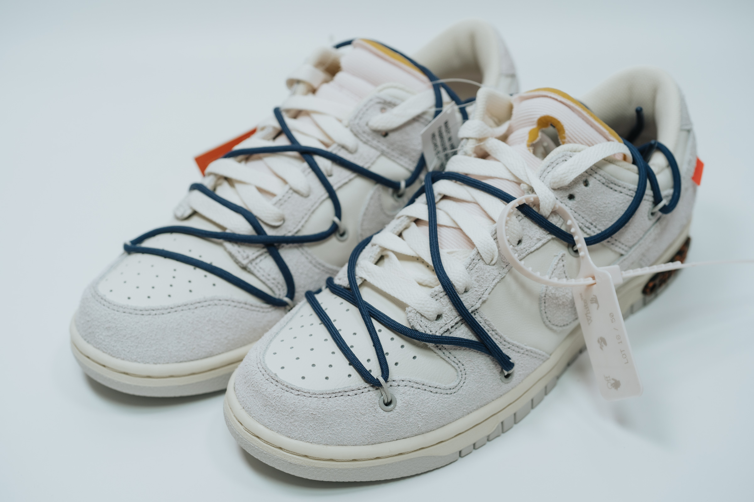 속지를 들어 올리면 보이는 주인공. 흰색과 회색의 심플한 배색에 겉면을 두른 남색 끈으로 포인트를 줬습니다. 덕분에 다른 모델들보다 호불호가 덜할 것 같아요. 이전 나이키 x 오프화이트 협업 모델들 중 일부는 배색과 디테일이 좀 과한 것들도 있었는데 이 덩크 로우 모델 정도가 적절히 유니크한 느낌이라 마음에 듭니다.