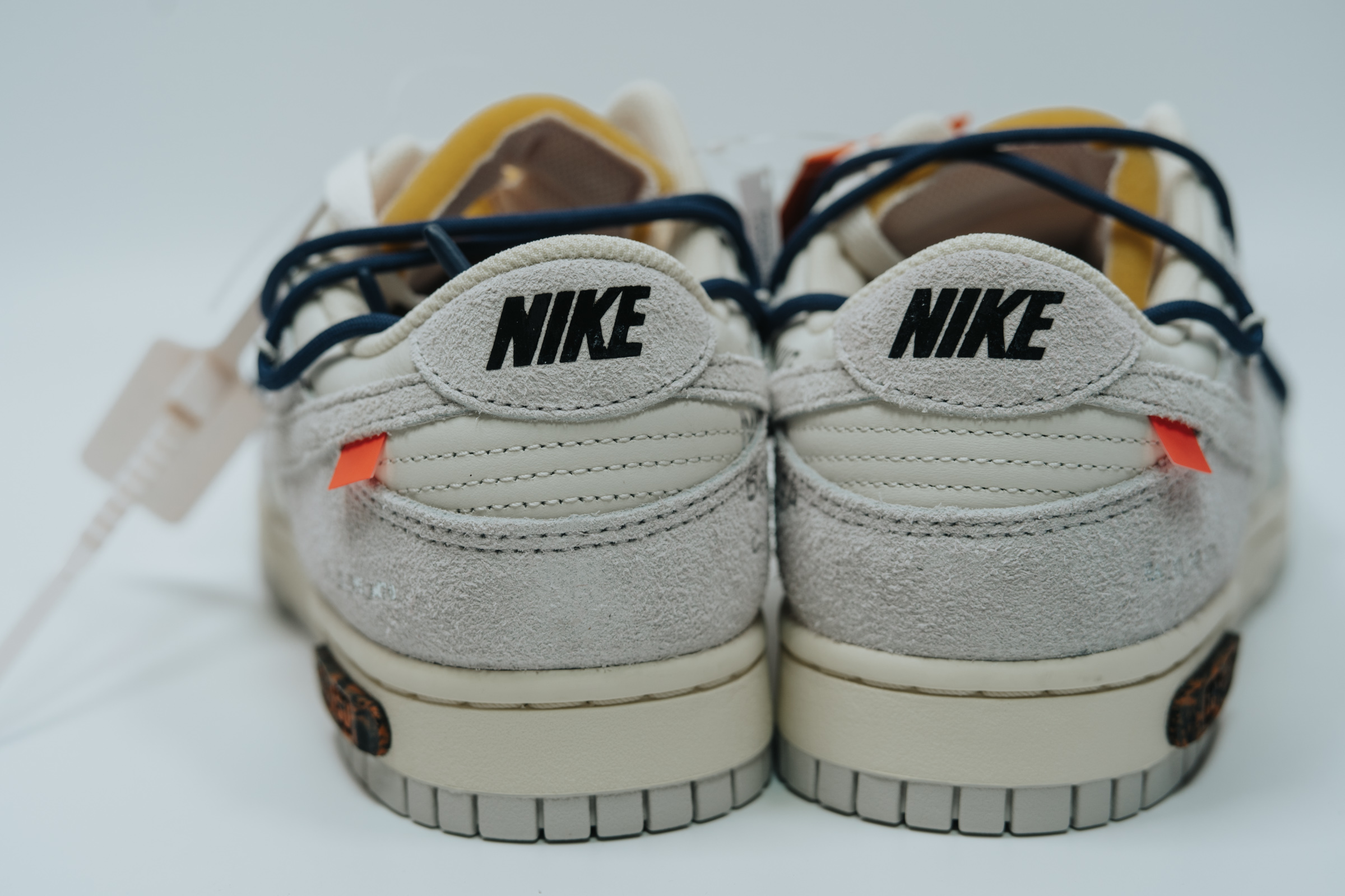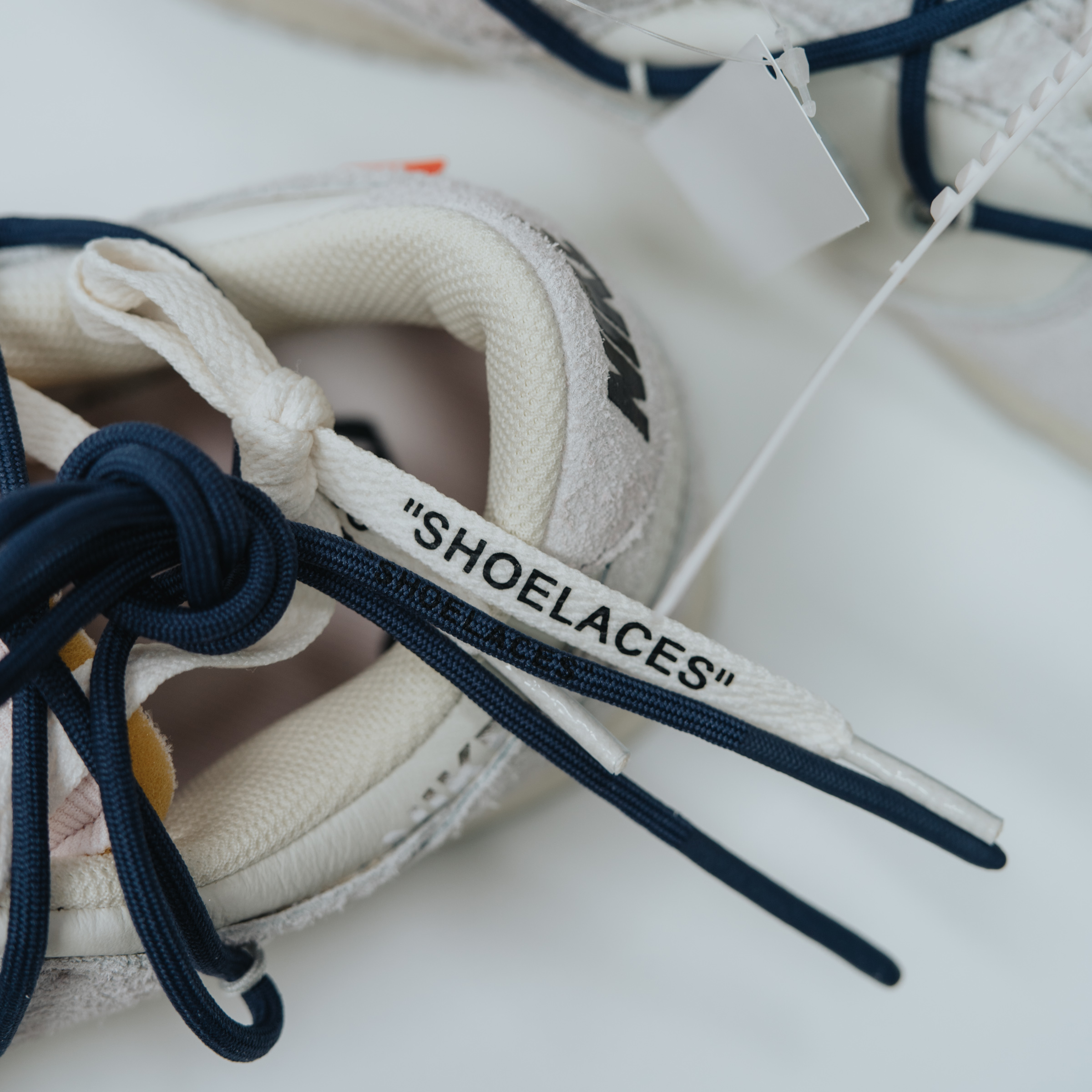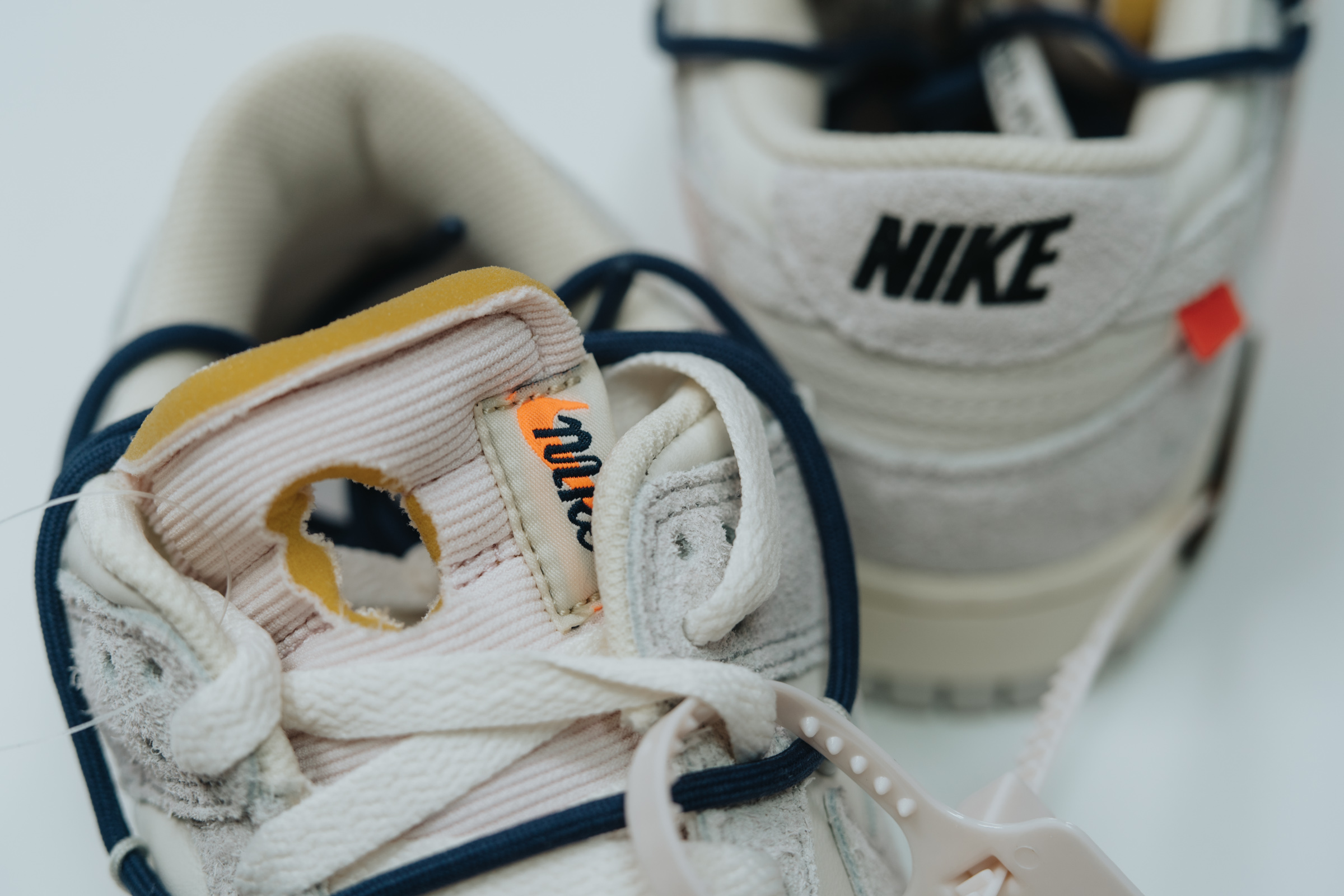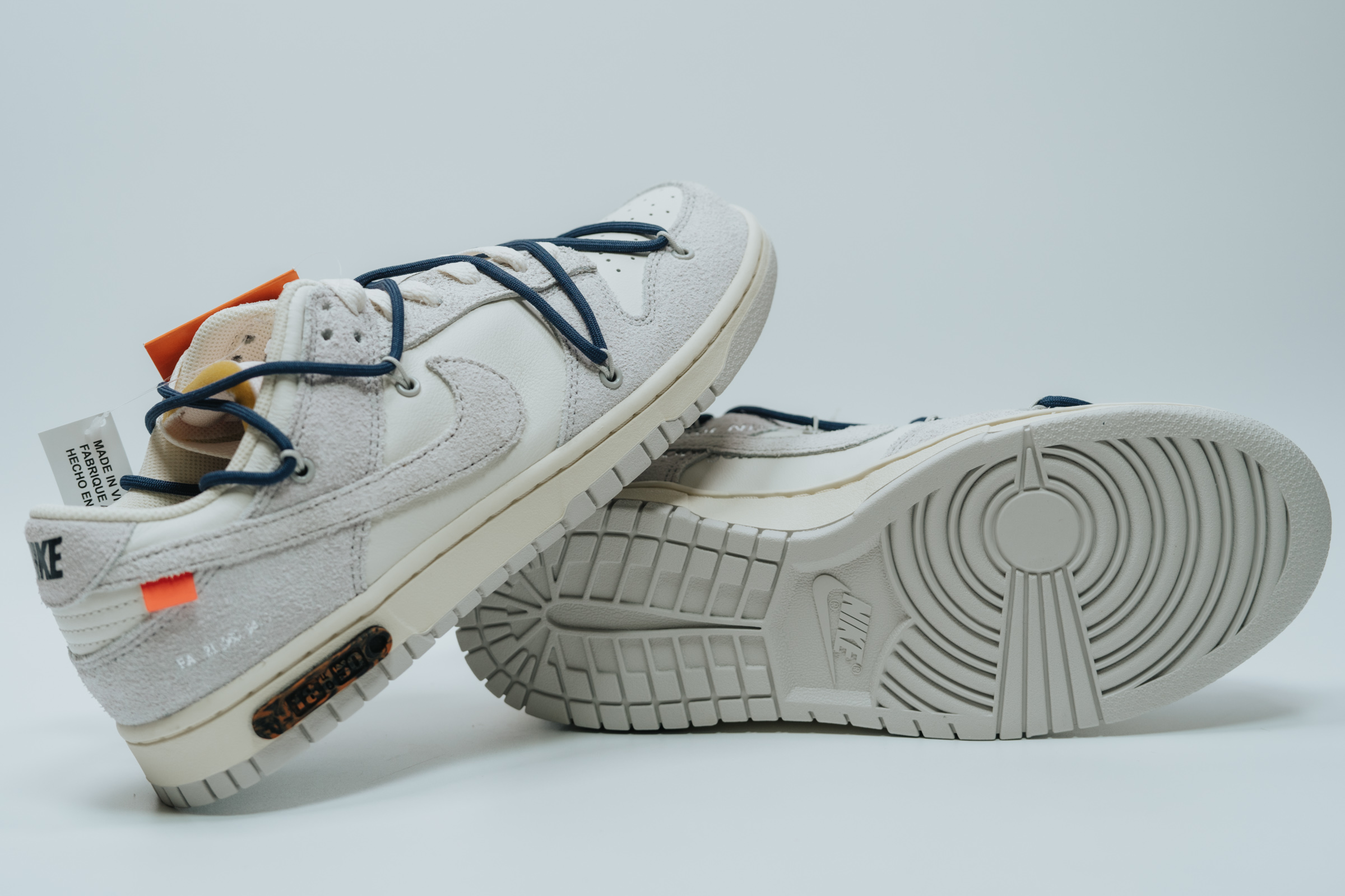 속지를 들어 올리면 보이는 주인공. 흰색과 회색의 심플한 배색에 겉면을 두른 남색 끈으로 포인트를 줬습니다. 덕분에 다른 모델들보다 호불호가 덜할 것 같아요. 이전 나이키 x 오프화이트 협업 모델들 중 일부는 배색과 디테일이 좀 과한 것들도 있었는데 이 덩크 로우 모델 정도가 적절히 유니크한 느낌이라 마음에 듭니다.