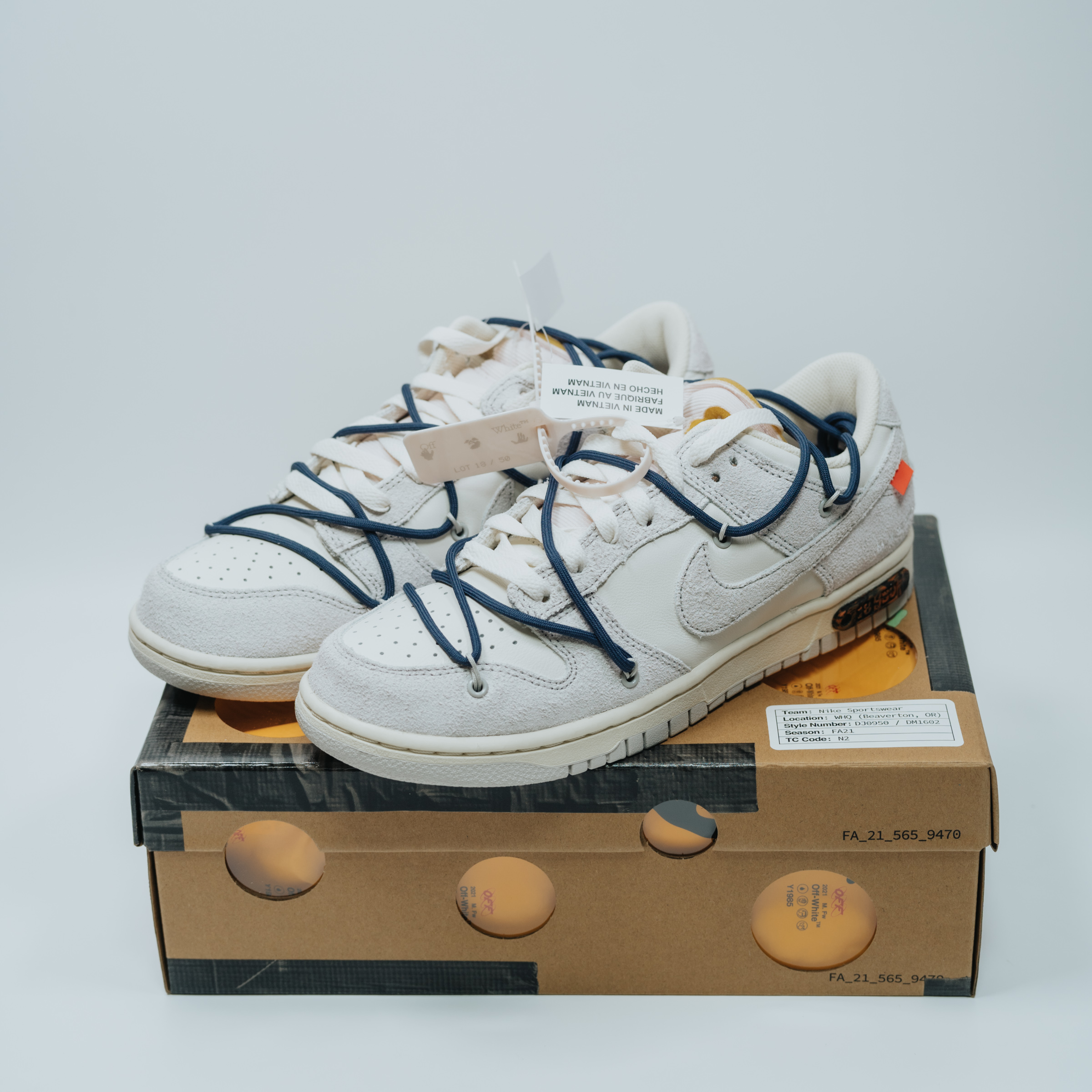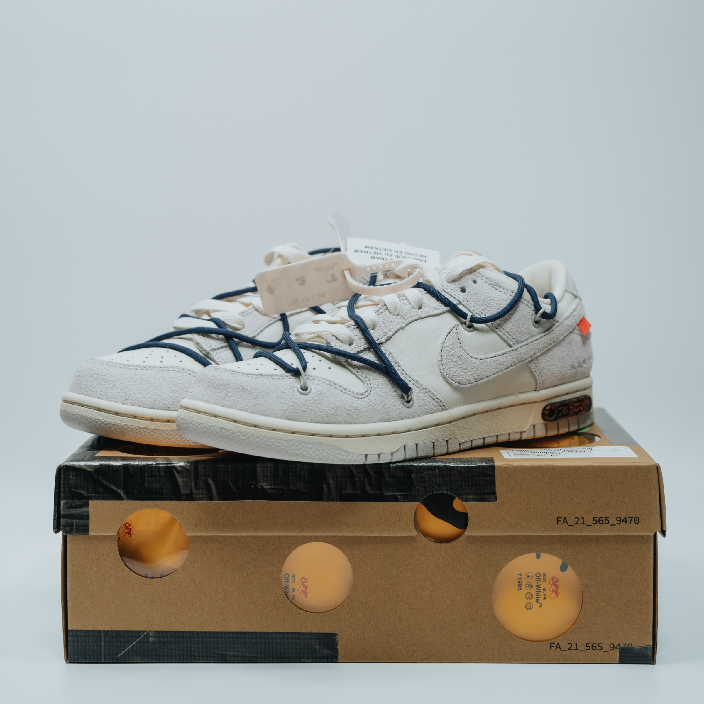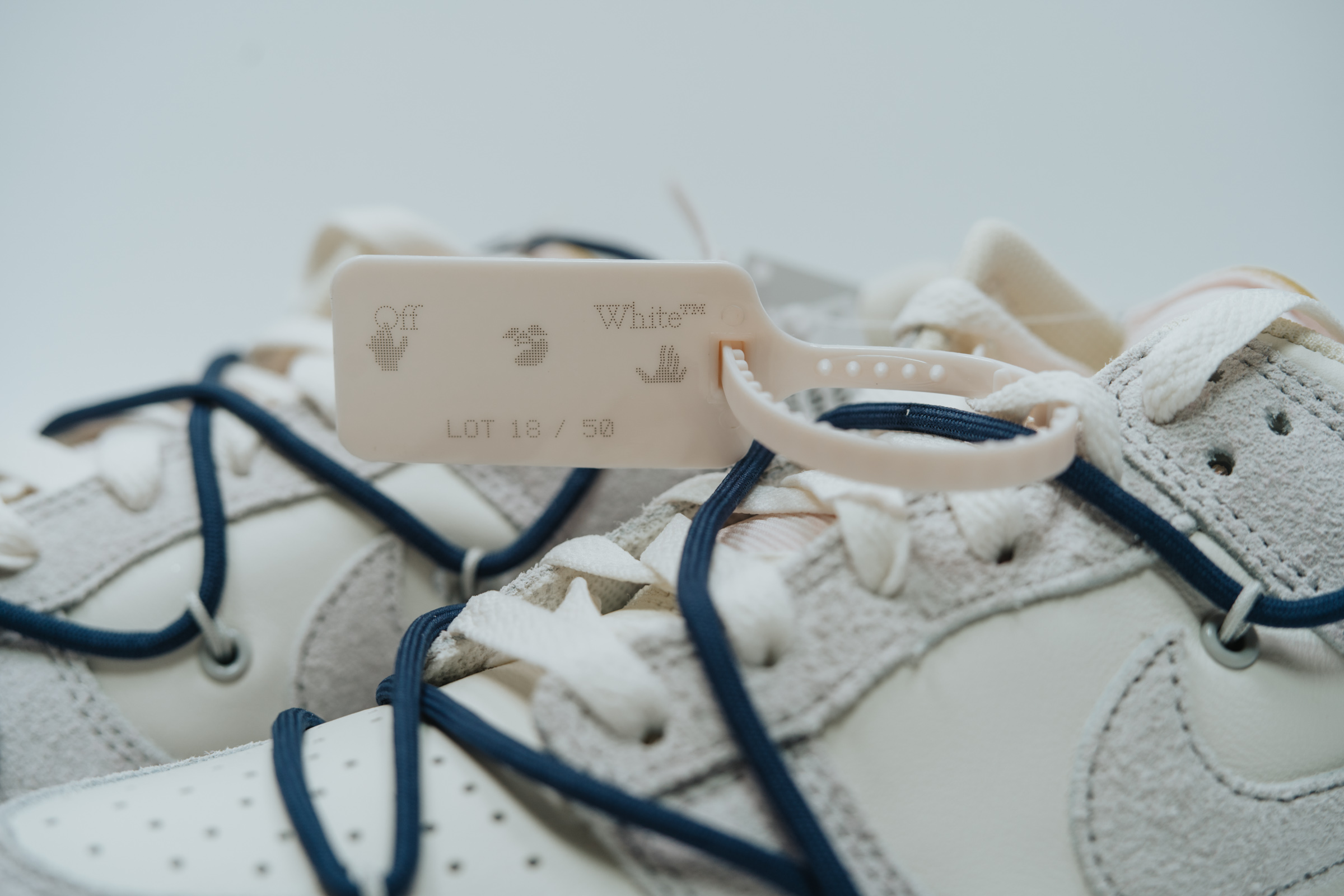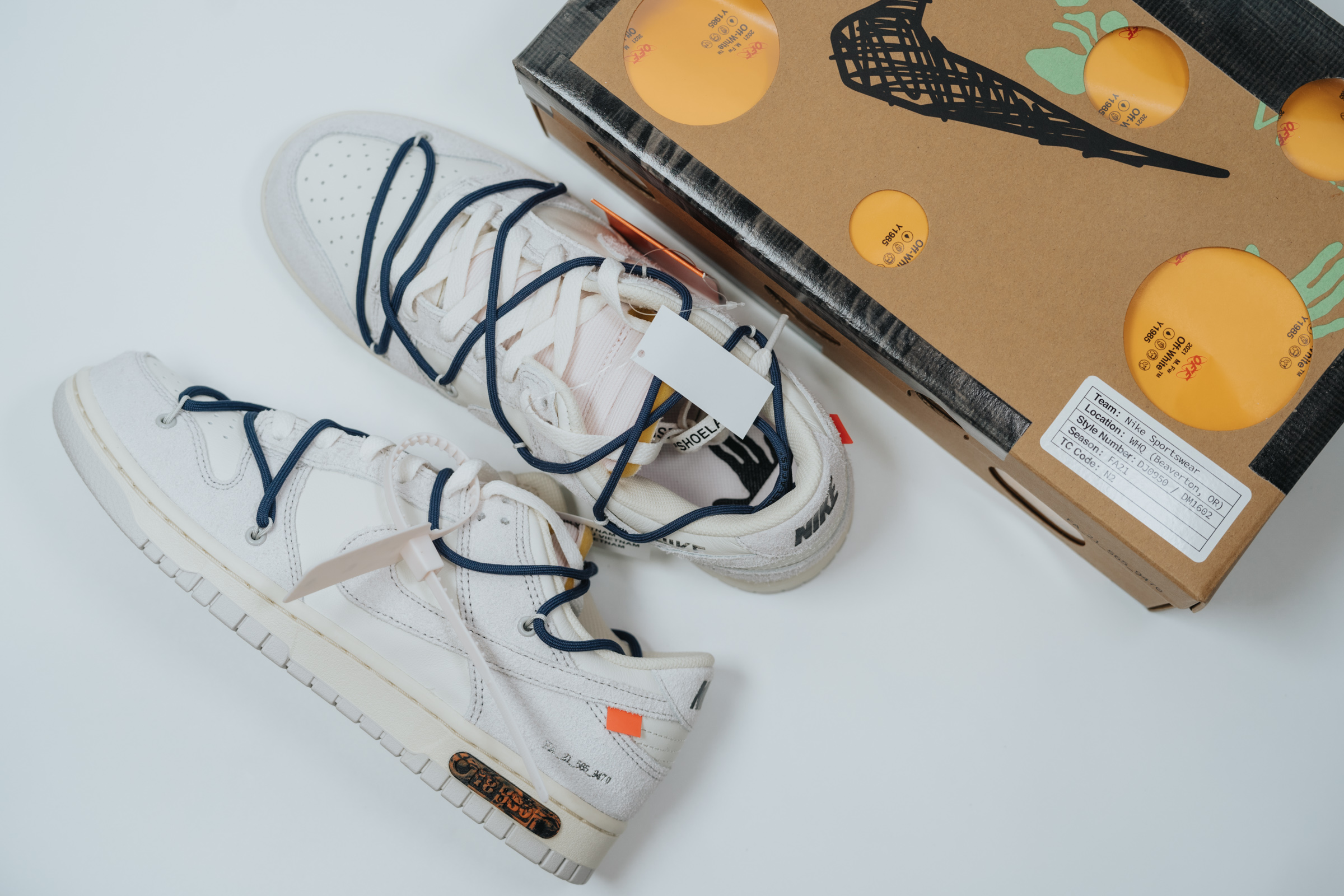 속지를 들어 올리면 보이는 주인공. 흰색과 회색의 심플한 배색에 겉면을 두른 남색 끈으로 포인트를 줬습니다. 덕분에 다른 모델들보다 호불호가 덜할 것 같아요. 이전 나이키 x 오프화이트 협업 모델들 중 일부는 배색과 디테일이 좀 과한 것들도 있었는데 이 덩크 로우 모델 정도가 적절히 유니크한 느낌이라 마음에 듭니다.
