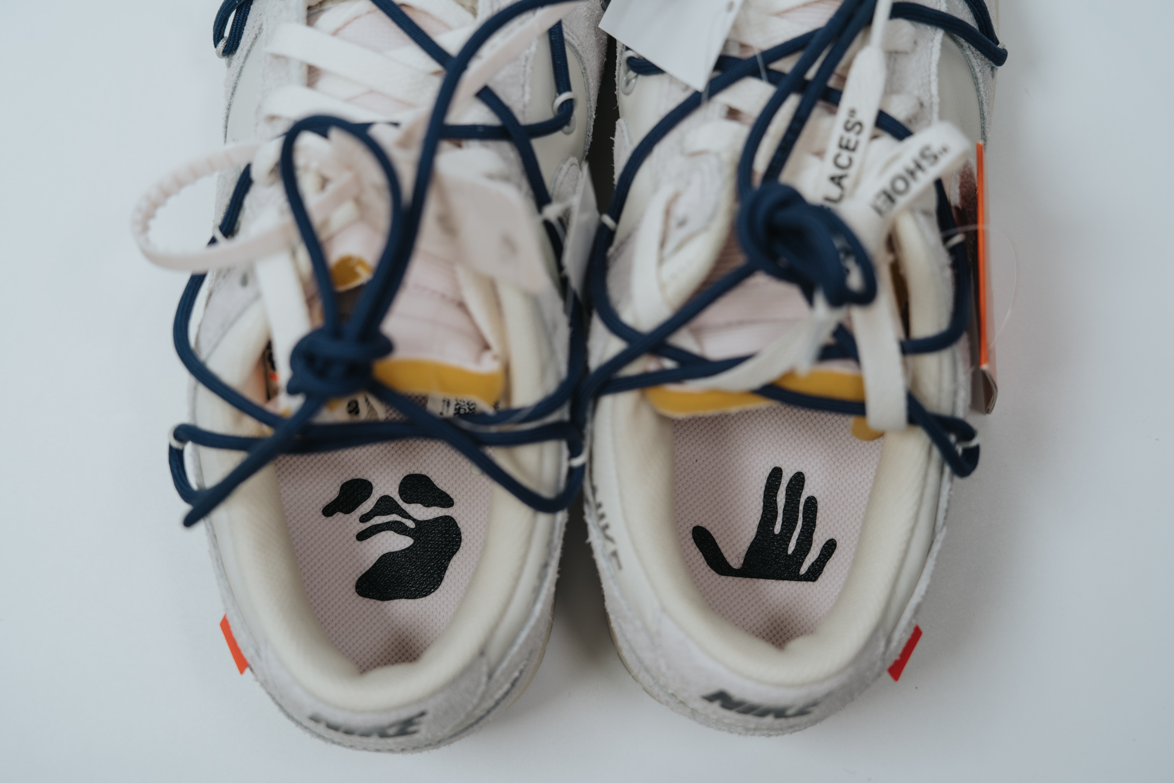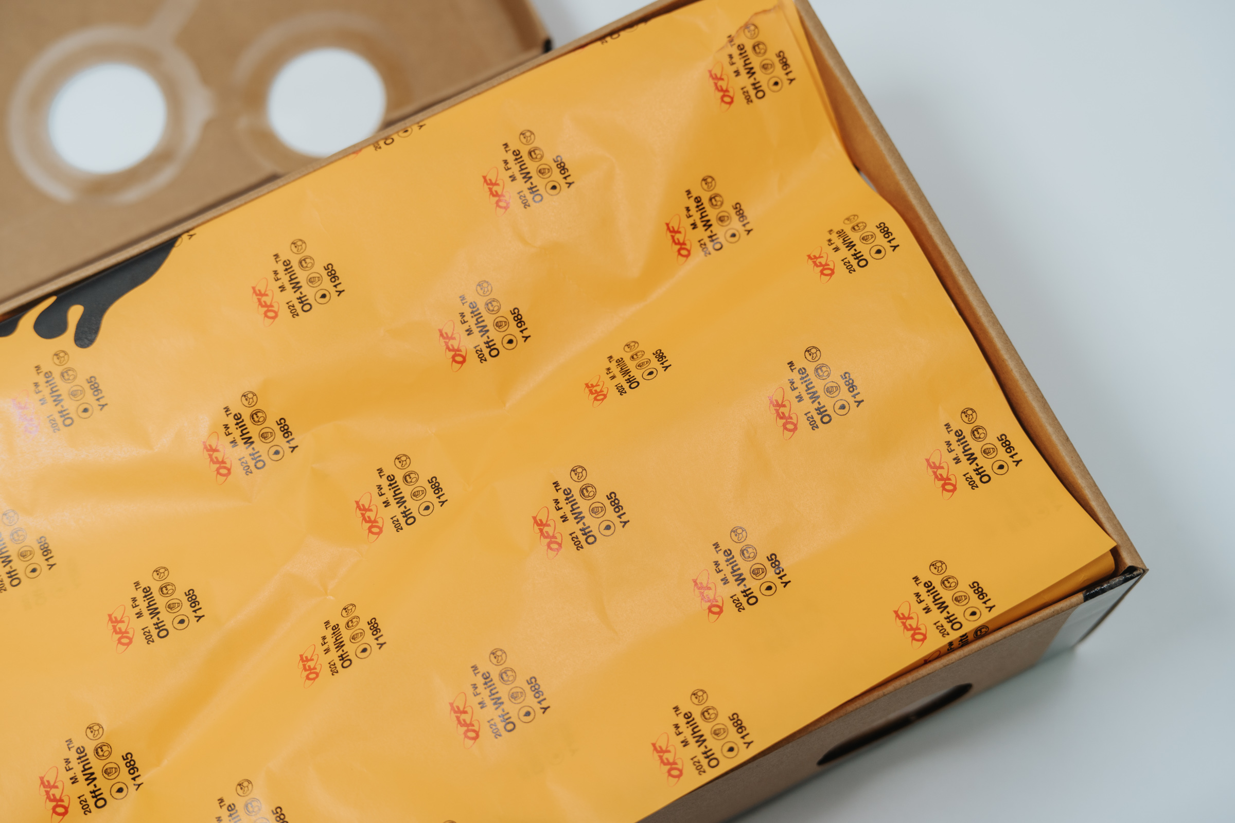 박스 뚜껑의 구멍을 통해 미리 보았던 노란색 속지. 오프화이트의 로고가 프린팅 되어 있습니다. 이렇게 한정판 스니커의 패키지를 열어볼 때면 신발보다 오히려 이런 속지를 더 조심히 다루게 됩니다. 찢어지기 쉬운 이 속지에 관한 아픈 사연들을 여기저기서 듣기도 했고 몇 번은 실제로 겪기도 했거든요.