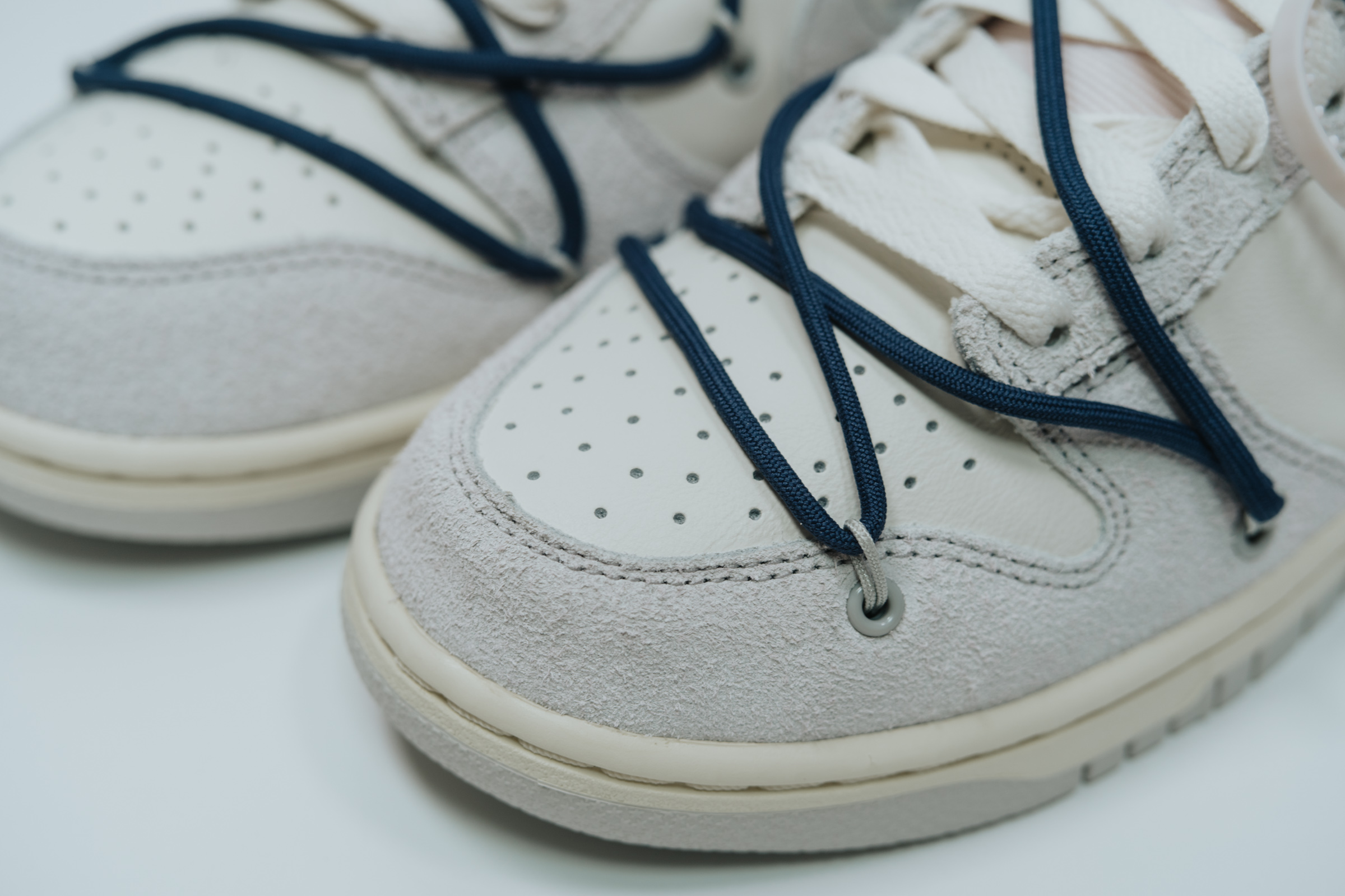 신발을 끈으로 칭칭 감아 두른 듯한 이 디테일은 이전에 발매된 나이키 X 오프화이트 덩크 로우 모델에서 이미 선보인 바 있습니다. 다만 그 때는 녹색, 빨간색, 주황색 등 스니커 자체의 컬러가 과감해서 이 끈 디테일이 상대적으로 돋보이지 못했는데, 이번에는 흰색/회색의 깔끔한 바탕이라 남색 끈의 존재가 도드라집니다.