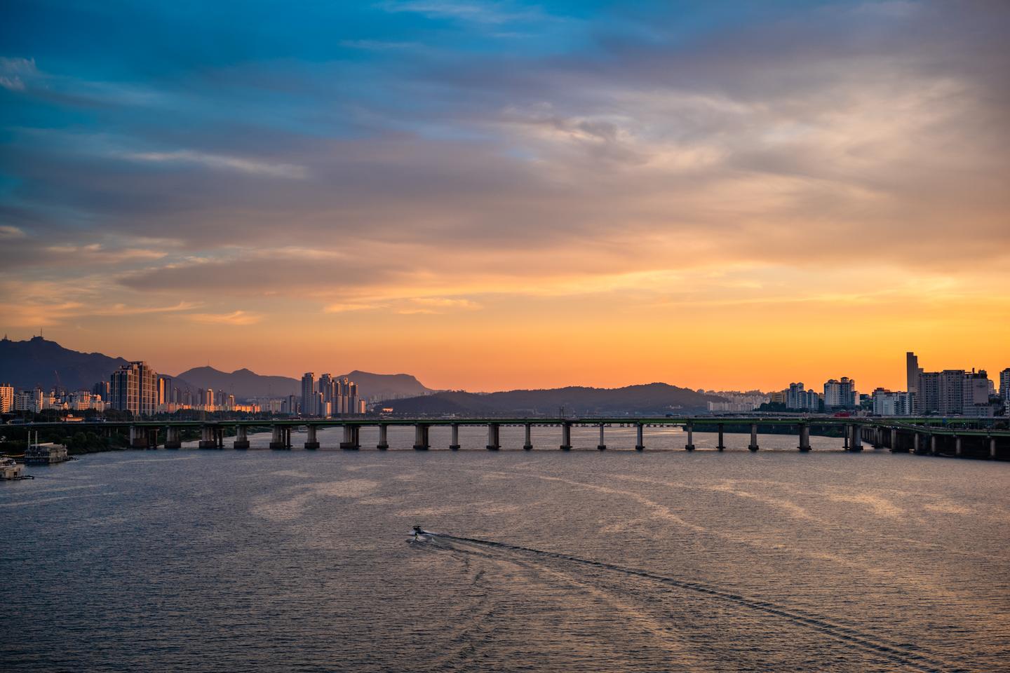 그리고 이 절정의 시간에 강 위를 가르며 여름을 만끽하는 사람들의 모습까지. 2021년 여름에 많은 장면들을 봤지만 이 날 본 하늘과 다리 위, 강물 위의 모습들이 가장 많은 수로 기억될 것 같습니다. 요즘 서울 여행하며 느낀 것은 생각보다 한강 위에서 여가를 즐기는 분들이 많다는 것입니다. 패들 보드와 웨이크보드, 요트 등.