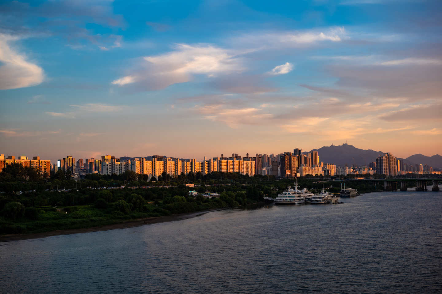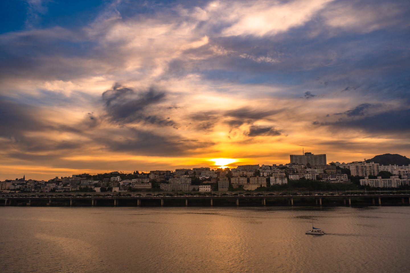 이 날 일몰 시간은 저녁 7시 50분이었어요. 압구정에서 다리 반대편으로 건너가 해가 지는 서쪽을 바라보며 걸었습니다. 일곱시가 넘으니 대기가 조금씩 금빛으로 물들어 햇살 닿는 지하철의 금속 표면이 달아올랐습니다. 강 위라 바람이 꽤 불어서 더위로 고생하진 않았지만, 기다렸던 시간이 다가오니 마음이 분주해졌습니다. 챙겨 간 카메라를 손에 꼭 쥐고 다리 위 좋은 위치를 찾았습니다.
